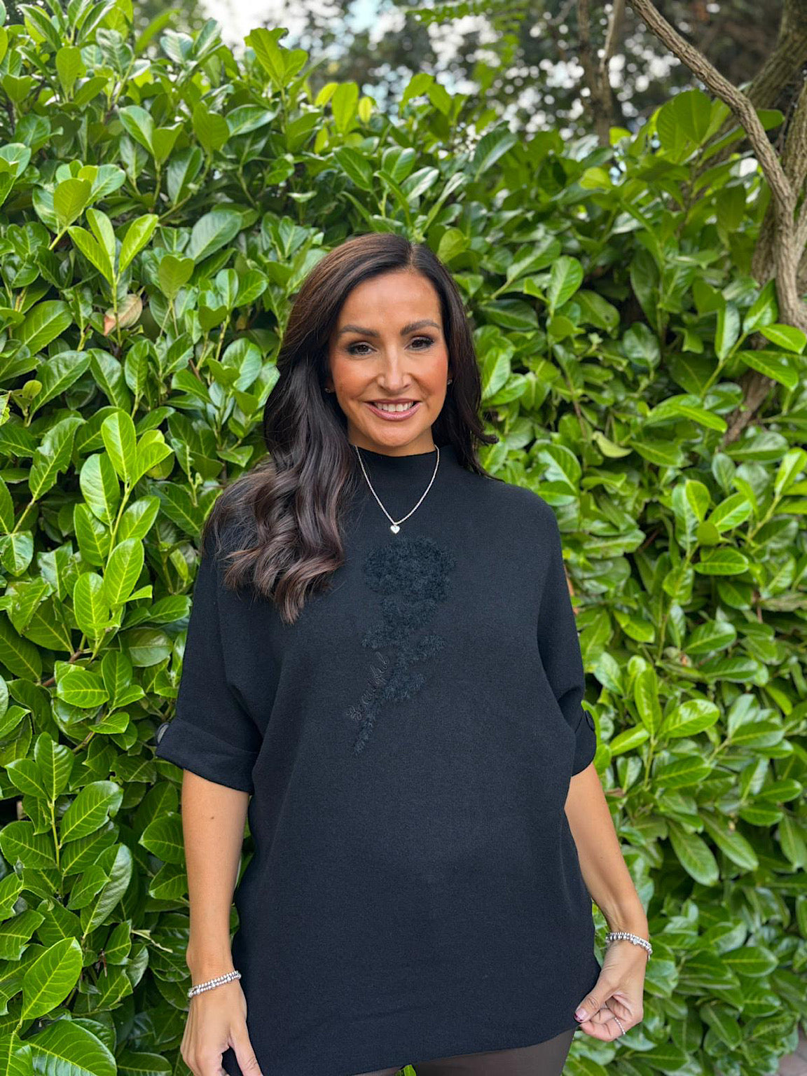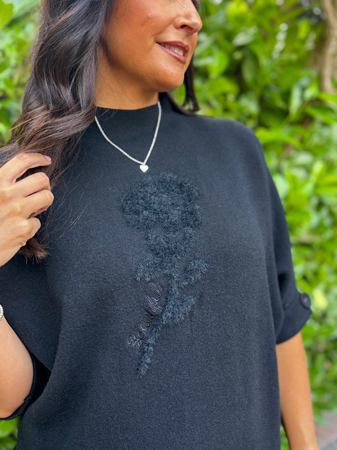 This soft knit top combines comfortable wear with delicate style, featuring a textured flower design and the embroidered word "beautiful" for a subtle, uplifting touch. Short sleeves are enhanced with a decorative button detail, adding a refined finish. Perfect for everyday wear, it offers both ease and elegance to your wardrobe.