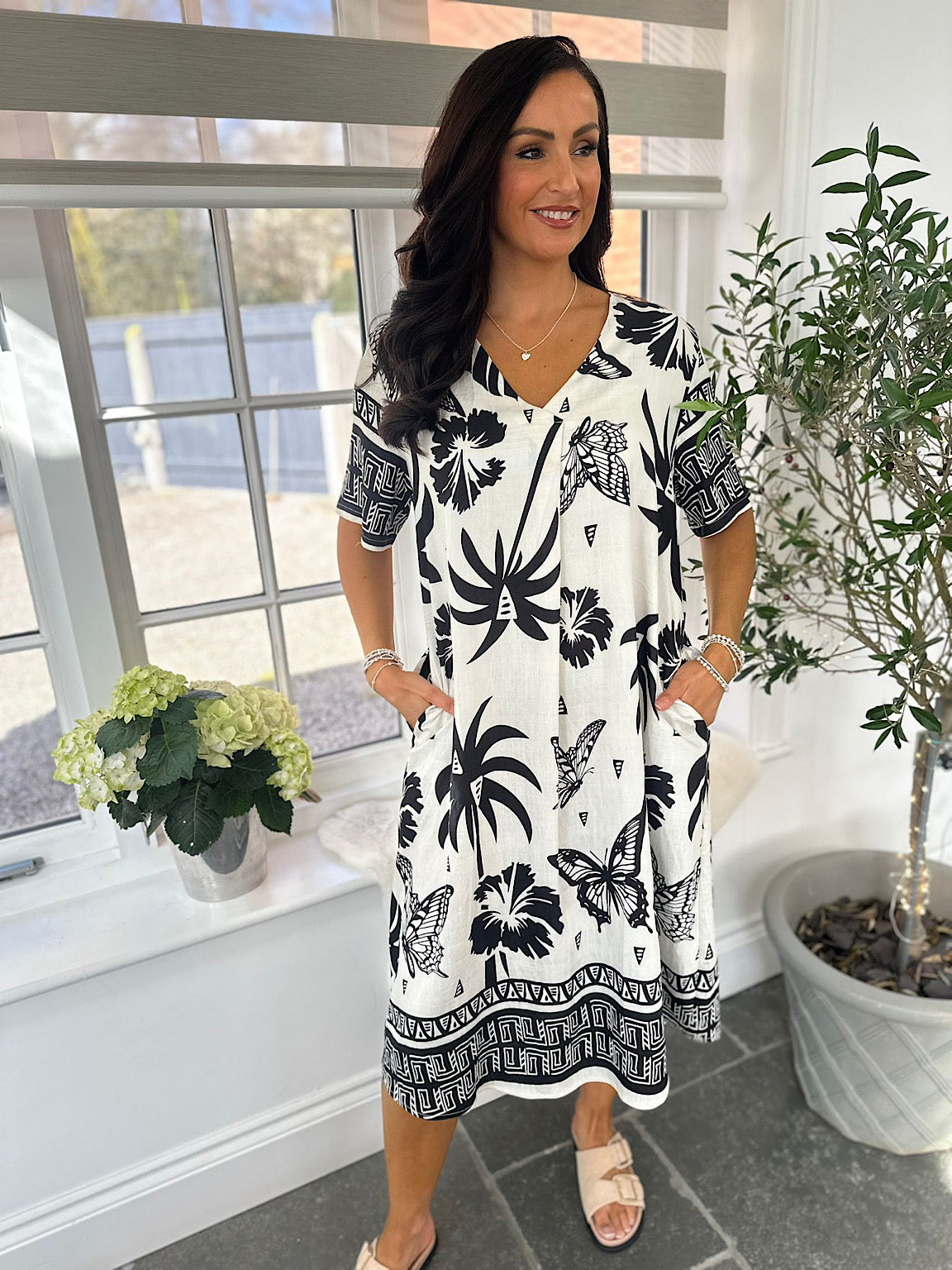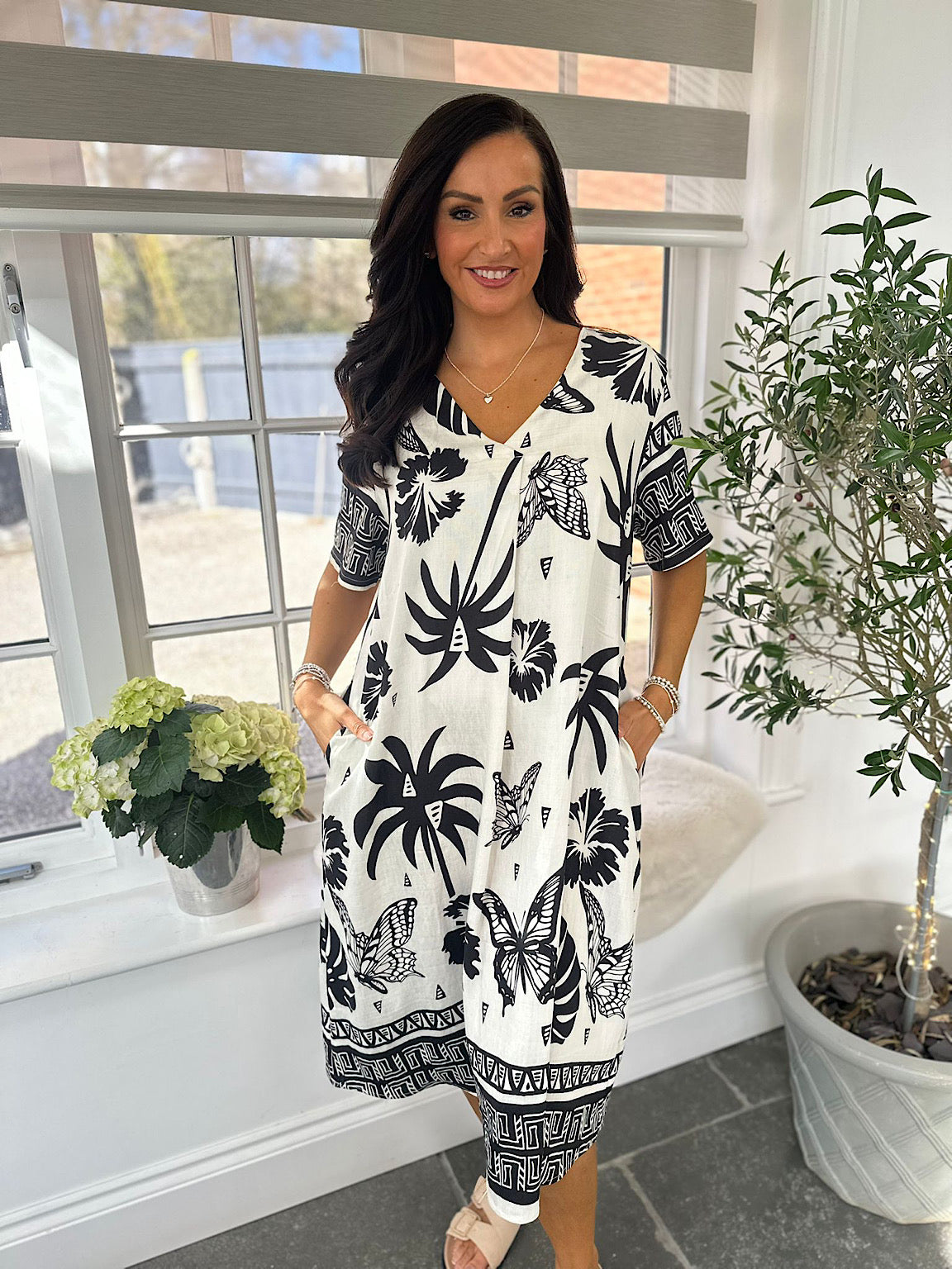 The Tropical Butterfly Dress Jodie combines effortless style with practical comfort. This lightweight piece features a slip-on design that requires no fussing, making it perfect for warm days and easy dressing. Functional pockets add everyday practicality, whilst the gorgeous tropical butterfly pattern brings a vibrant, eye-catching finish. Relaxed and flattering, it's a versatile wardrobe essential that works from casual outings to leisurely afternoons.