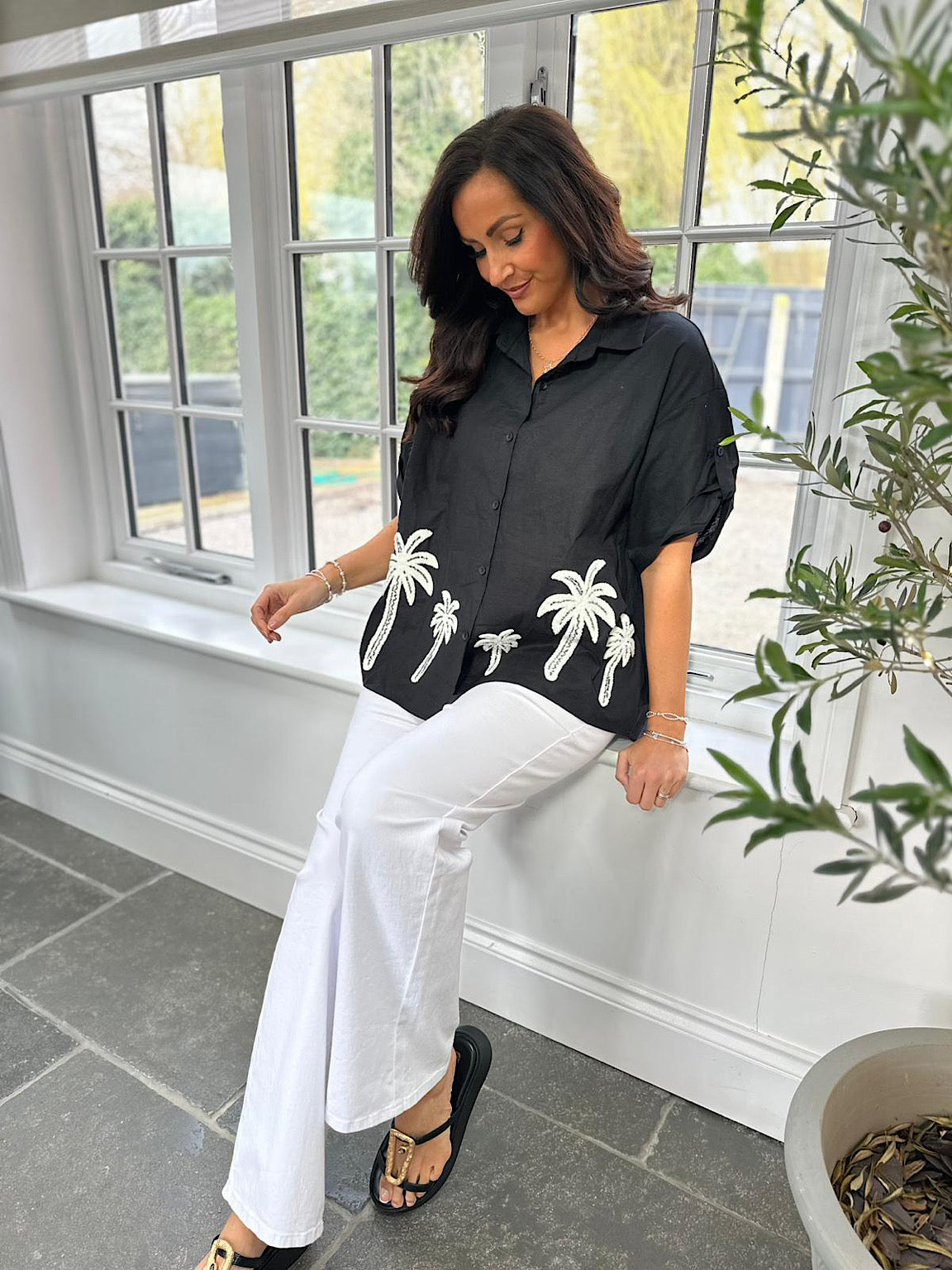 Elevate your wardrobe with this striking Tropical Palm Embroidered Blouse Anya. Crafted from a luxurious linen blend, this piece features an eye-catching tropical palm design rendered in textured boucle with shimmering silver sequin accents. The intricate embroidery adds depth and movement, making it perfect for both casual outings and special occasions. The breathable linen composition ensures comfort throughout the day, while the sophisticated embellishment elevates any ensemble.