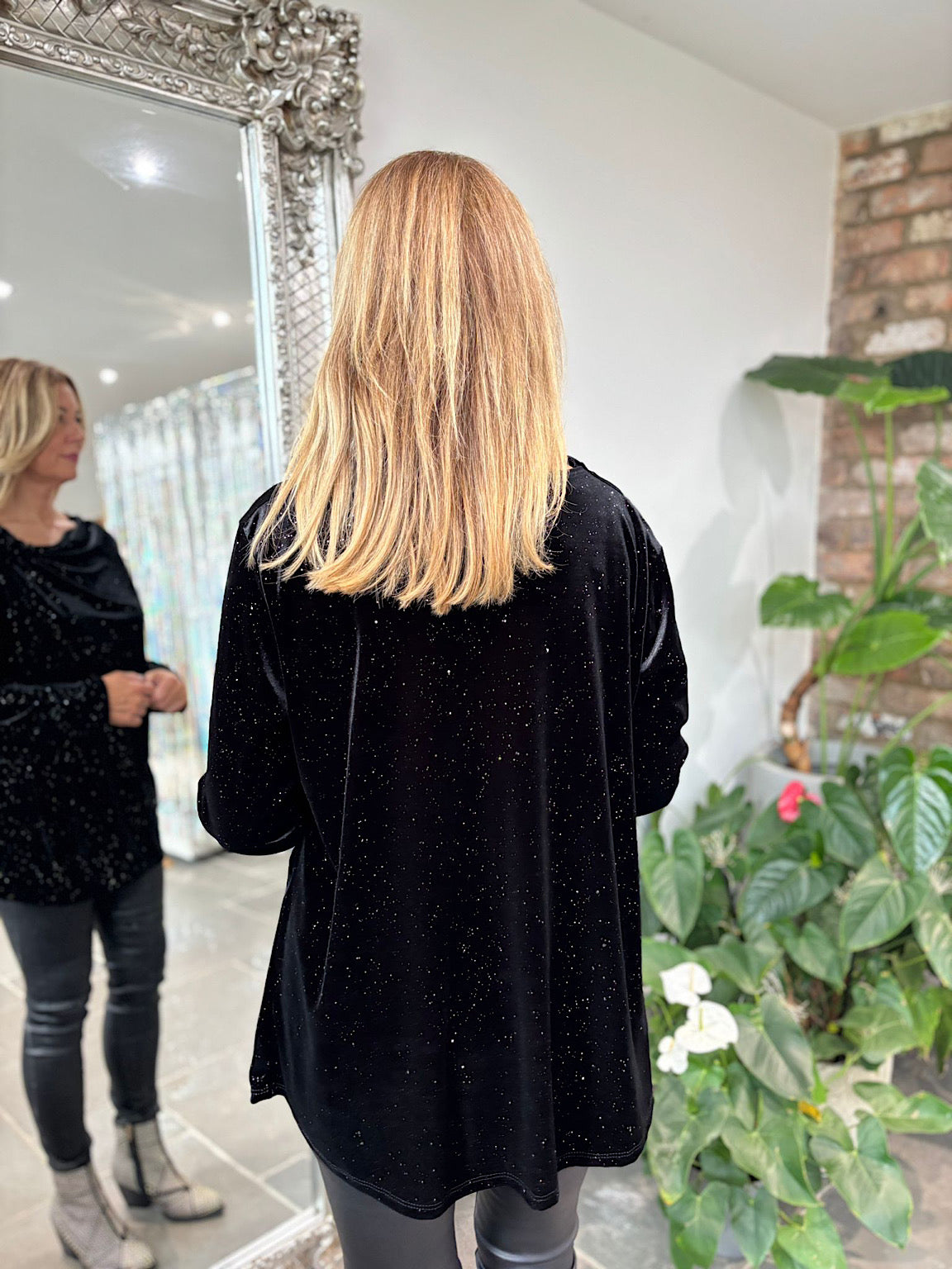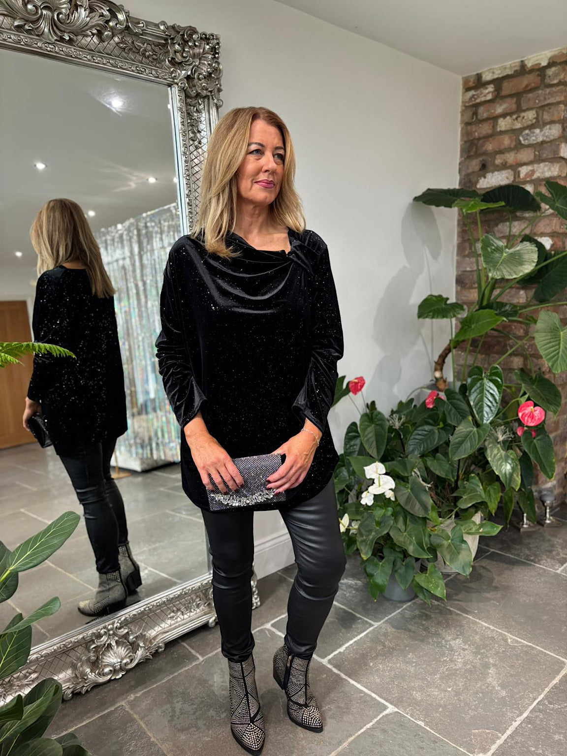 Experience comfort and style with the Velour Cowl Neck Sparkle Top Olivia. Crafted from soft velour, this long-sleeve top features a flattering cowl neck with elegant gathered detail, adding a touch of sparkle to your look. Perfect for cosy days or special occasions, it combines warmth with understated glamour effortlessly.