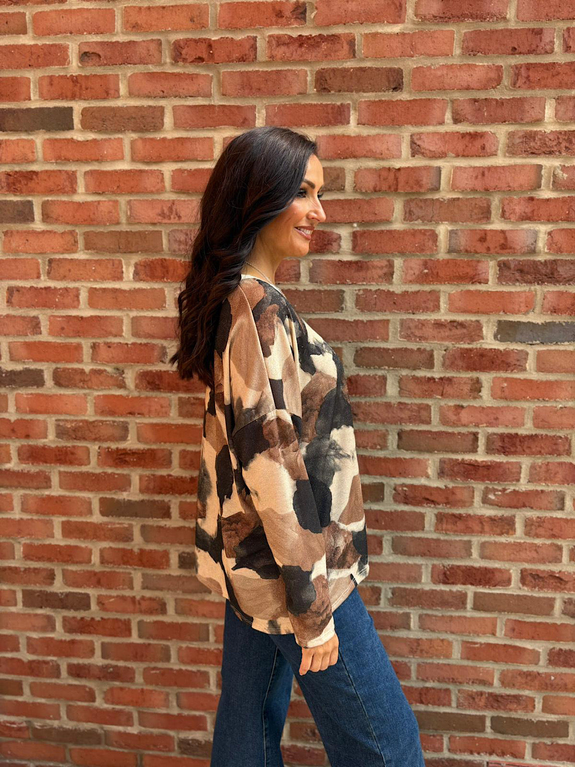 This elegant top features a delicate gold lurex shimmer woven throughout its fabric, adding a subtle sparkle to the soft watercolour design. The flattering gold V-neck enhances the neckline, making it a versatile piece that combines comfort with a touch of sophistication.