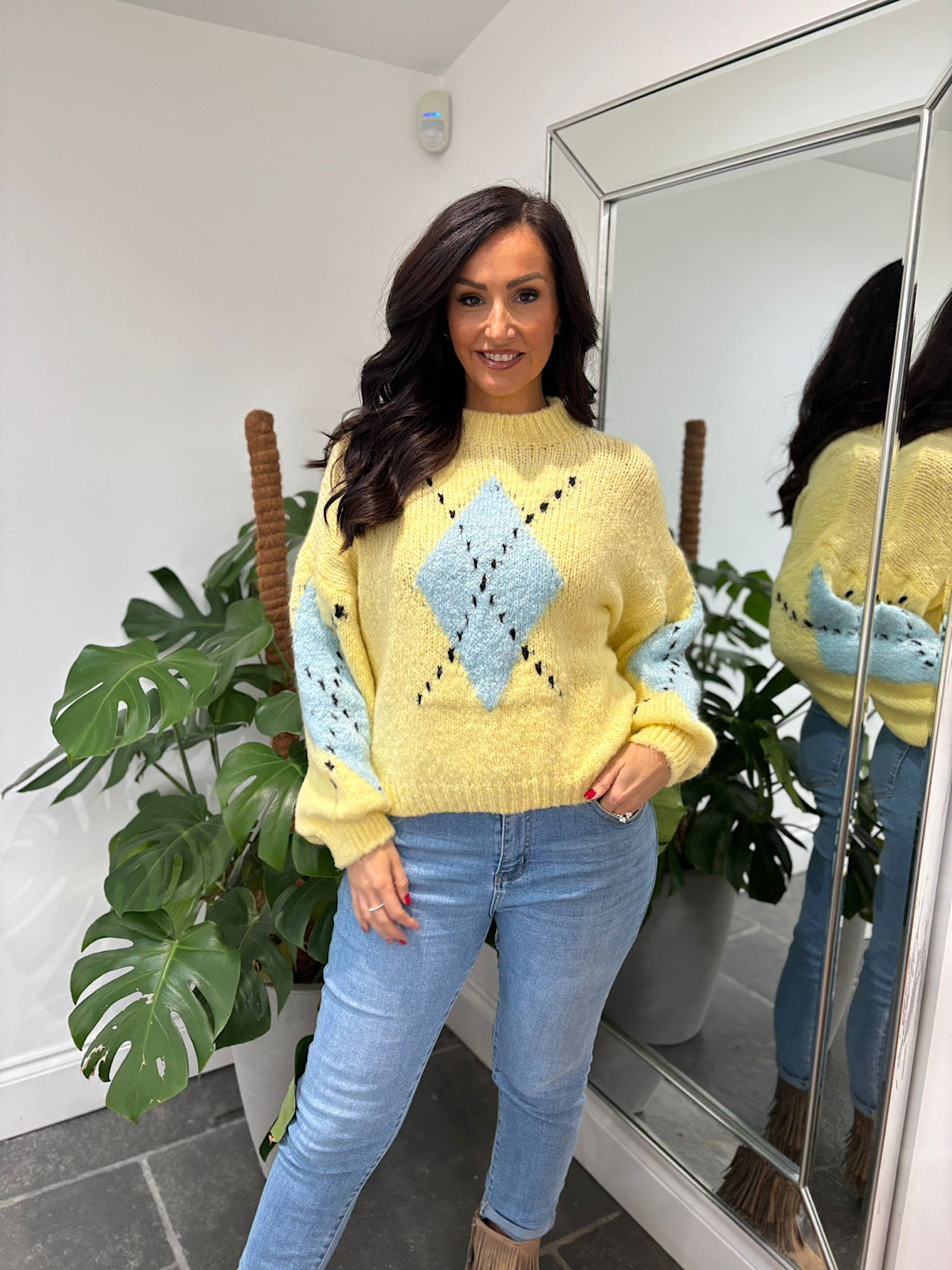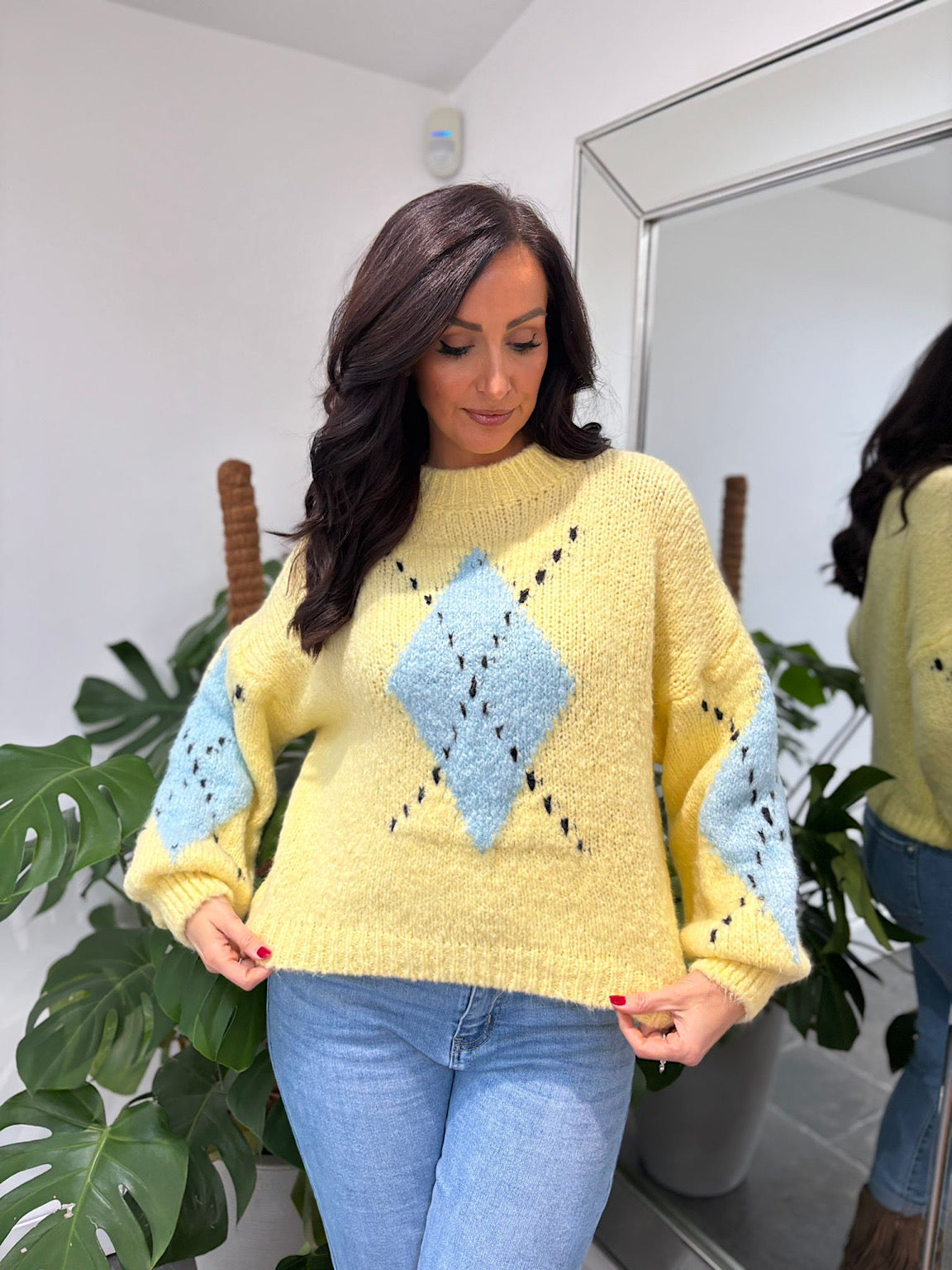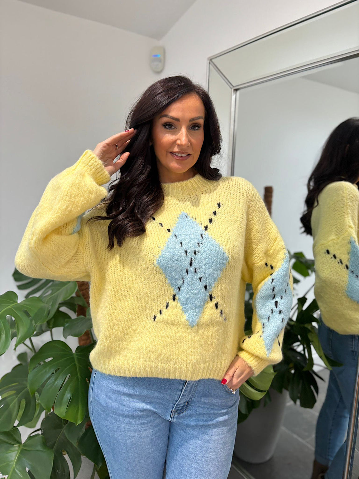 Wrap yourself in warmth and style with this cosy knit jumper, featuring a striking large woven argyle print. The classic crew neck design offers timeless appeal, while the soft fabric provides all-day comfort. Perfect for layering through the colder months or wearing solo for effortless sophistication. A versatile wardrobe essential that combines comfort with contemporary design.