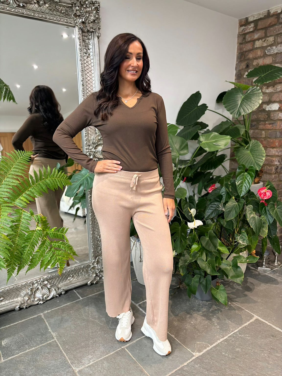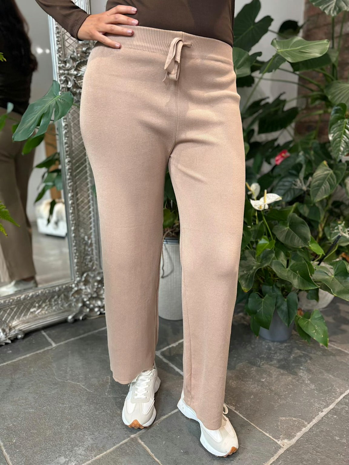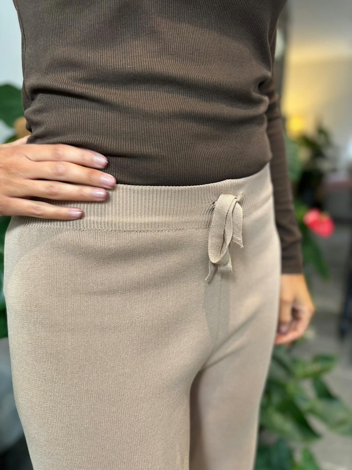 Elevate your wardrobe with the Knitted Trousers Chloe, designed for effortless sophistication. These wide-leg trousers feature a soft knitted fabric, an elasticated waist for comfortable wear, and a decorative tie front that adds a refined finish.