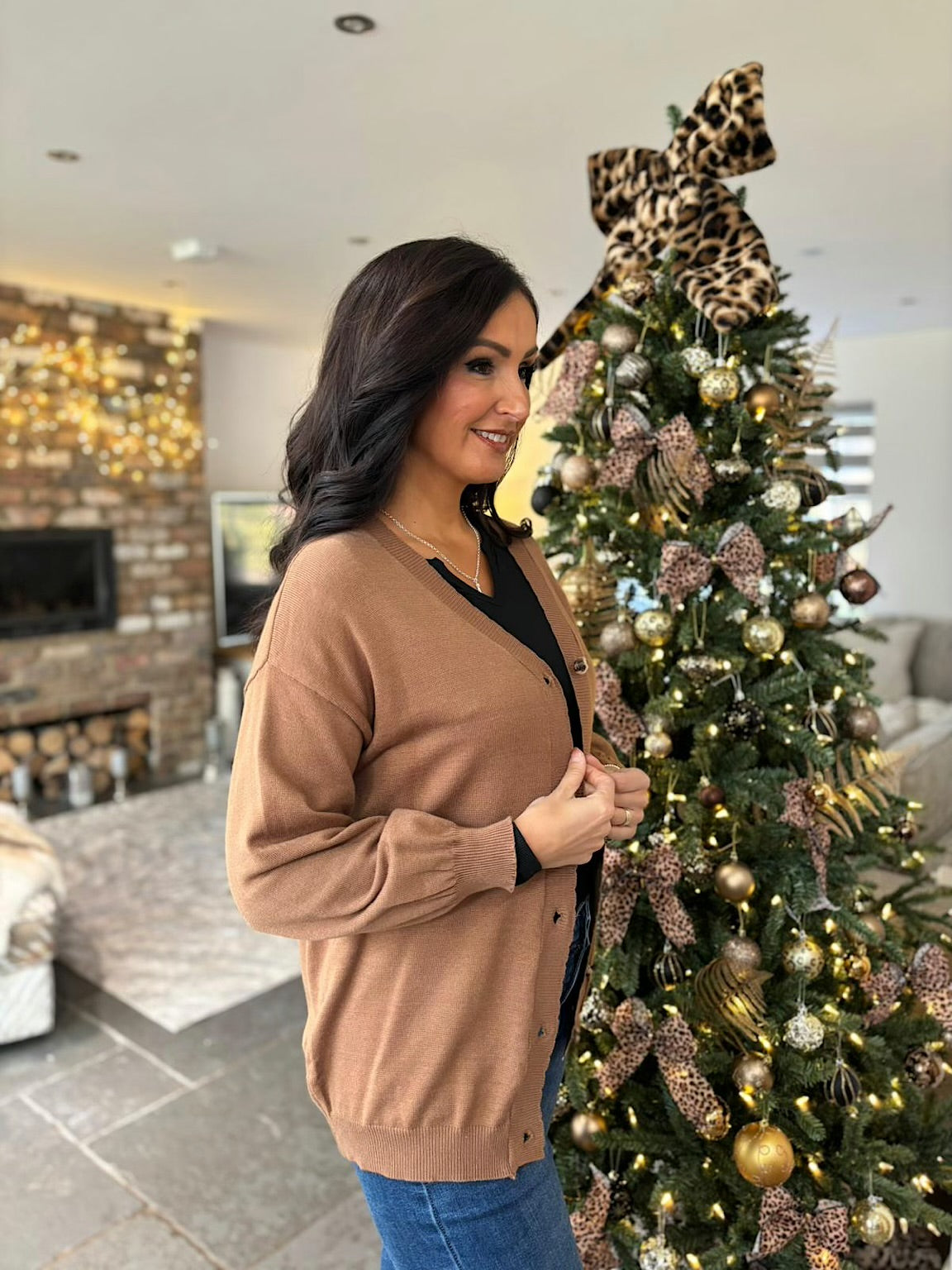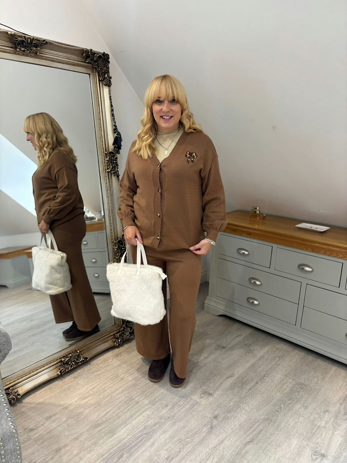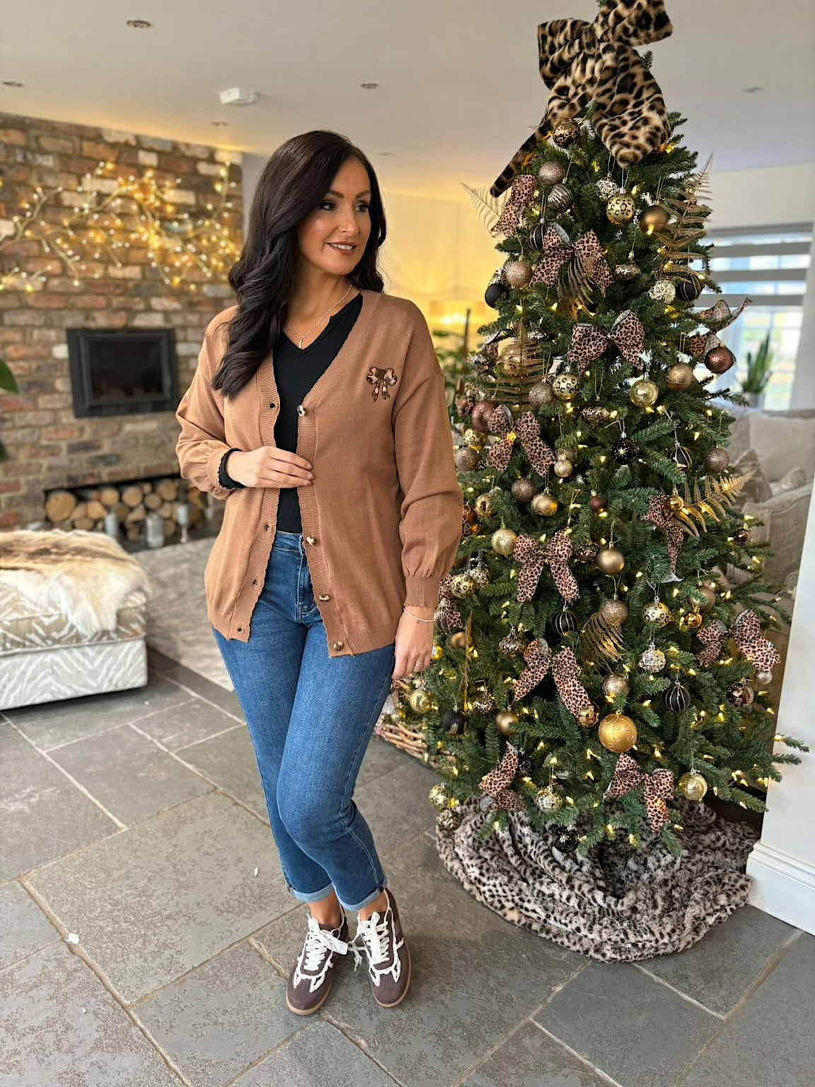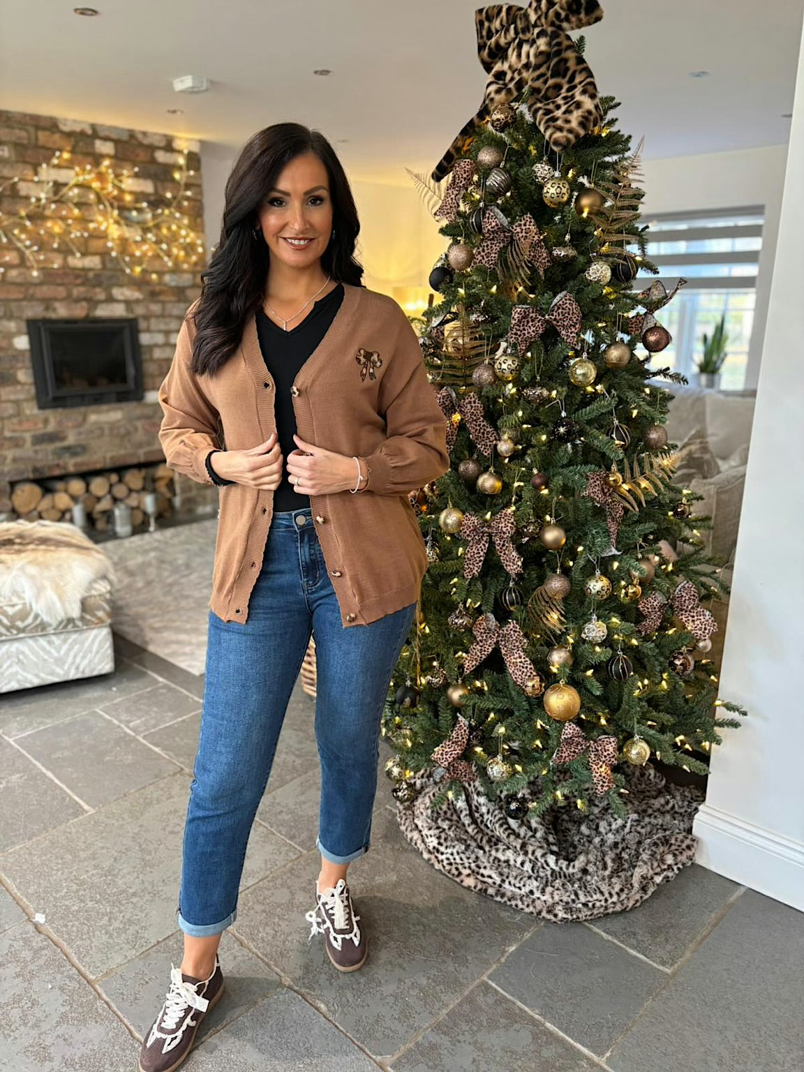 The Leopard Bow Cardi Georgina is made from quality fabric for a comfortable and durable wear. It features a button fastening for easy wear, complemented by an embroidered leopard print bow with gold fleck accents, adding a touch of stylish elegance. This cardigan is designed to support your wardrobe with both practicality and a refined look. Pair with our Georgina Trousers for a complete look.