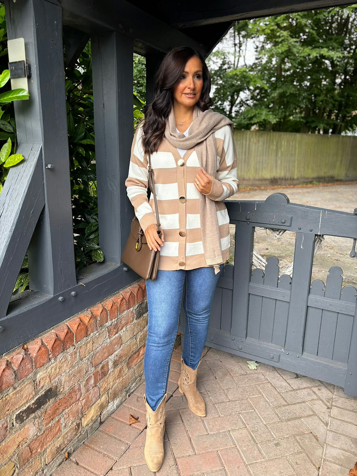 The Stripe Cardigan Chloe combines classic stripes with elegant gold buttons for a refined finish. Crafted from soft knit fabric, this cardigan offers both comfort and timeless sophistication, perfect for enhancing any smart-casual ensemble.