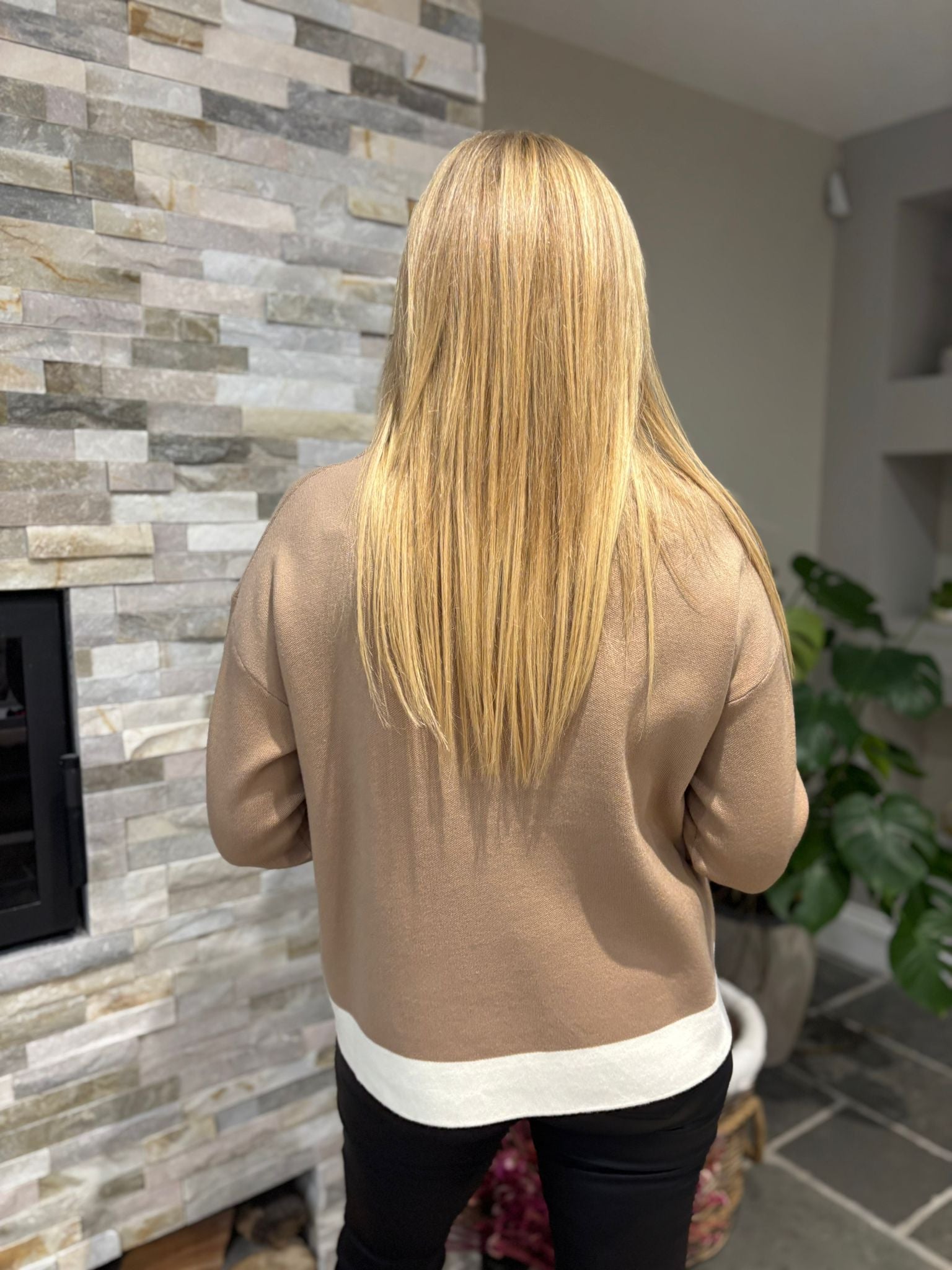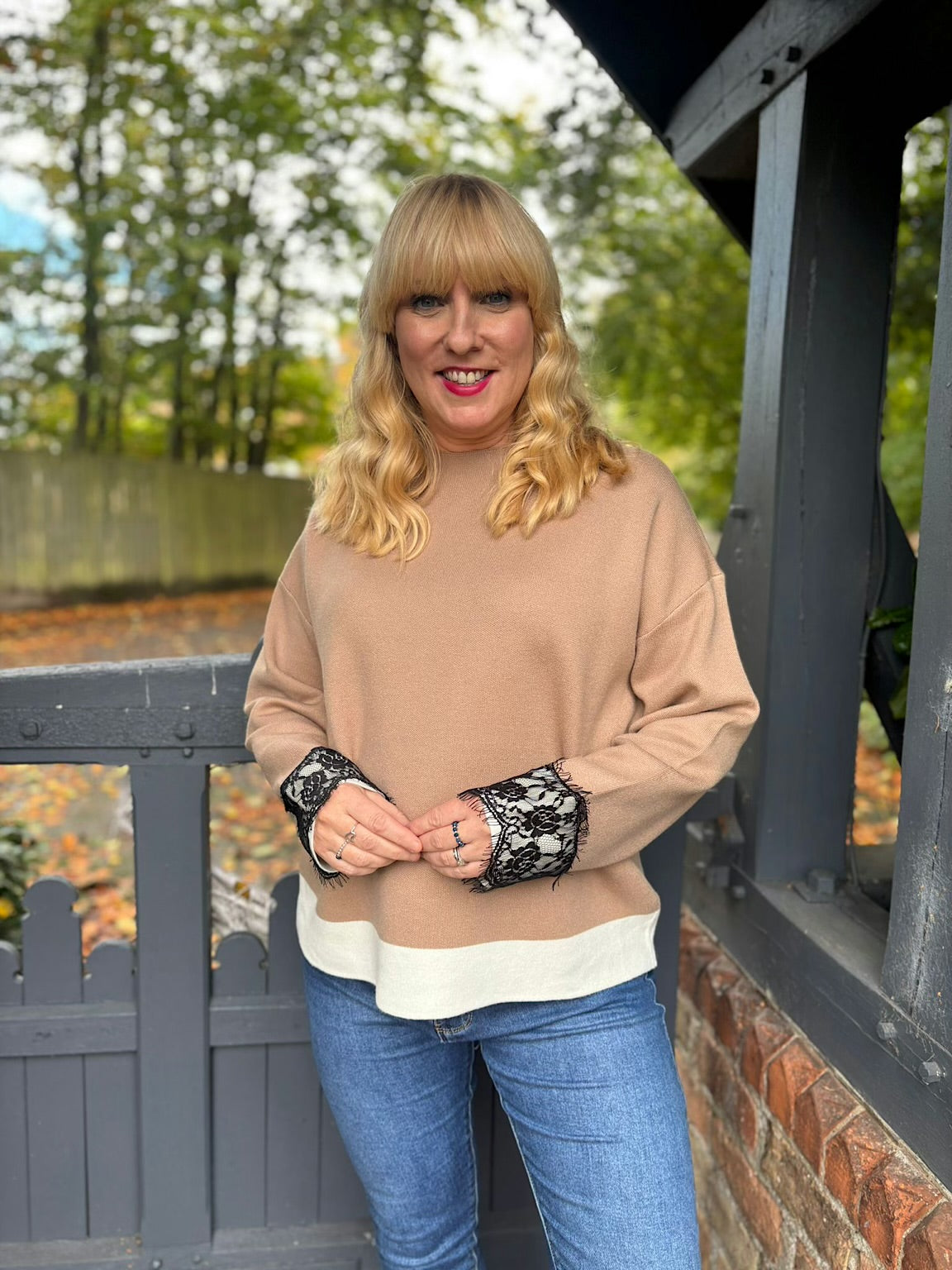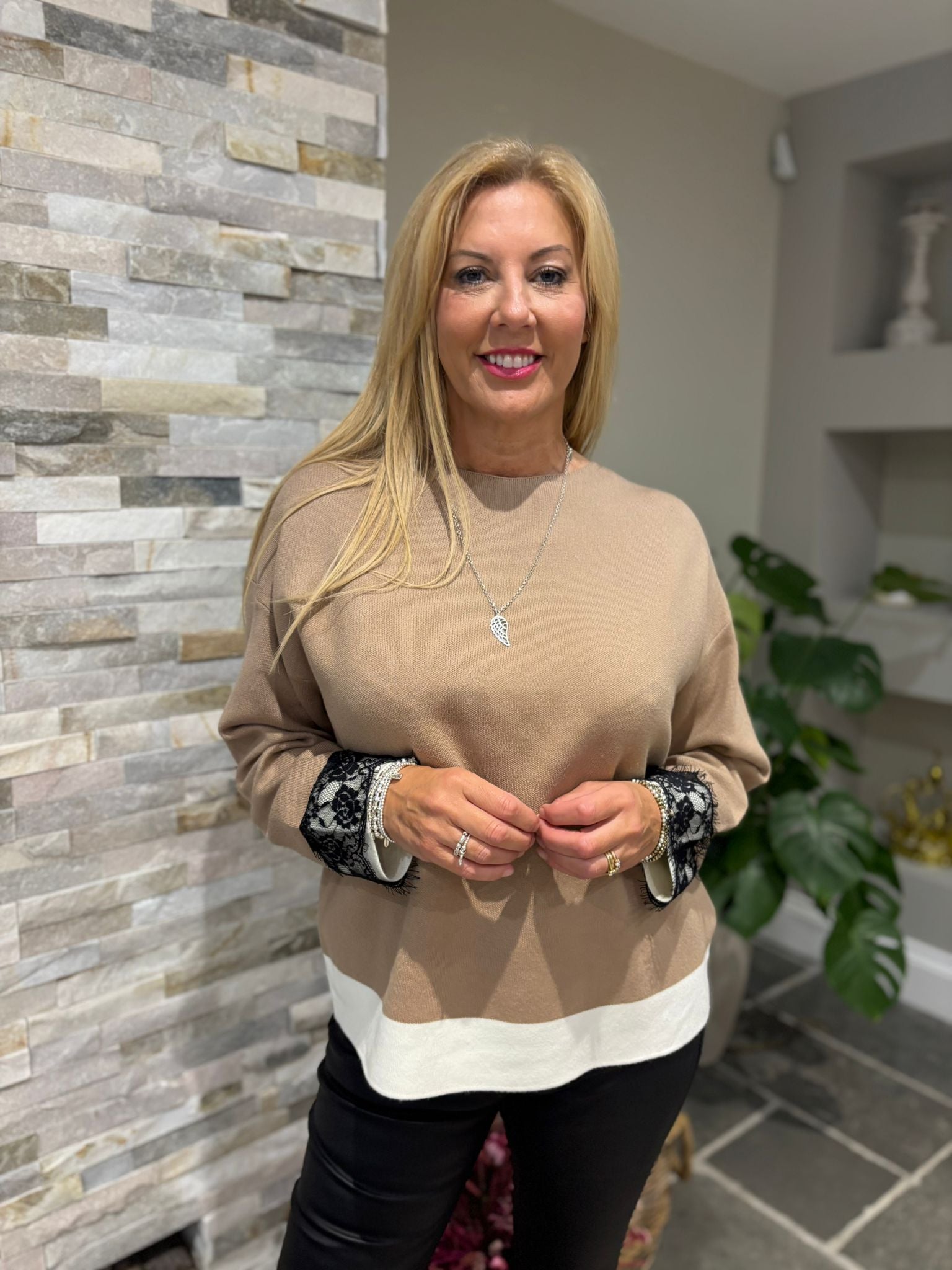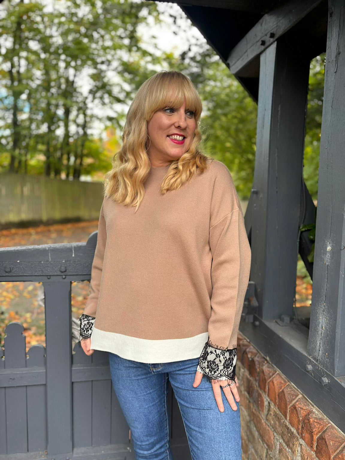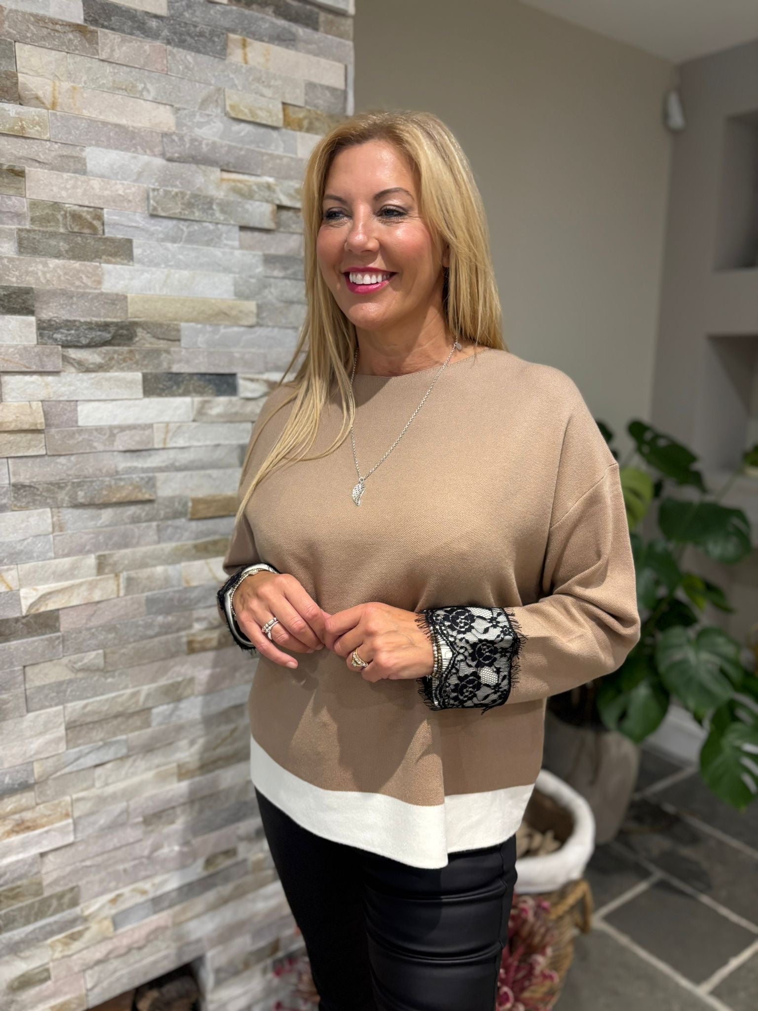 This soft knit top offers comfortable wear with a stylish twist. Featuring a contrasting trim at the bottom, it adds subtle detail to your look, while delicate lace at the cuffs provides a feminine touch. Perfect for layering or wearing on its own, it combines comfort with understated elegance.