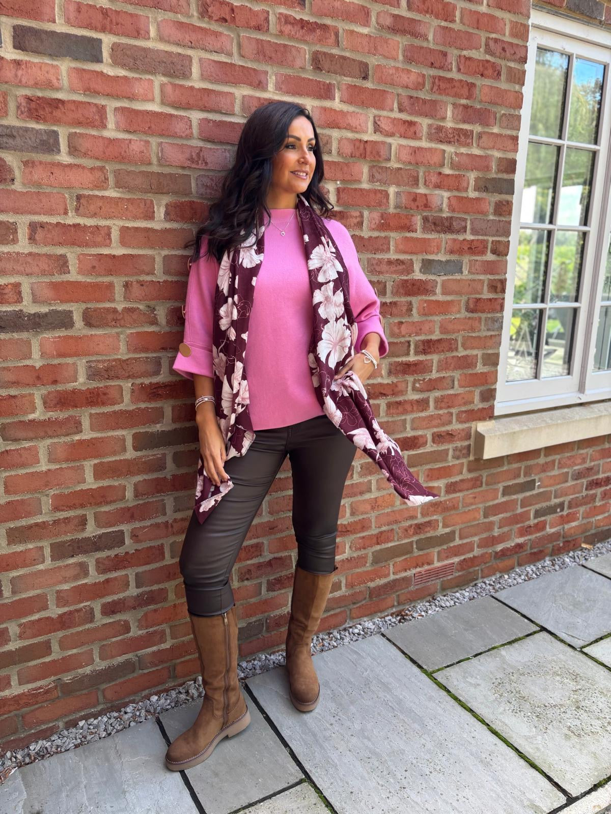 Styled with.....> Wine Floral Raw Edge Scarf / Tan Faux Suede Knee High Boots / Chocolate Coated Trousers