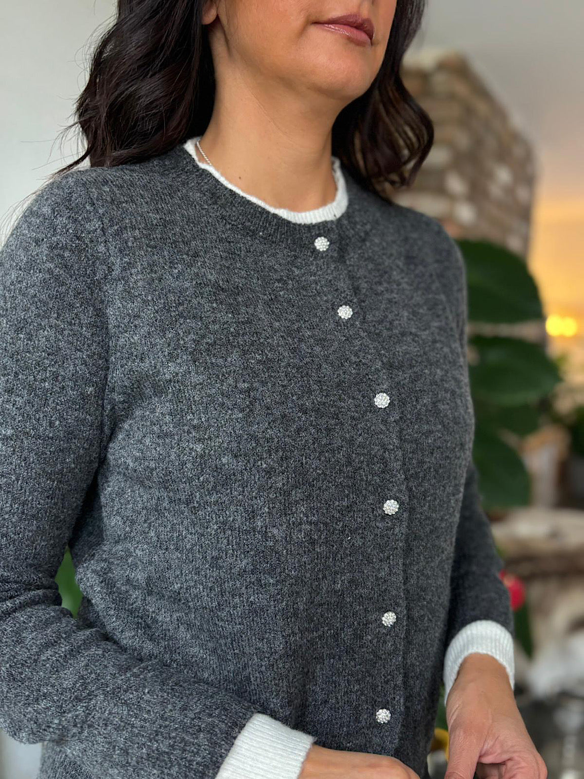 Experience comfort and style with the Layered Knitted Cardigan Evelyn. Crafted from super soft material, it features an attached layered top underneath for effortless, put-together looks. The convenient diamante button fastening ensures easy wear, making this cardigan a cosy and versatile addition to your wardrobe.