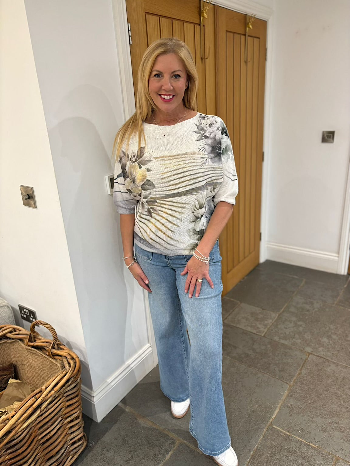 Embrace effortless elegance with this stunning soft knit featuring delicate floral motifs an shimmering metallic stripes. The teal base creates a calming, sophisticated palette that transitions beautifully from day to evening wear. Crafted from a luxuriously soft knit fabric, Dawn offers gentle comfort without compromising on style. The wave-inspired design adds movement and dimension, making this piece a versatile wardrobe essential that works beautifully layered or worn alone. Perfect for those who appreciate understated glamour with a touch of sparkle.