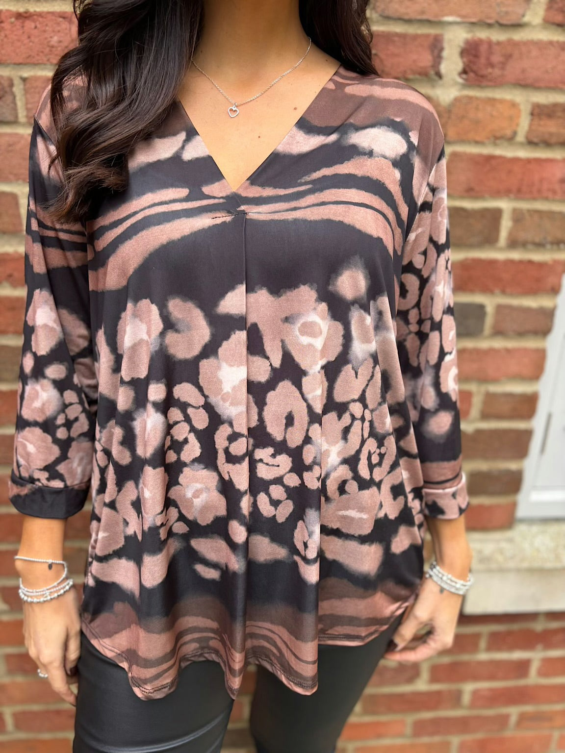 The Animal Ombre Top Trisha boasts a smooth, free-flowing fabric that sits beautifully for all-day comfort. Its design features a unique blend of animal print and ombre-style colours, creating a versatile multi-patterned look that enhances any outfit with subtle sophistication.