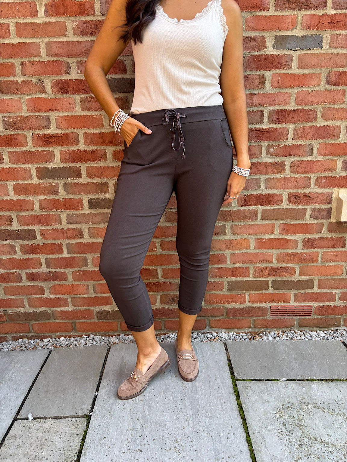 These Magic Trousers are perfect for staycations, holidays or even just going out walking with the dog. Available in a variety of colours, they are super stretchy, comfortable and have a lurex detail drawstring. If you would like a looser boyfriend style fit then we recommend going for the size up.