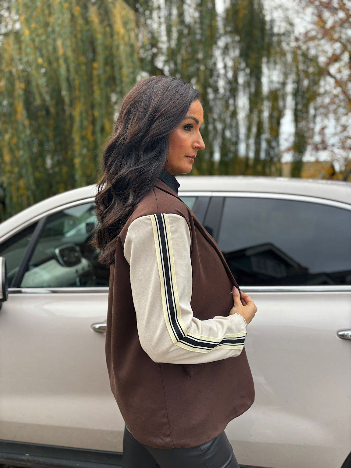 Make a statement with the Blazer Jacket Emma, your go-to piece for looking and feeling your best. This thoughtfully designed blazer combines style with practicality, featuring fully lined construction for durability and comfort. Structured shoulder pads deliver a sharp, confident look, while soft, comfortable fabric ensures you can wear it all day without compromise. Eye-catching striped detailing down the arms brings modern edge to a classic silhouette, and convenient faux pockets add functional appeal. Whether you're heading to the office or out for the evening, this jacket supports your style journey with understated sophistication.