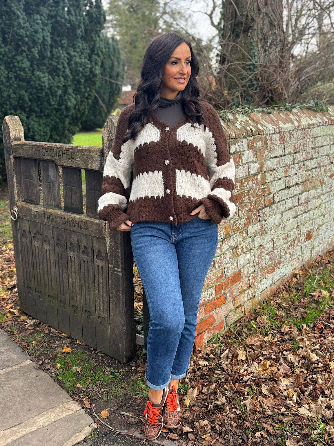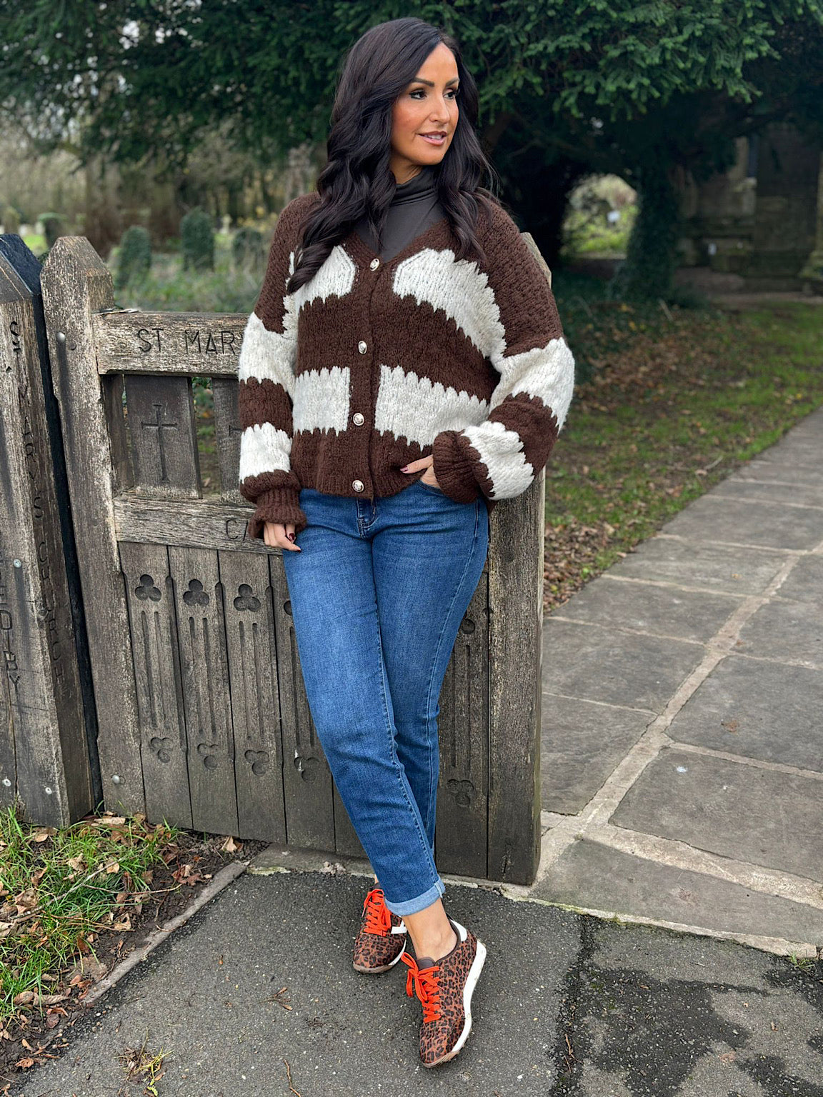 Wrap yourself in warmth with this beautifully crafted wool blend cardigan. Featuring a striking stripe design that adds visual interest to any outfit, this piece combines comfort with style. The gold button detail brings a touch of elegance, making it perfect for layering over your favourite pieces. Ideal for creating cosy, put-together looks throughout the season.