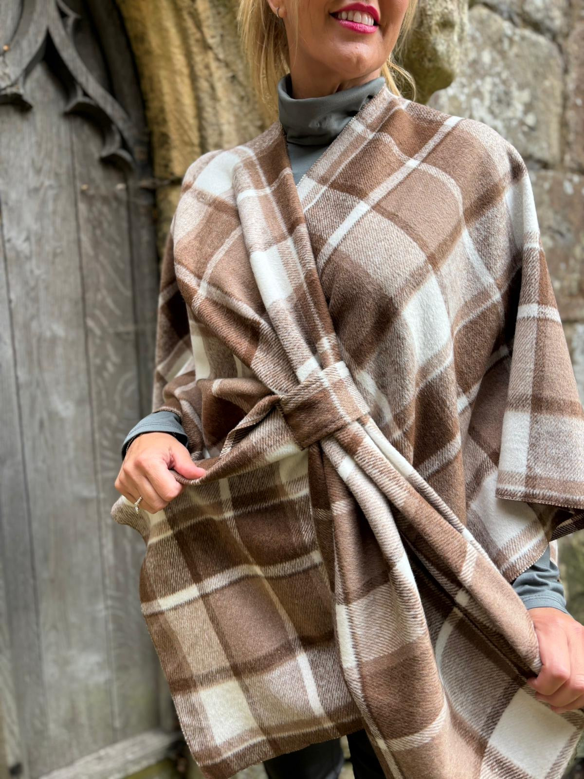 Wrap yourself in warmth and style with this beautifully soft shawl. The mocha check pattern brings understated elegance to any outfit, while the tie detail adds a charming, versatile touch. Perfect for layering over dresses, jumpers, or shoulders on cooler days. Drape it loosely for a relaxed vibe or tie it snugly for extra comfort and sophistication.