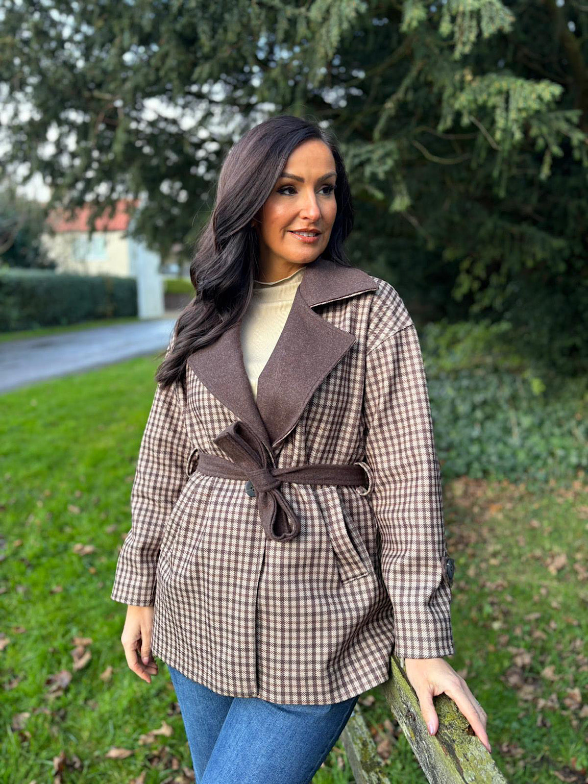 Chocolate Checked Belted Jacket Clementine