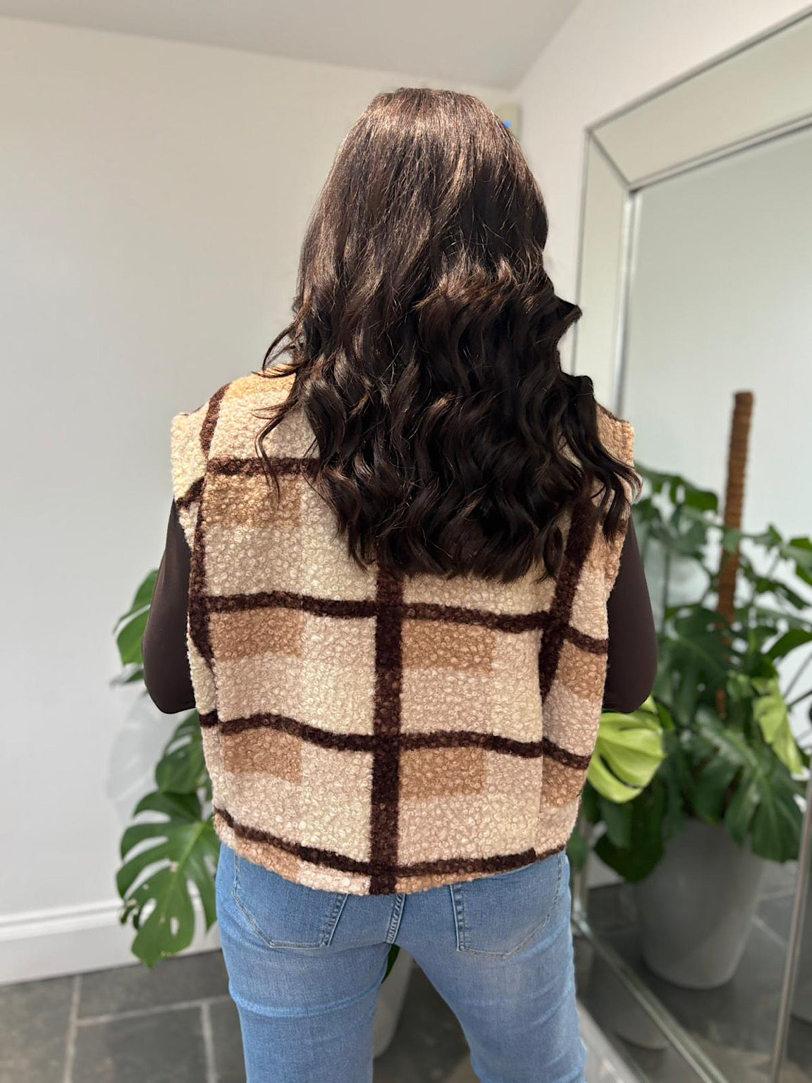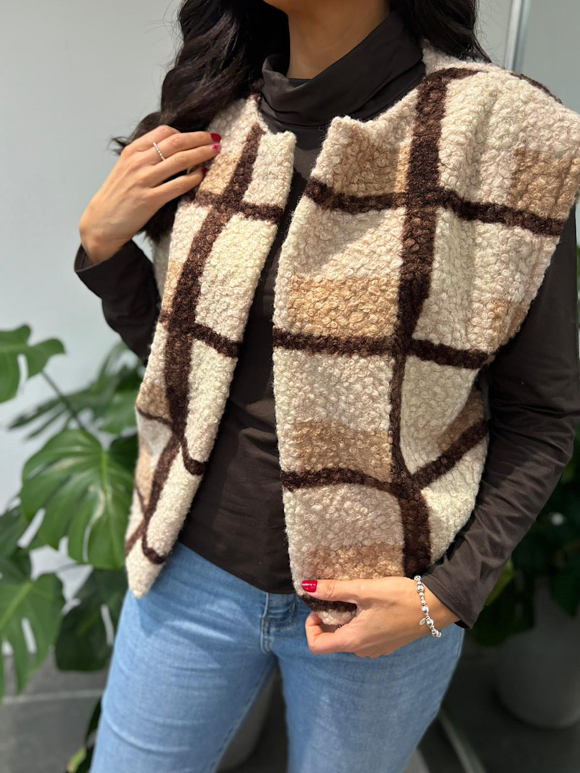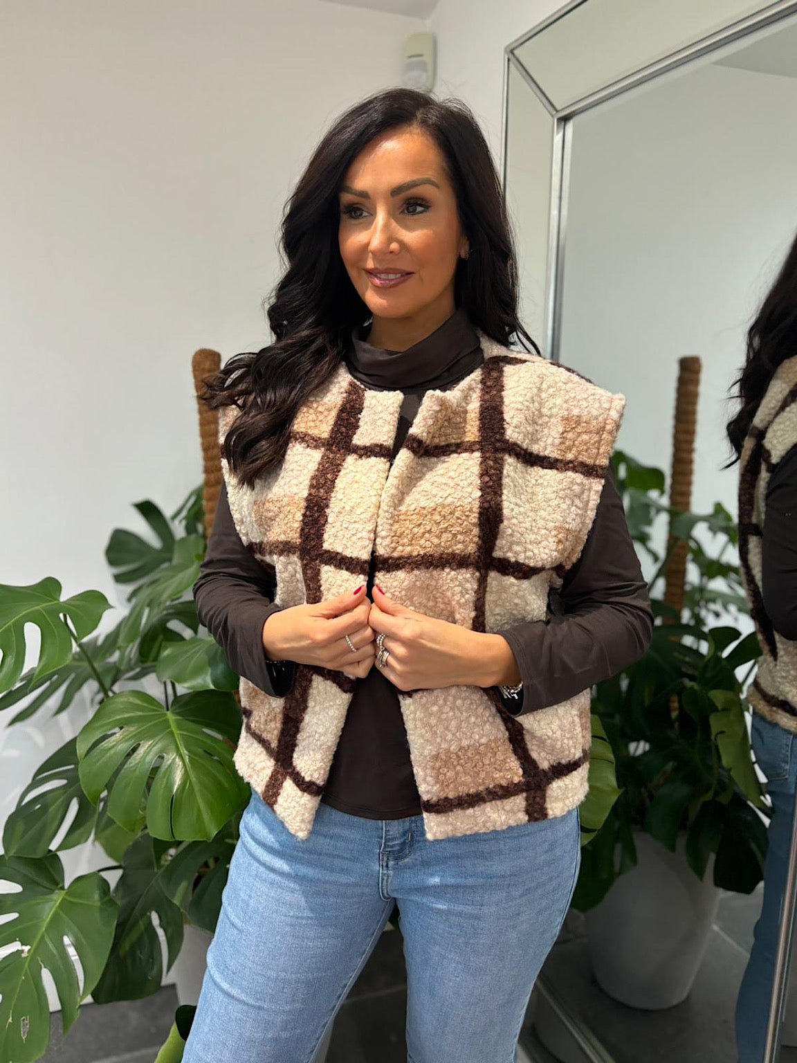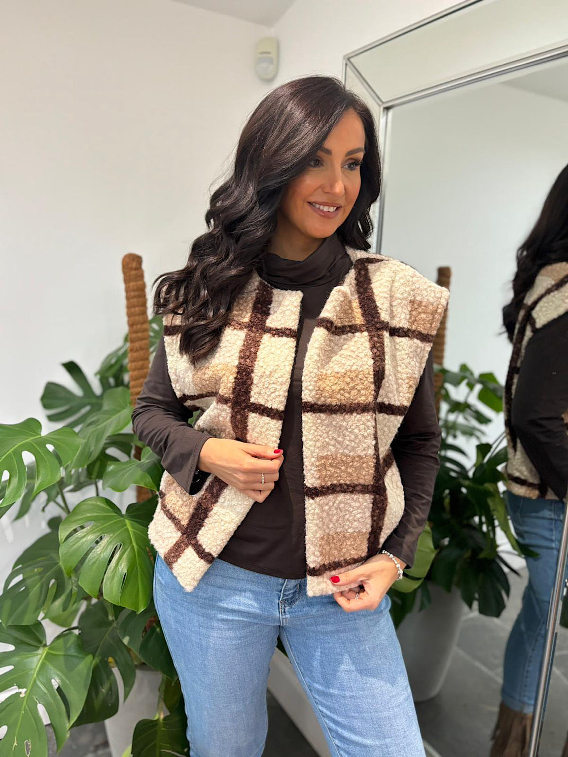 Wrap yourself in warmth and style with the Checked Sherpa Waistcoat Millie. Crafted from luxuriously soft sherpa material, this waistcoat delivers cosy comfort without compromising on sophistication. The charming checked design adds visual interest to any outfit, making it the perfect transitional piece for layering through the seasons. Whether you're dressing up or keeping it casual, this versatile waistcoat works beautifully over jumpers, shirts, or dresses, giving you effortless style and comfort all season long.