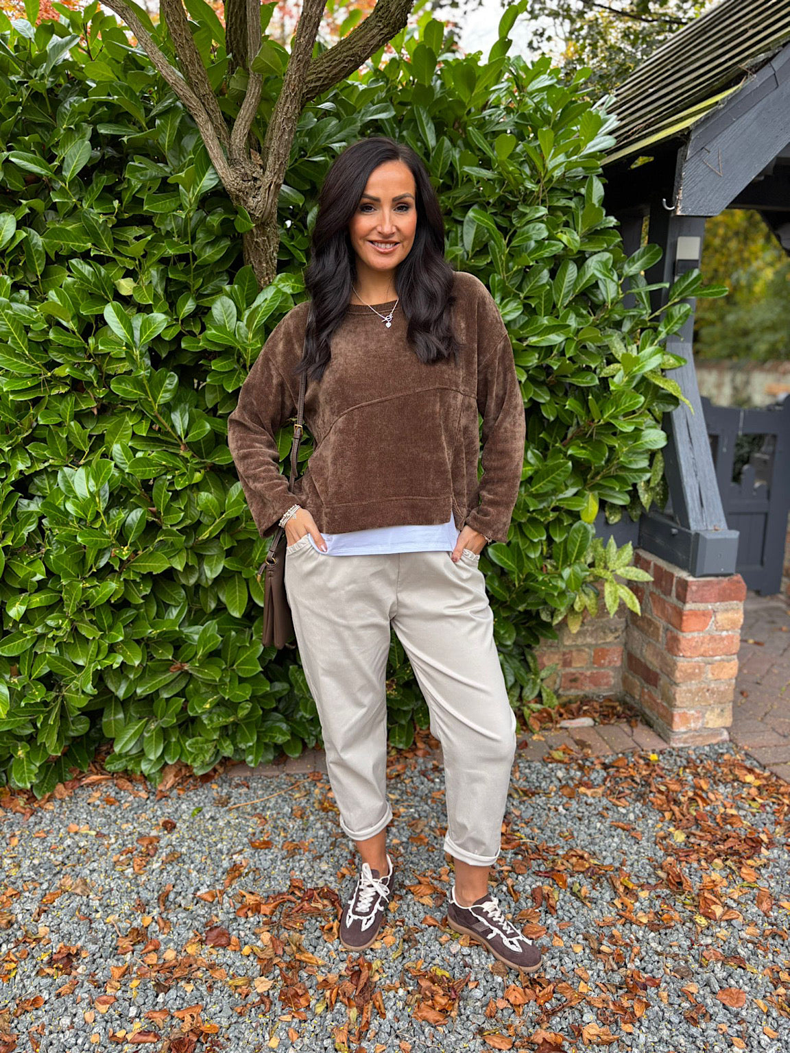 Introducing the Chenille Sweatshirt Skye, crafted from luxuriously soft chenille fabric, this long-sleeve sweatshirt wraps you in warmth and tactile indulgence. The crisp white trim detailing adds a polished contrast that elevates the classic base, creating a look that's both versatile and put-together.