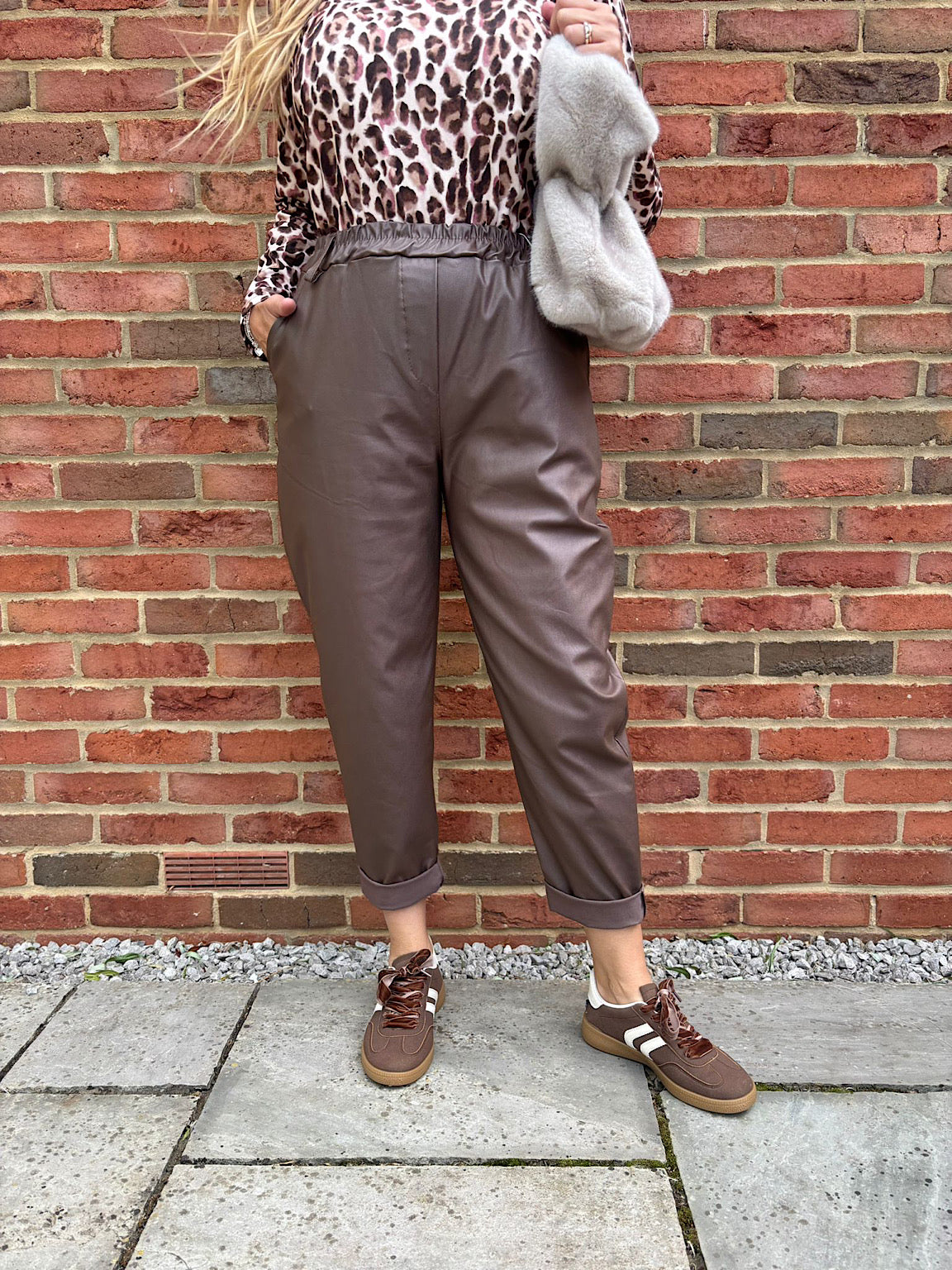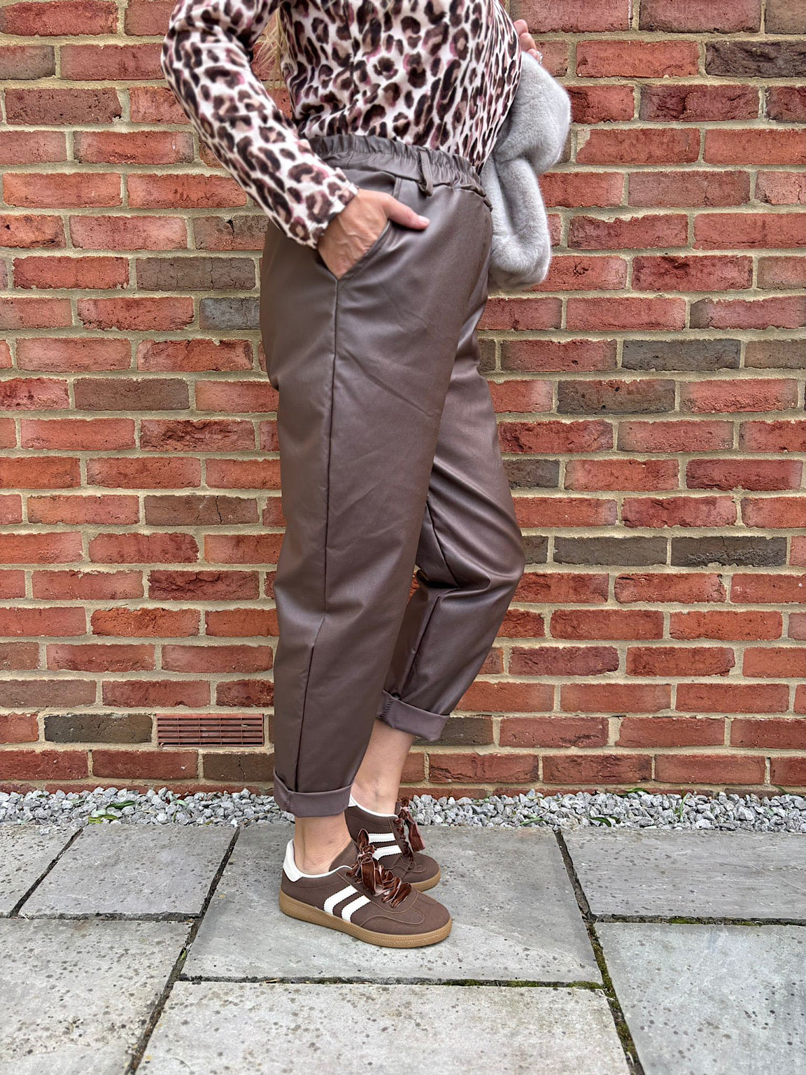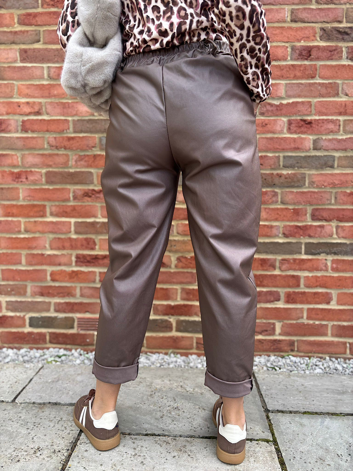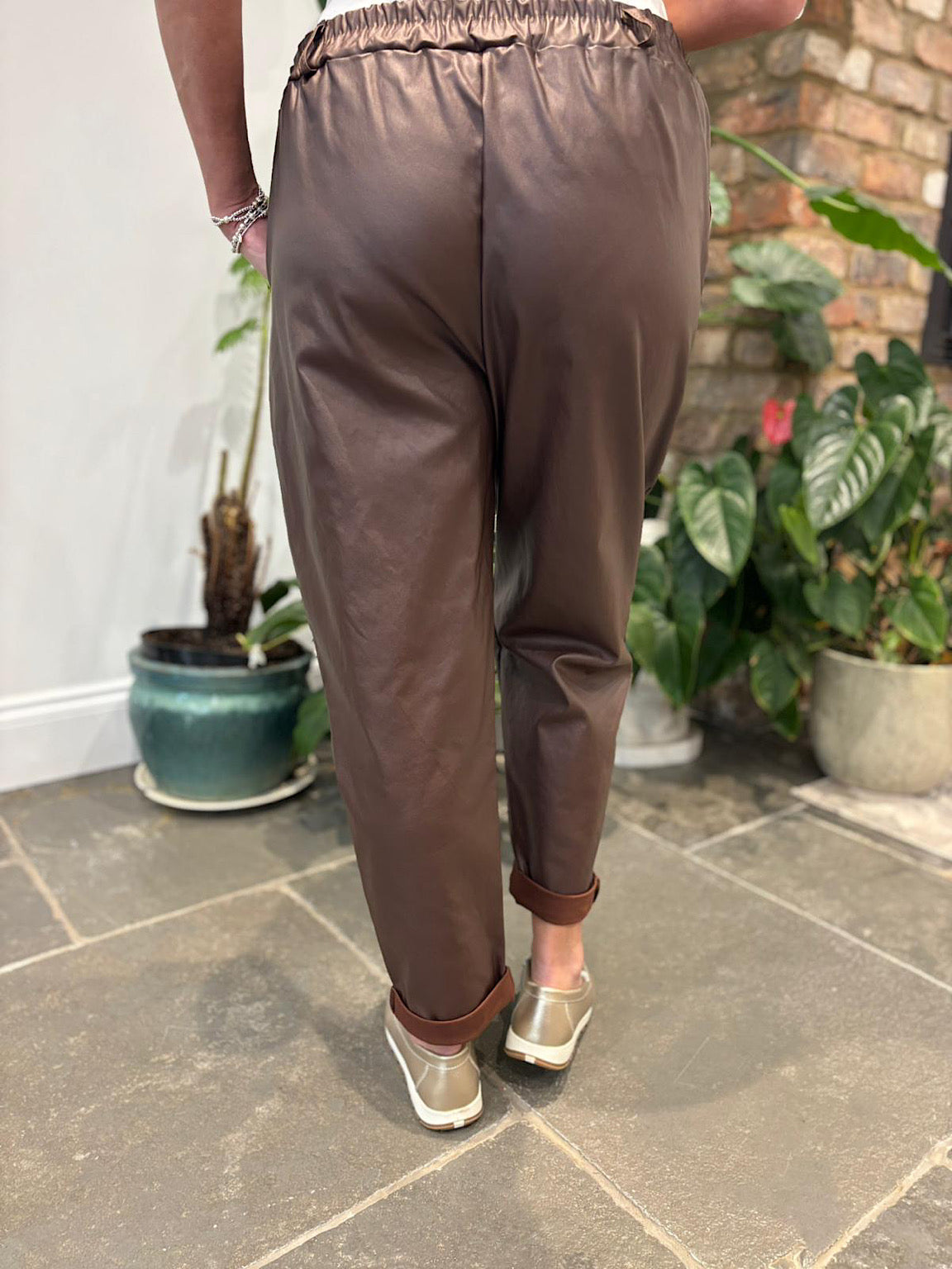 Crafted with a coated finish, these Coated Turn Up Trousers feature an elasticated waist with belt loops for a comfortable, adaptable fit. Their wide leg design and turn-up option allow you to customize your style effortlessly while enjoying all-day ease and confidence.