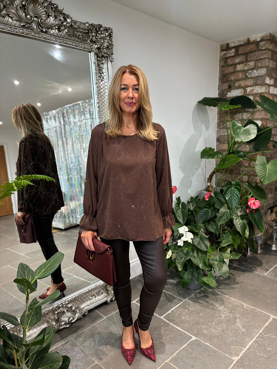 The Diamante Flower Top Kinsley combines elegance and comfort with its delicate diamante flower pattern, adding a touch of sparkle to your look. Featuring a flattering round neck and elasticated wrists, this top offers a comfortable fit that stays in place throughout the day. Perfect for dressing up or down, it’s a versatile addition to your wardrobe that supports both style and ease.