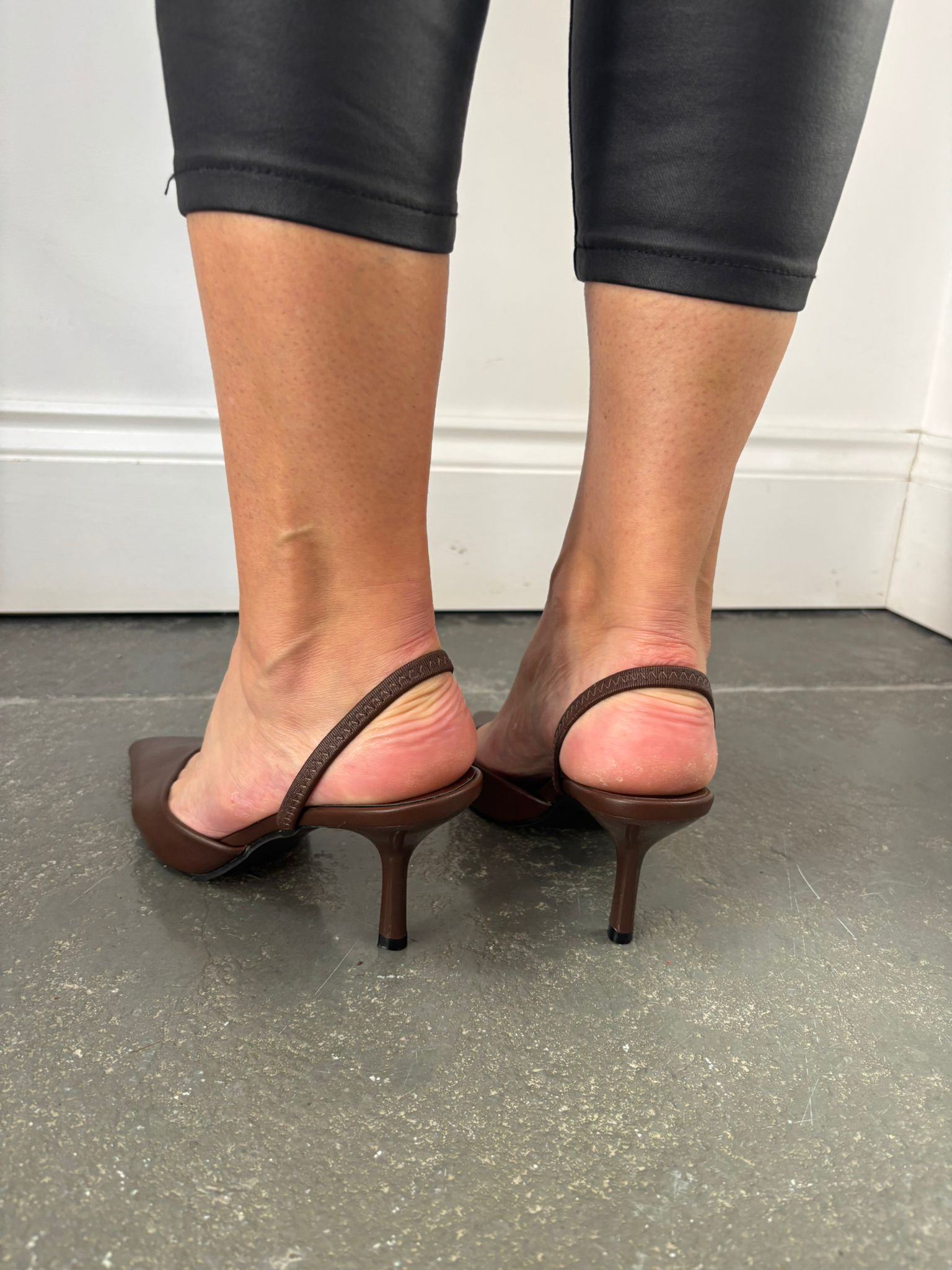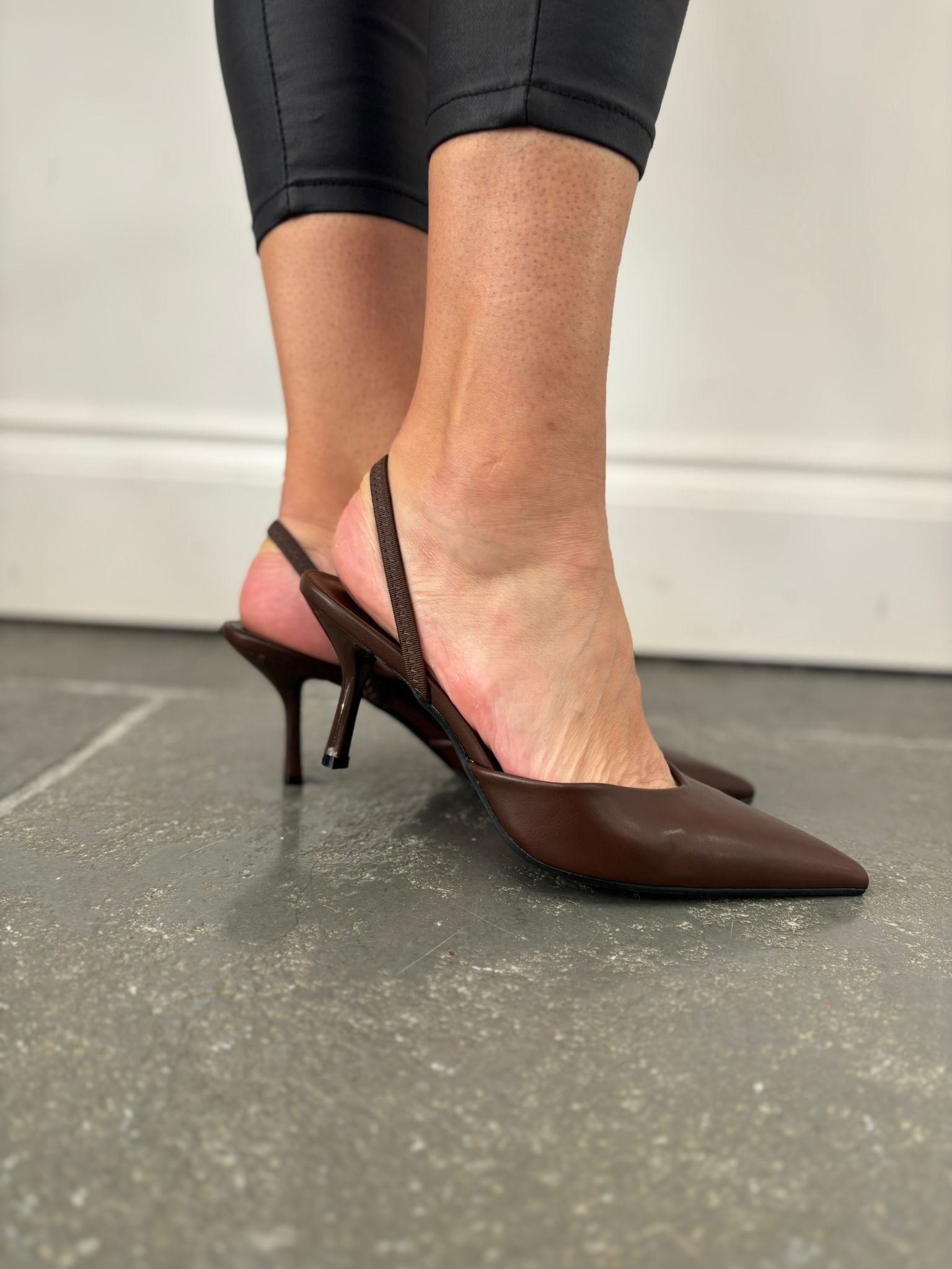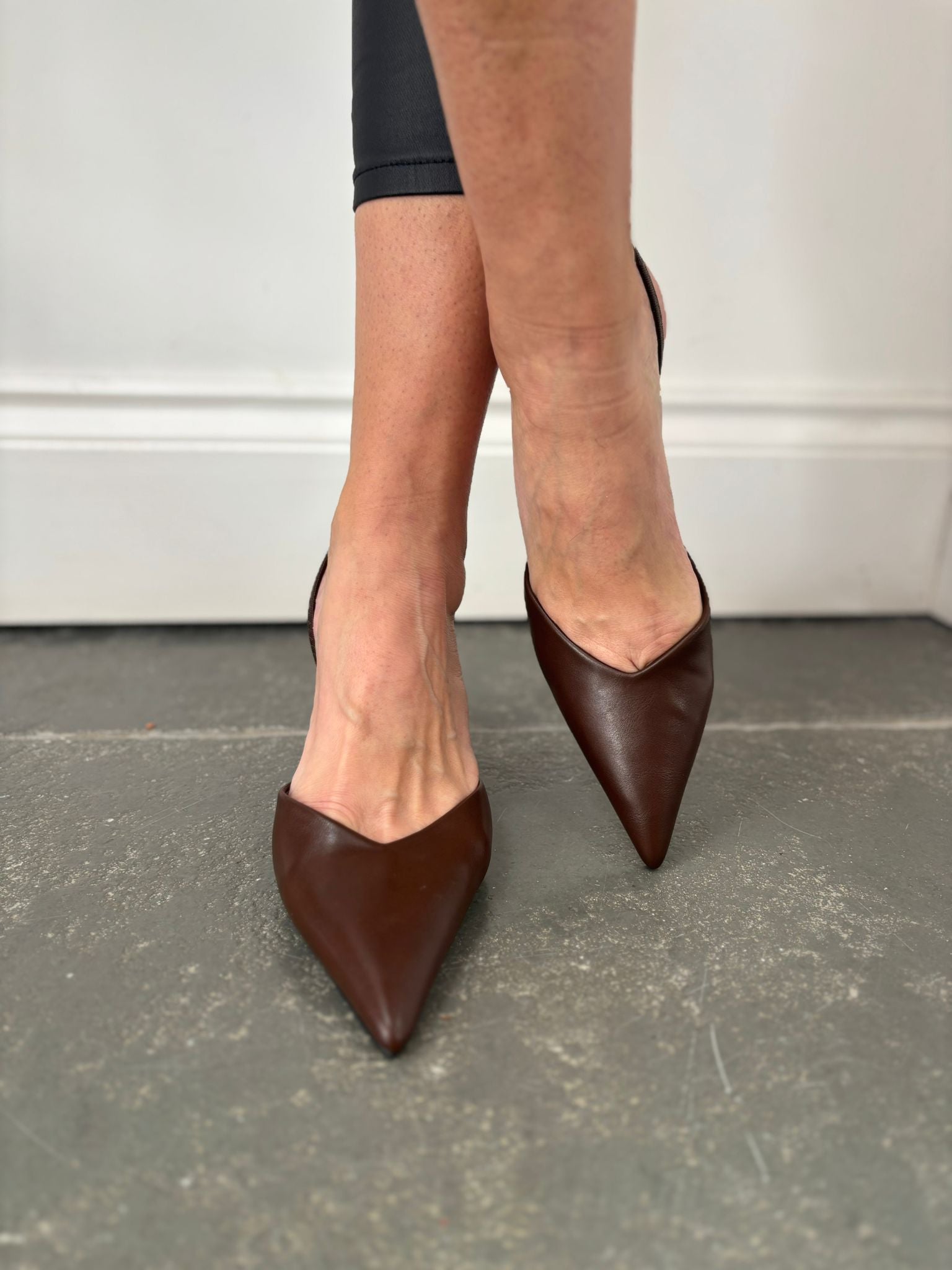 Elevate your style with these chocolate faux leather kitten heels, featuring a sleek pointed toe for a refined silhouette. The modest heel provides subtle lift and all-day comfort, making them perfect for both office wear and evening outings. Crafted with a smooth faux leather finish, they offer a sophisticated look while being animal-friendly. A timeless addition to your wardrobe that effortlessly blends elegance and practicality.