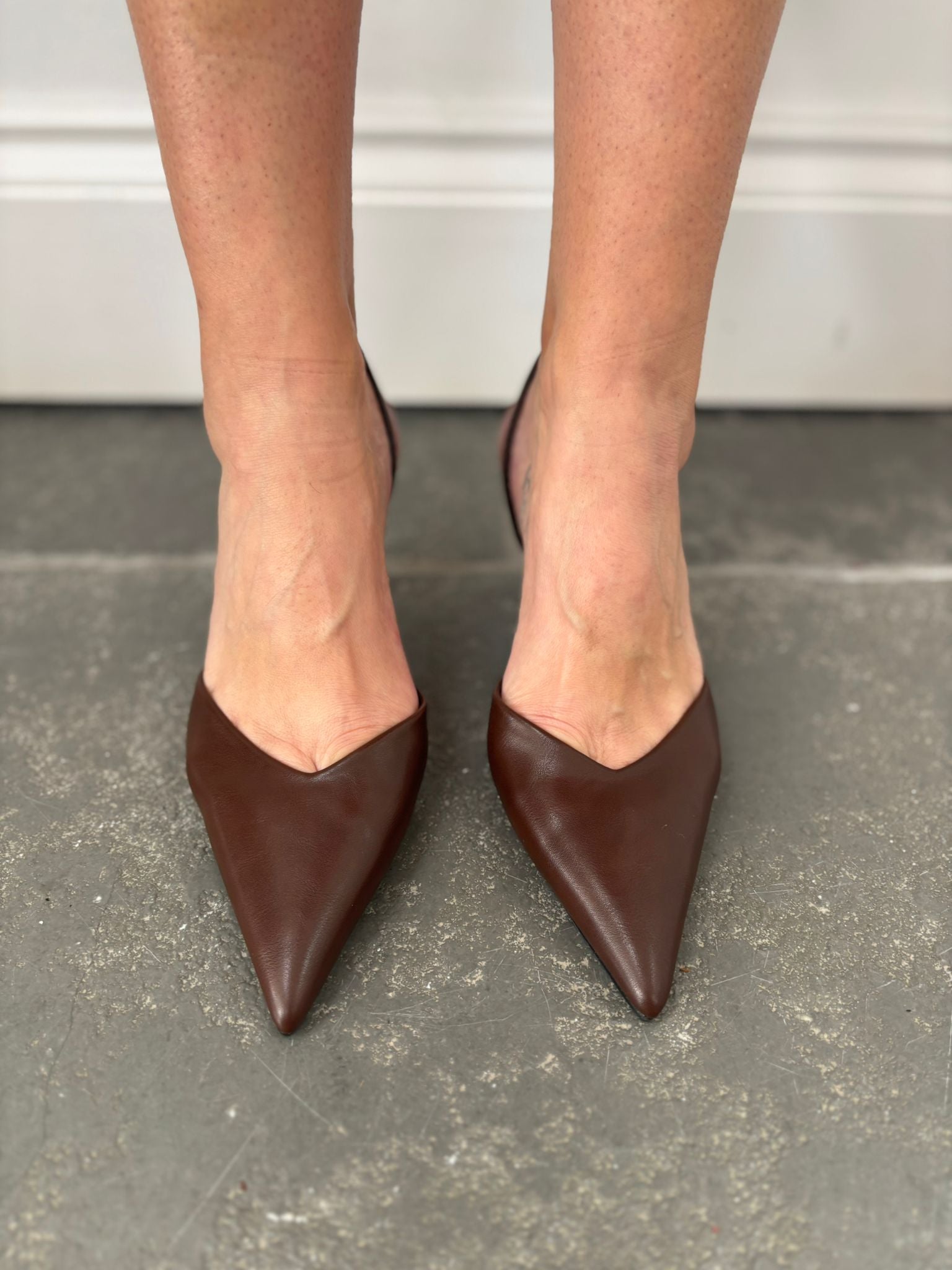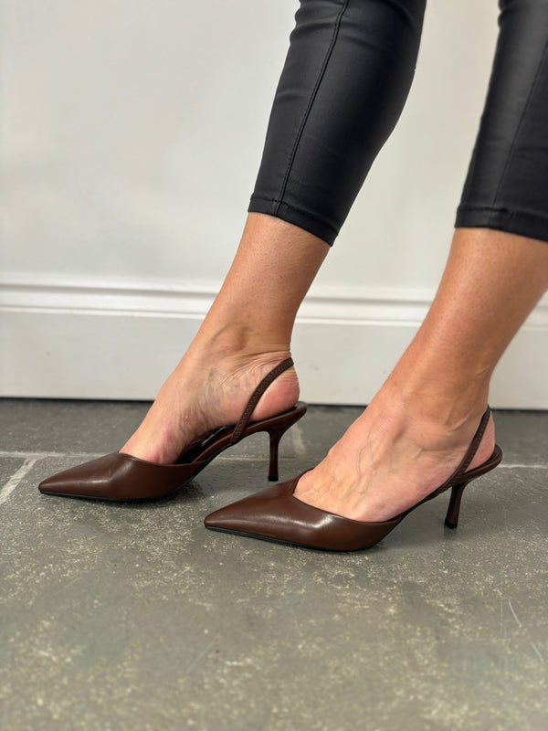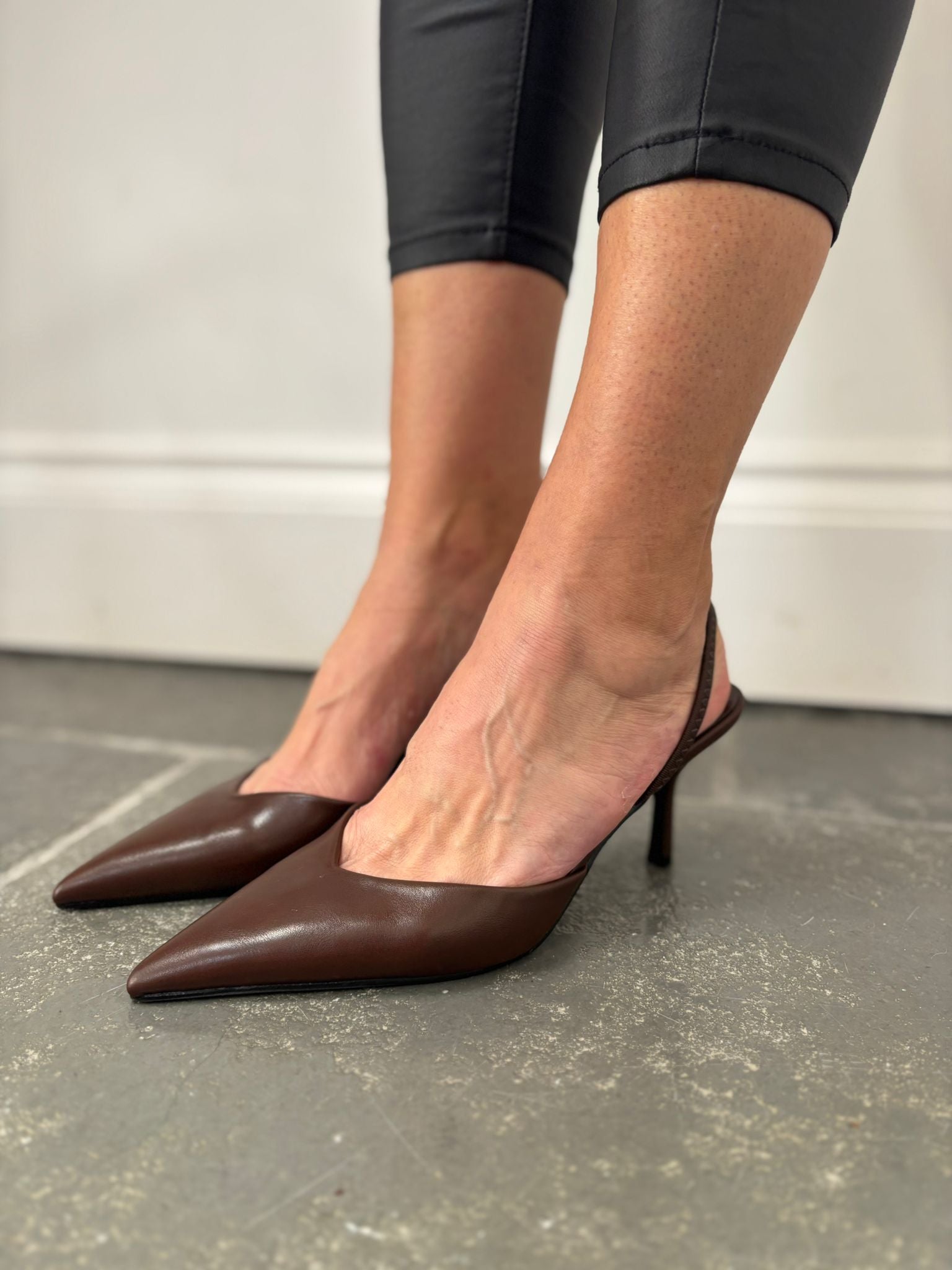 Elevate your style with these chocolate faux leather kitten heels, featuring a sleek pointed toe for a refined silhouette. The modest heel provides subtle lift and all-day comfort, making them perfect for both office wear and evening outings. Crafted with a smooth faux leather finish, they offer a sophisticated look while being animal-friendly. A timeless addition to your wardrobe that effortlessly blends elegance and practicality.