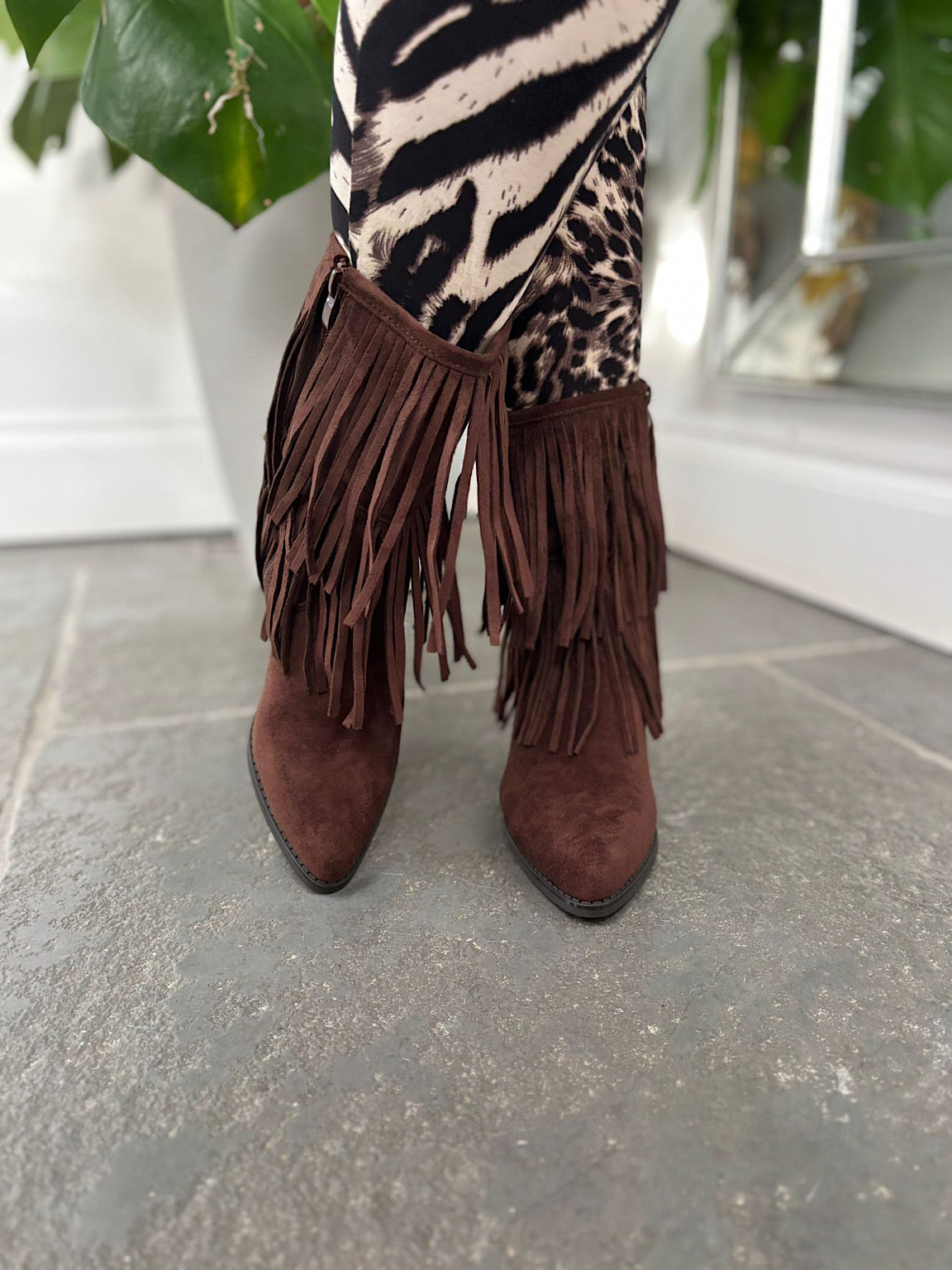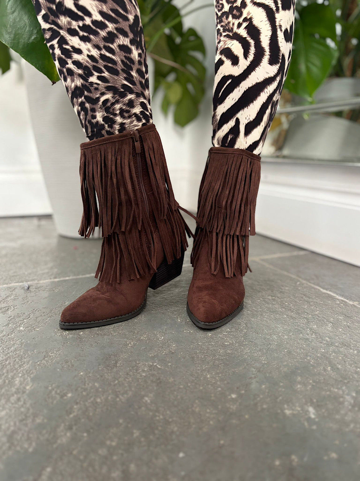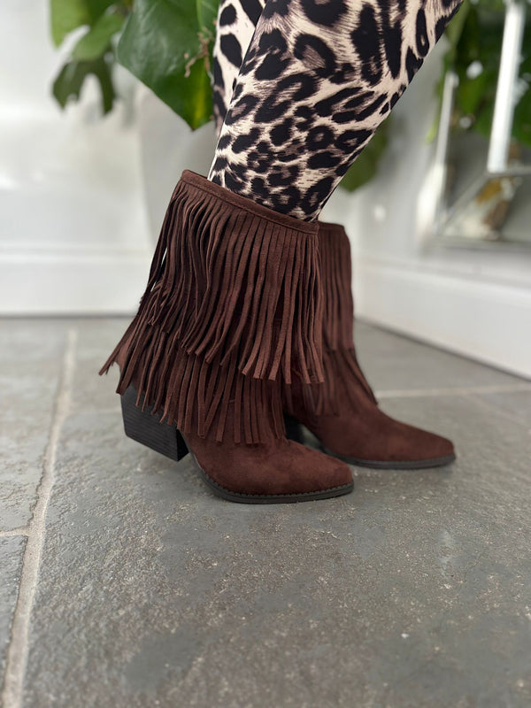 Elevate your footwear collection with these stunning faux suede ankle boots, featuring a captivating layered fringe design that adds movement and personality to every step. The soft faux suede upper delivers a luxurious feel without the maintenance, while the cascading fringe detail creates an eye-catching statement piece perfect for dressing up or down. Whether you're heading out for the evening or making a casual style statement, these boots offer the versatility and visual interest you're looking for in a modern wardrobe essential.