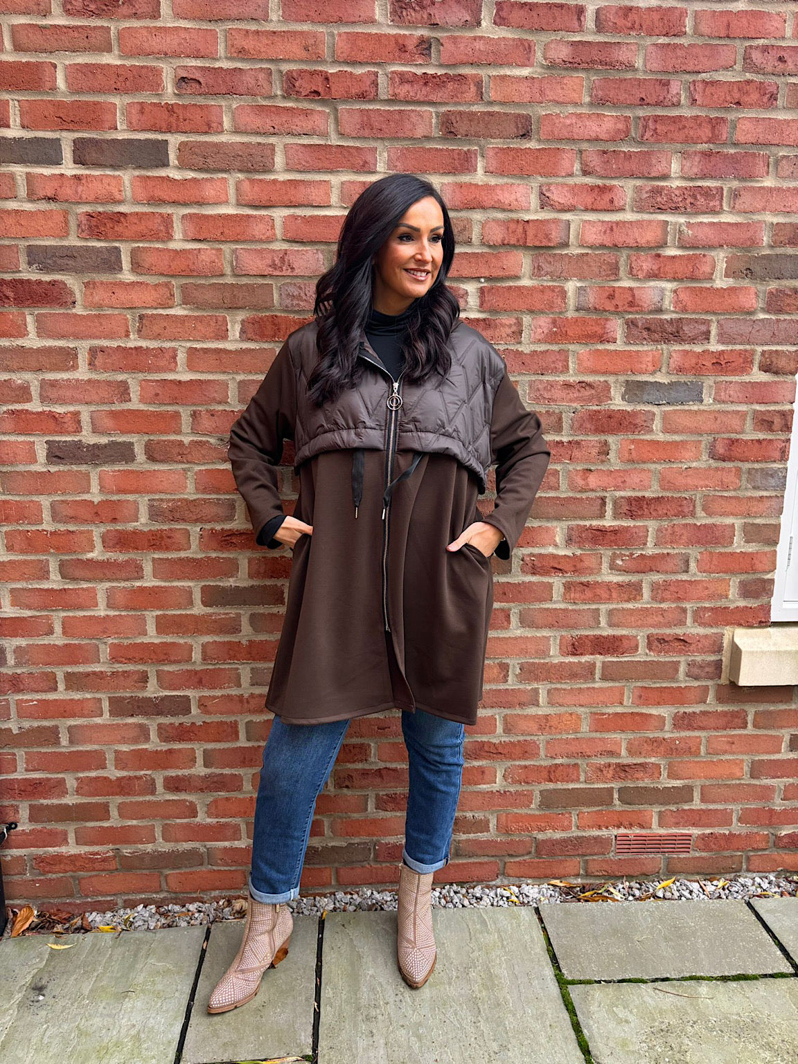 Embrace comfort and style with this Half Quilted Sweat Jacket Lois. Crafted from soft sweater-style material, it features quilting across the upper half for added warmth and texture. The convenient zip fastening makes layering effortless, while the adjustable ribbon drawstring lets you customise the fit. Complete with a cosy hood, this versatile piece transitions seamlessly from casual days to outdoor adventures. Perfect for staying warm without compromising on style.