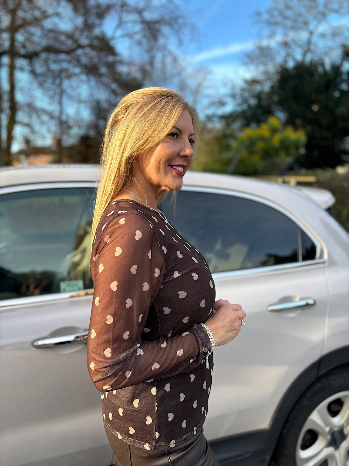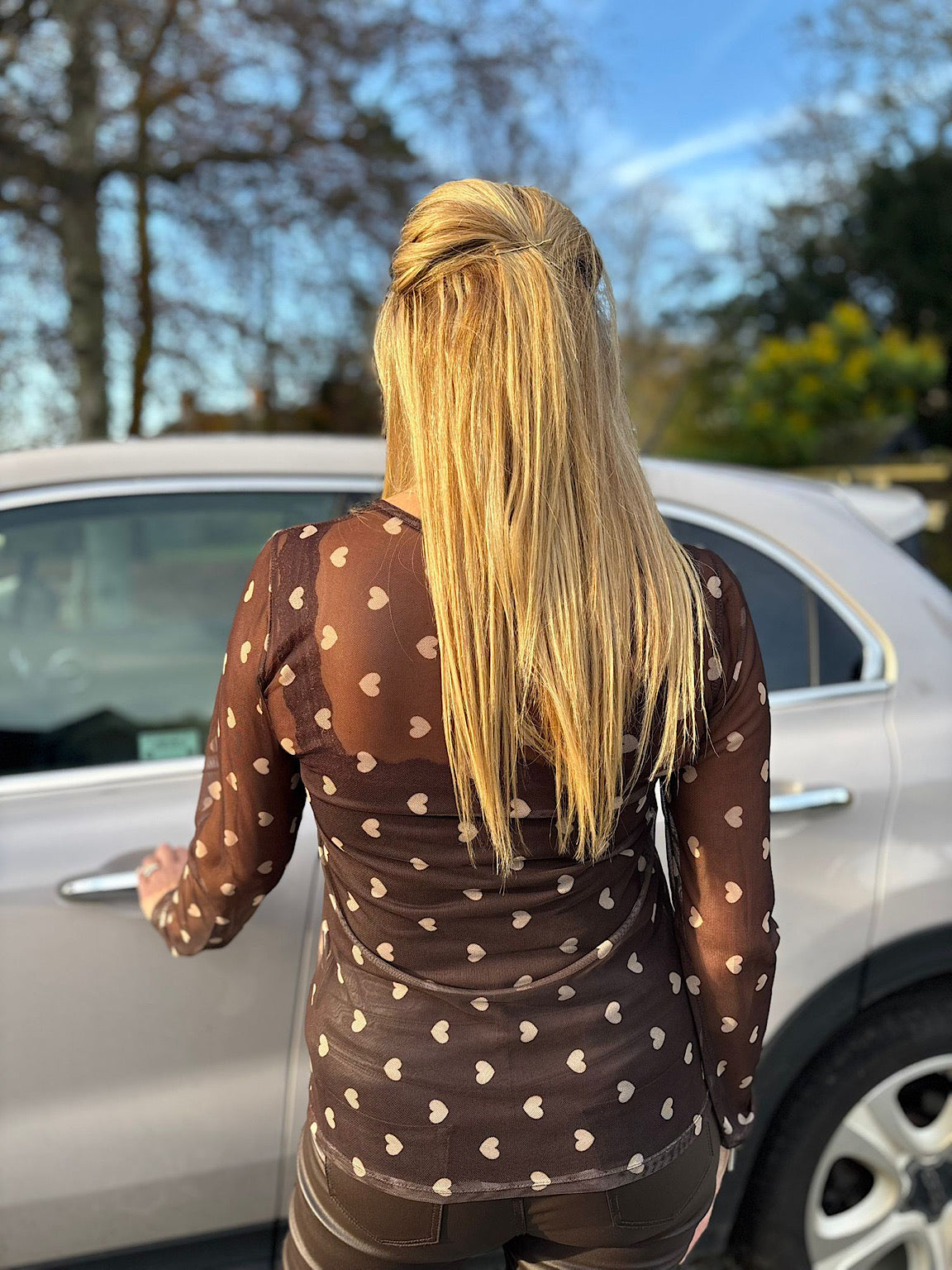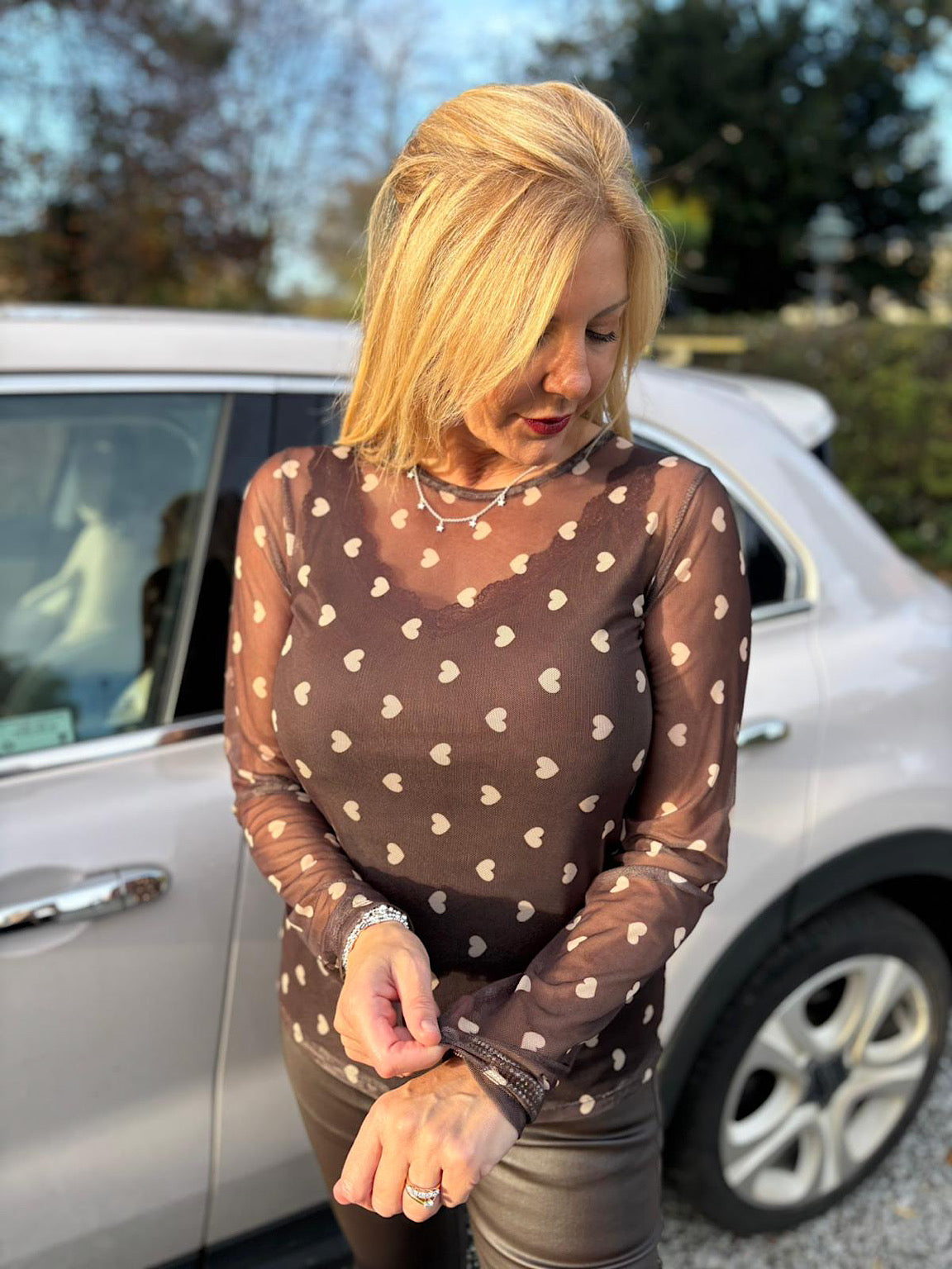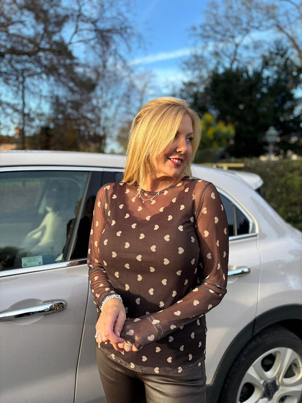 Embrace effortless style with this elegant mesh top, crafted from lightweight mesh fabric adorned with a charming printed heart design. The breathable mesh construction keeps you comfortable throughout the day, while the romantic heart pattern adds a touch of personality to your look. Layer it over your favourite basics for a contemporary, fashion-forward appearance that celebrates your individual style.