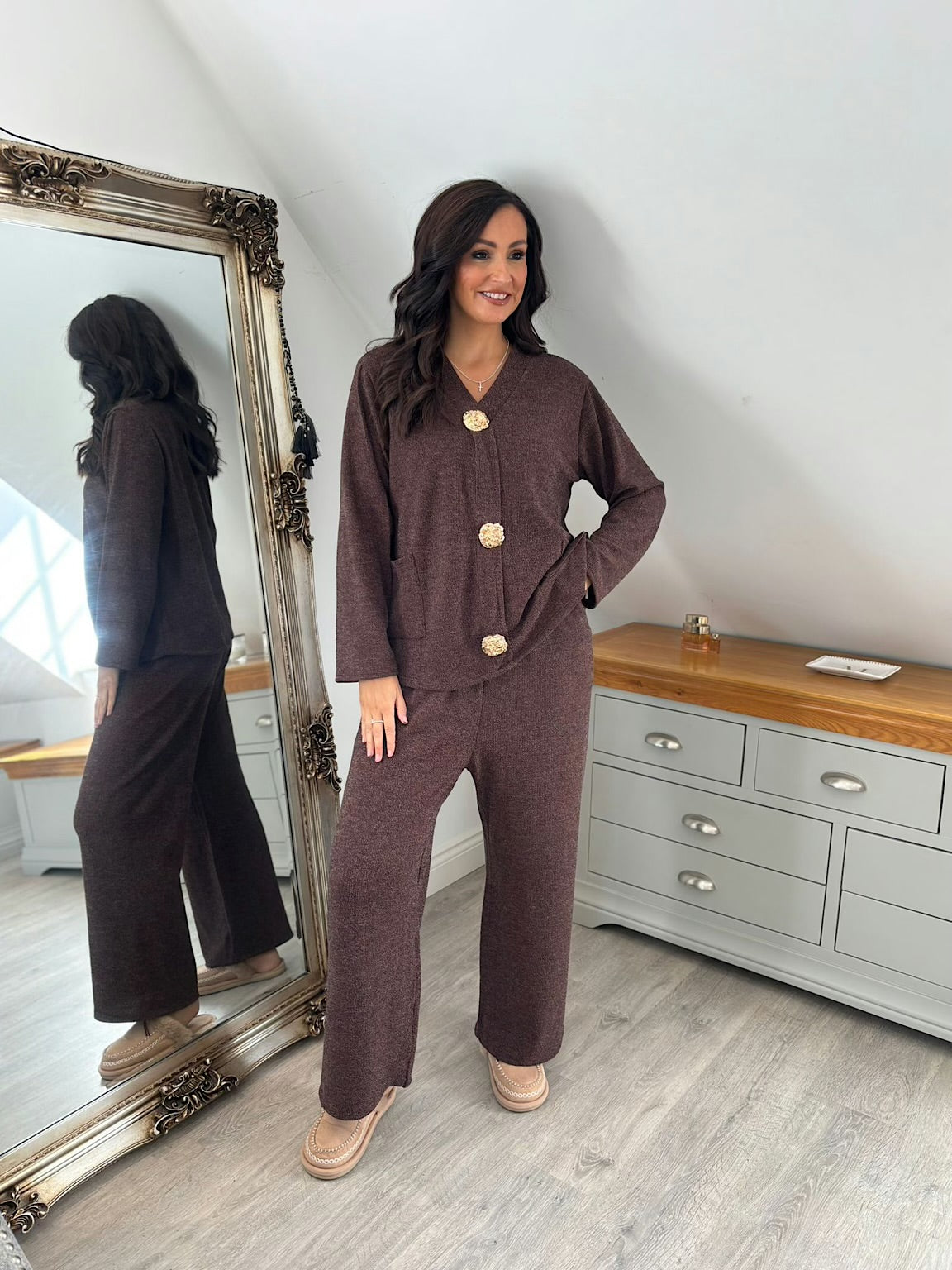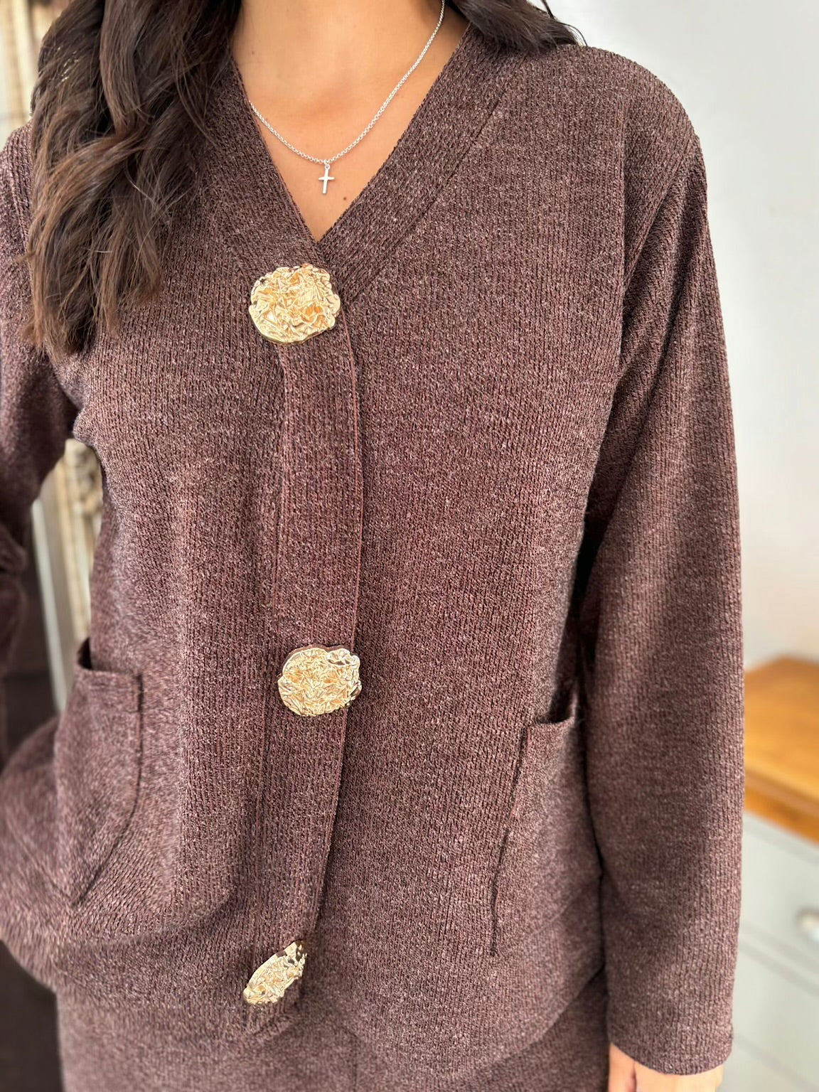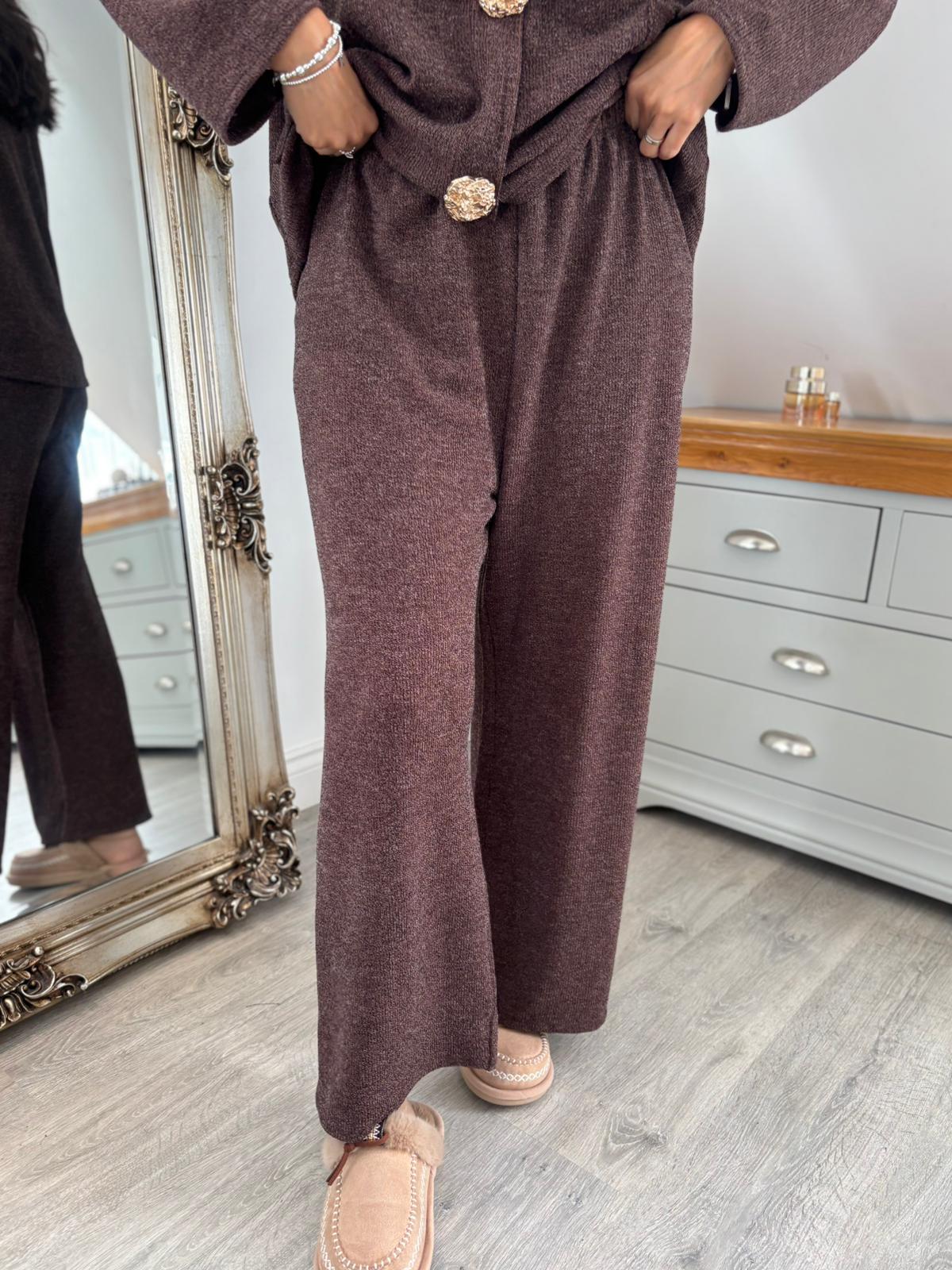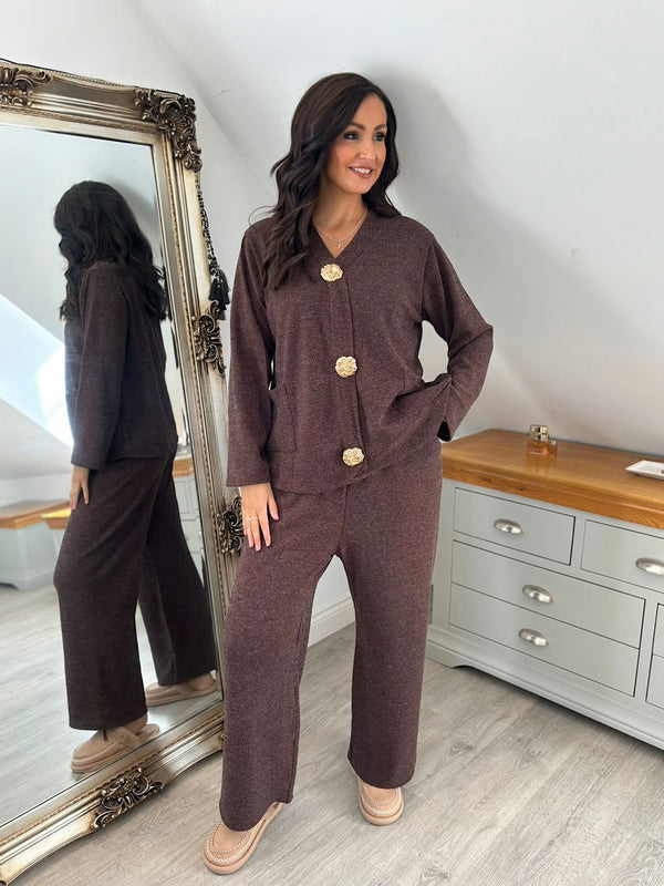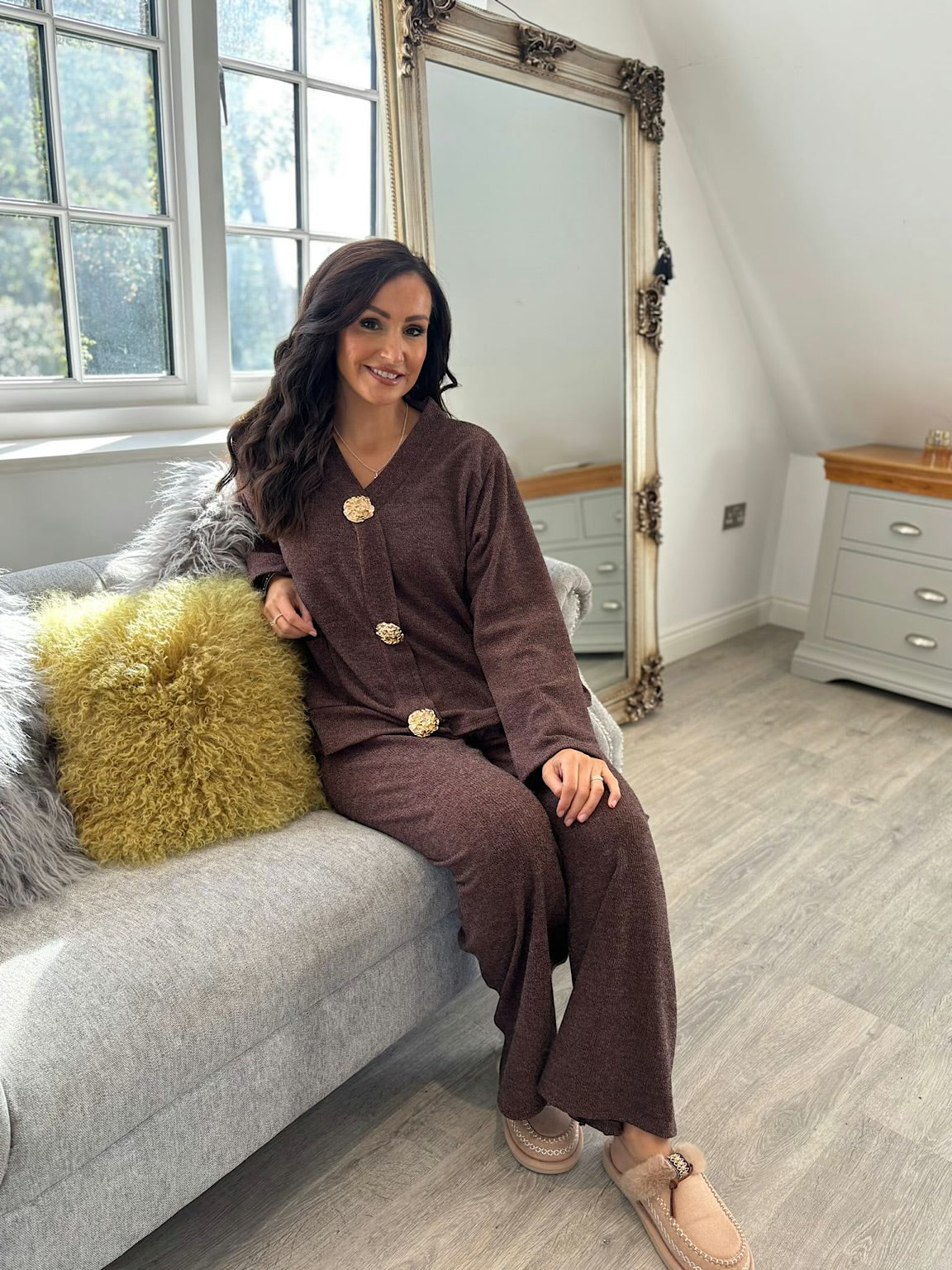 Elevate your wardrobe with the Knitted Top and Trouser Set Evie, featuring a refined knit design for a comfortable yet polished look. This sophisticated set is accented by large gold brooches that add a touch of elegance and are conveniently removable, allowing for versatile styling options. Perfect for both relaxed and upscale occasions, this set combines effortless style with thoughtful detailing.