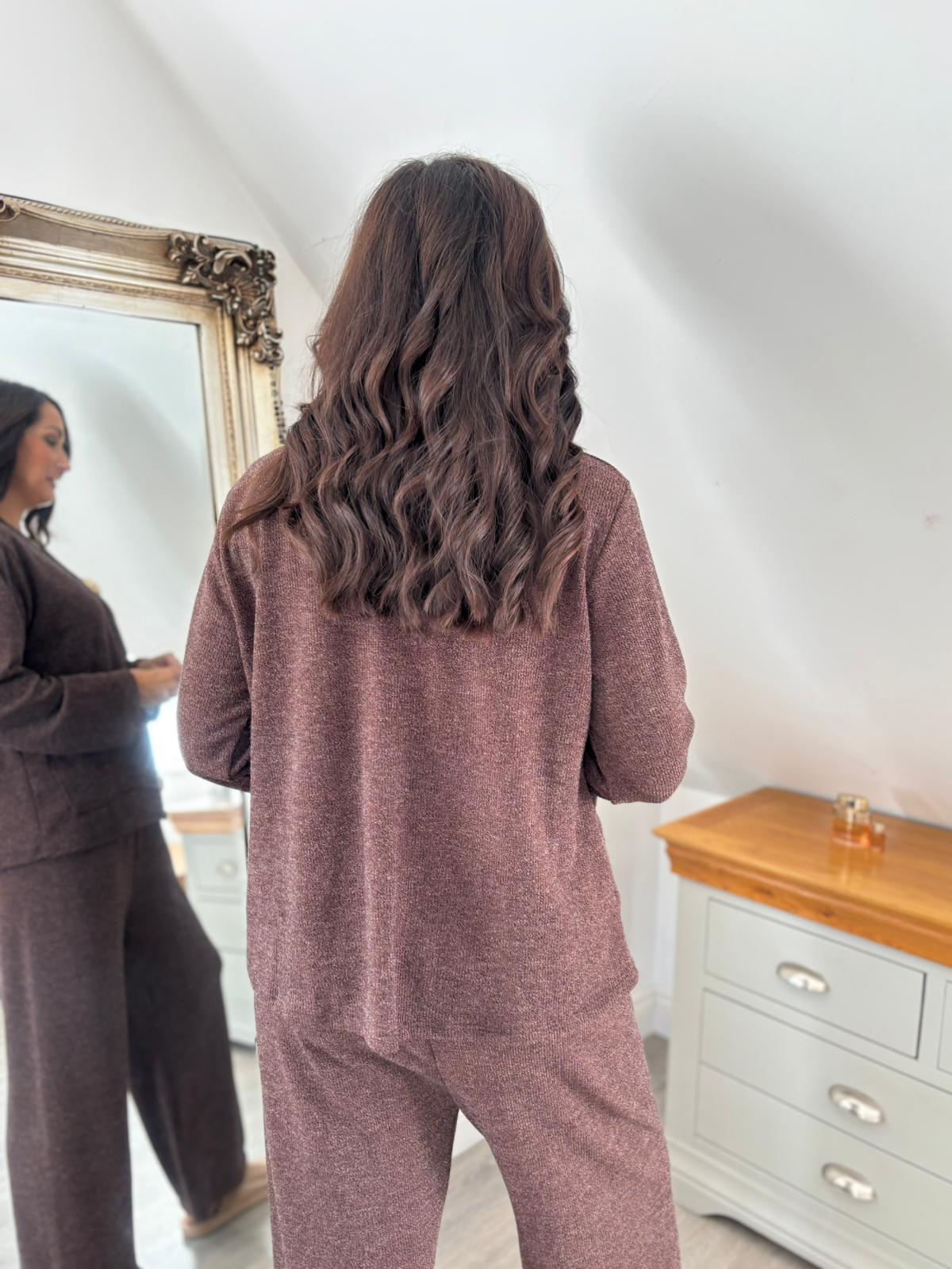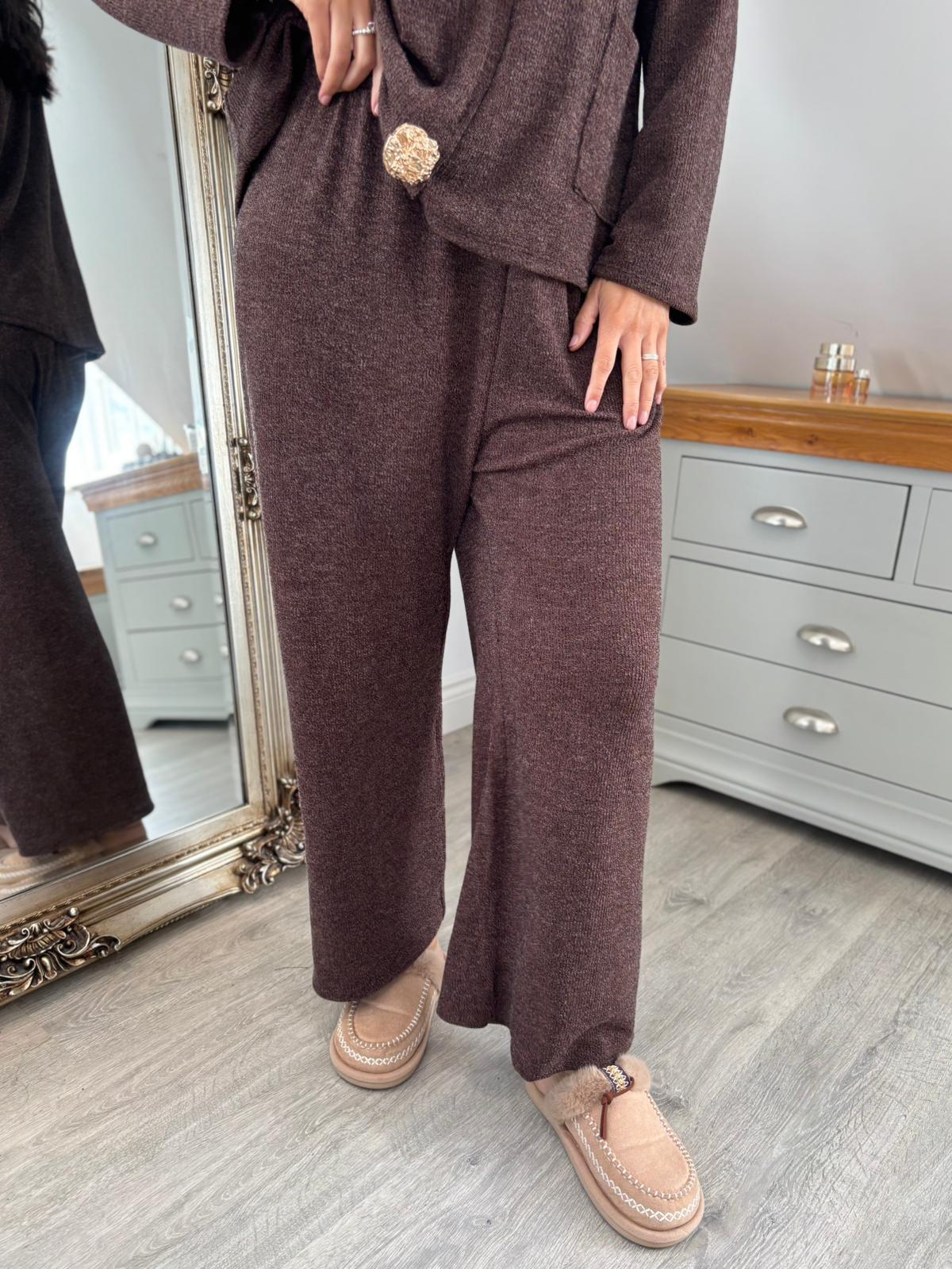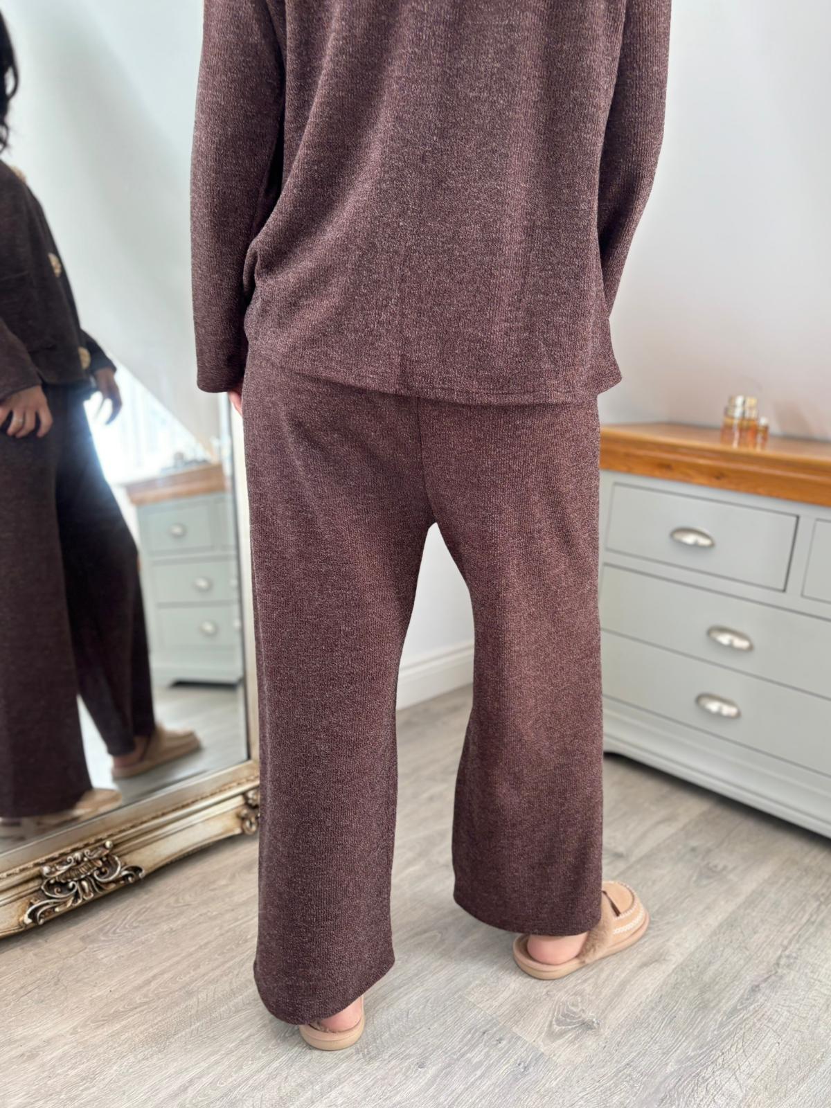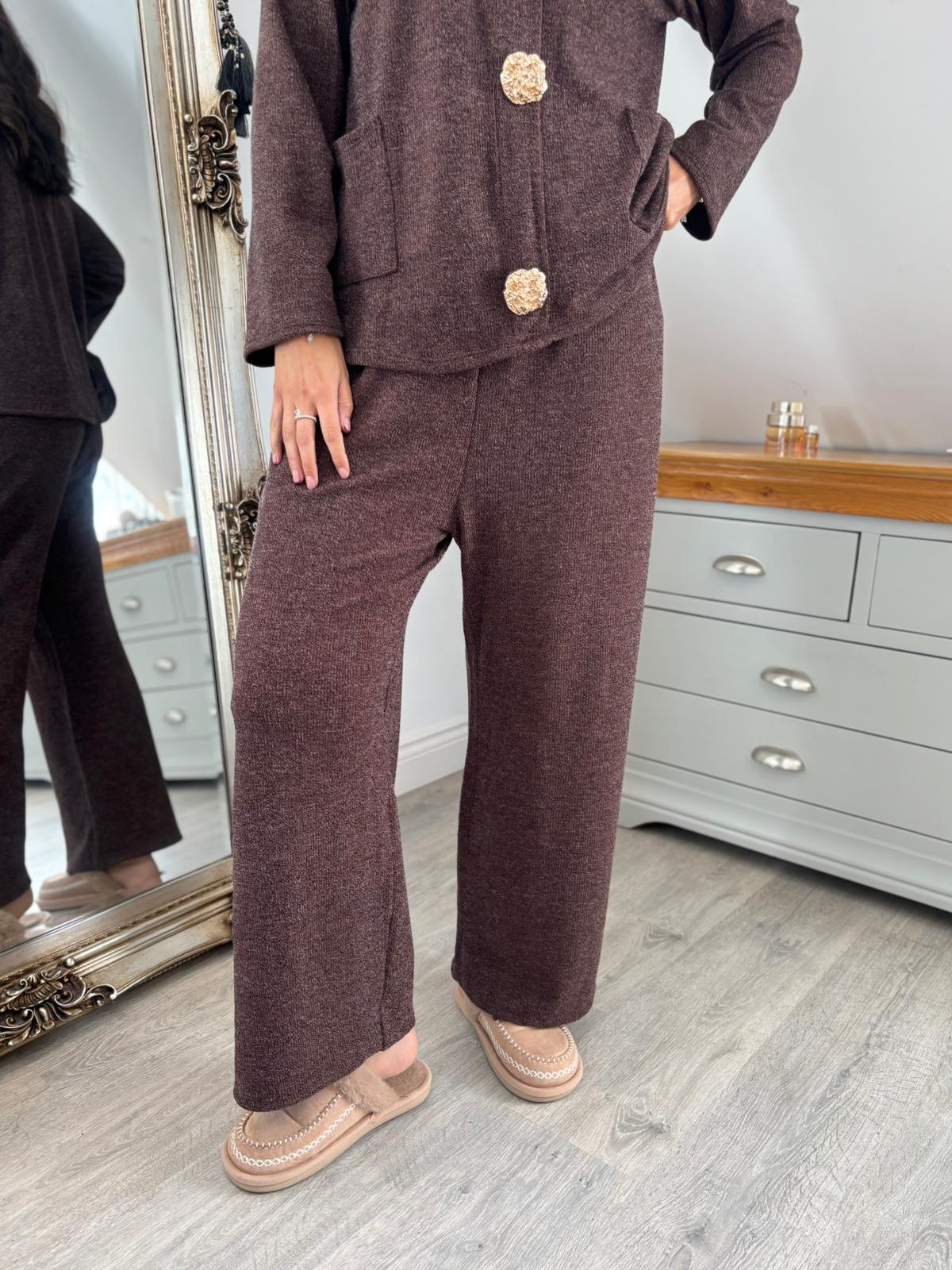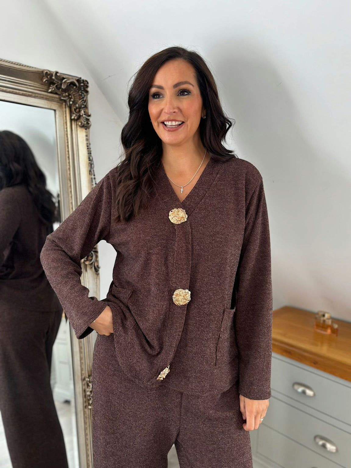 Elevate your wardrobe with the Knitted Top and Trouser Set Evie, featuring a refined knit design for a comfortable yet polished look. This sophisticated set is accented by large gold brooches that add a touch of elegance and are conveniently removable, allowing for versatile styling options. Perfect for both relaxed and upscale occasions, this set combines effortless style with thoughtful detailing.
