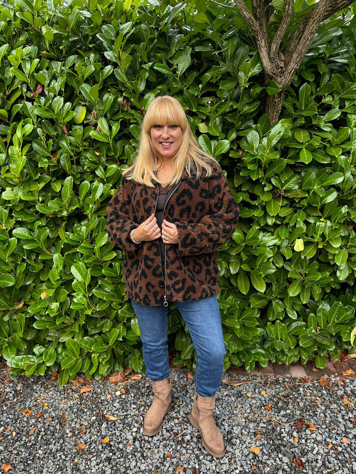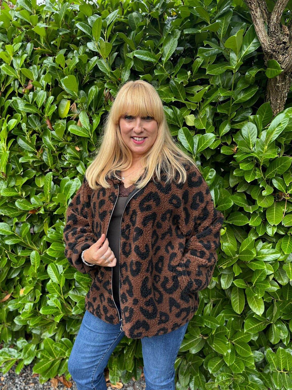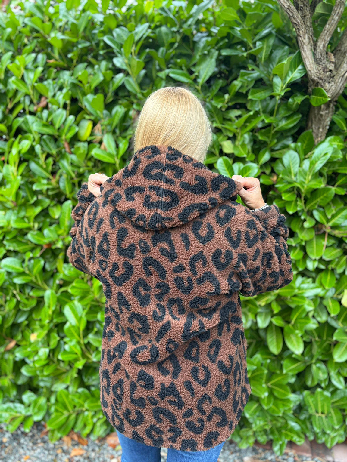 Stay cosy and stylish with the Leopard Fleece Jacket Jessica. Featuring a soft fleece fabric, a convenient zip-up front, and a snug hood, this jacket provides warmth and comfort for chilly days. Its playful leopard print adds a fun touch, making it perfect for casual outings or relaxing at home.
