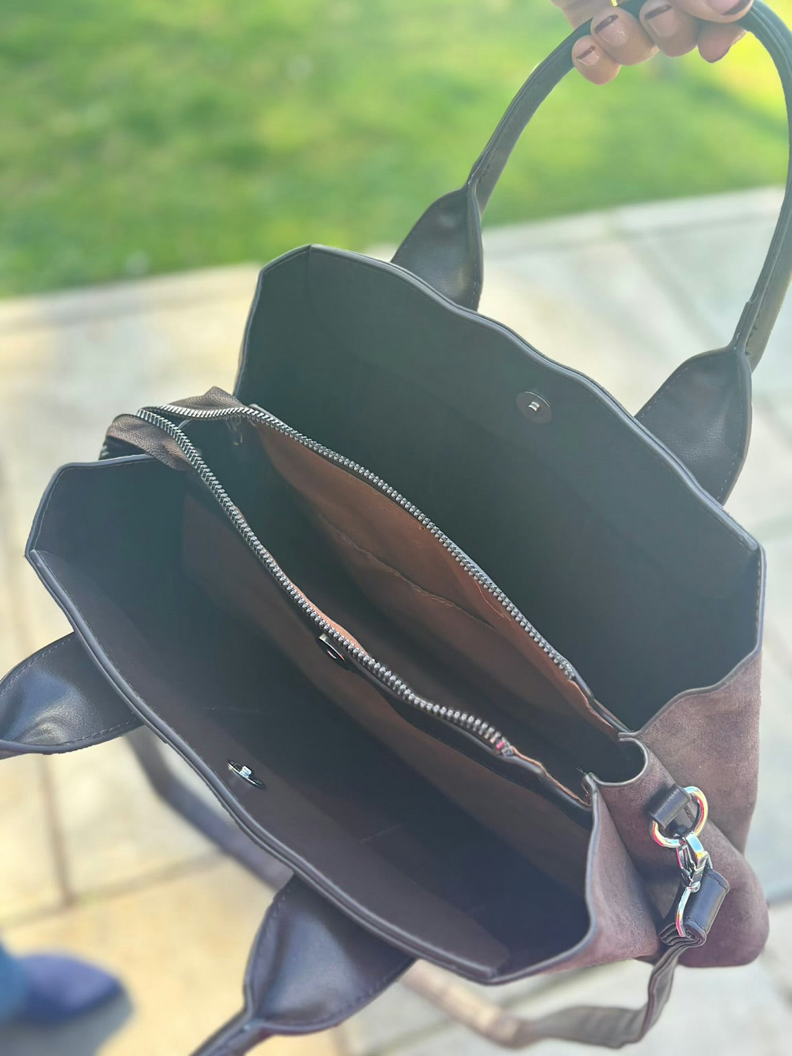 This Handbag combines soft faux suede with durable faux leather handles for a stylish yet reliable accessory. Designed with three main compartments, including a secure zippered middle section, it keeps your belongings well-organized and easily accessible. This handbag supports your daily needs with both functionality and elegance.