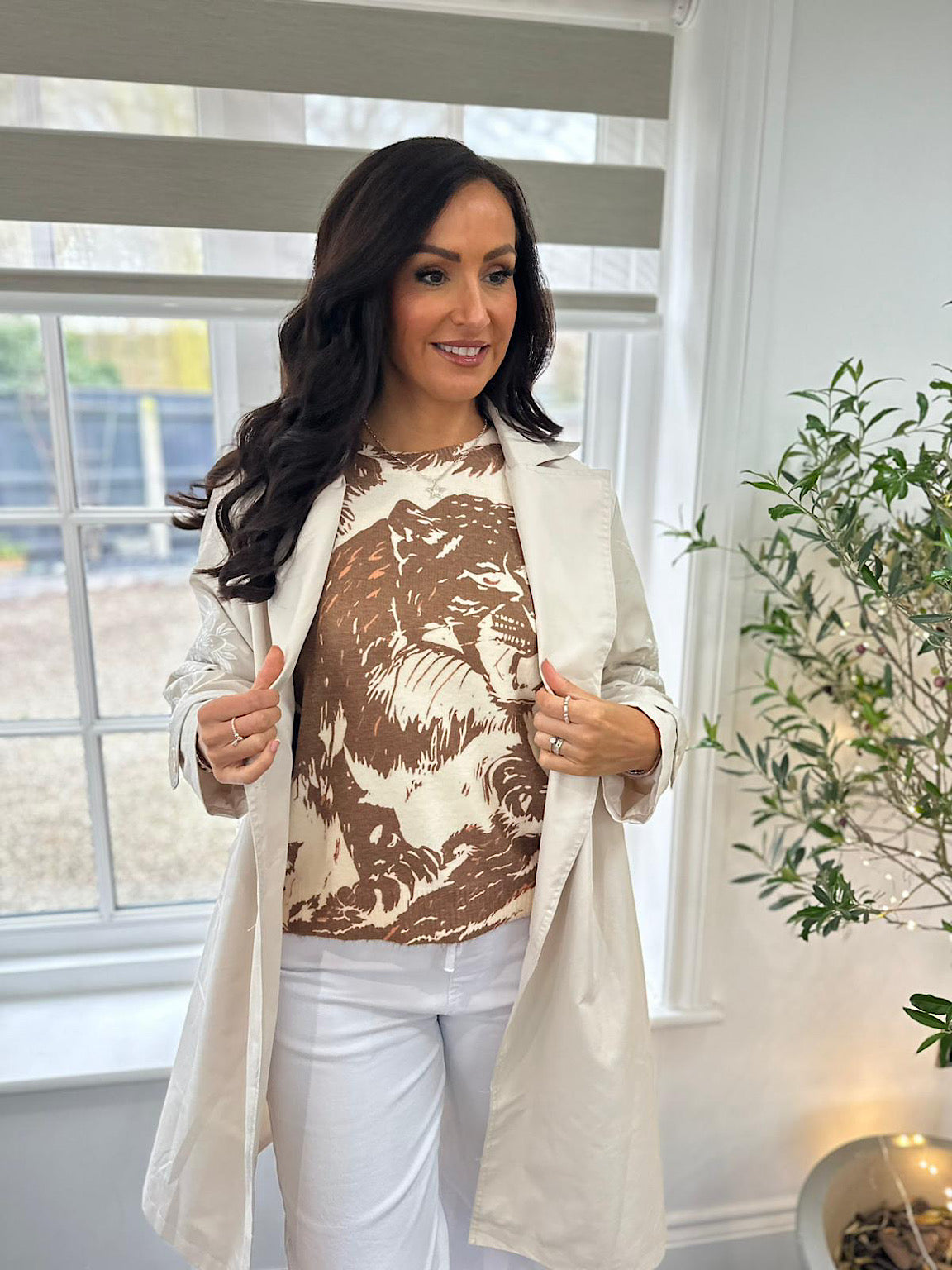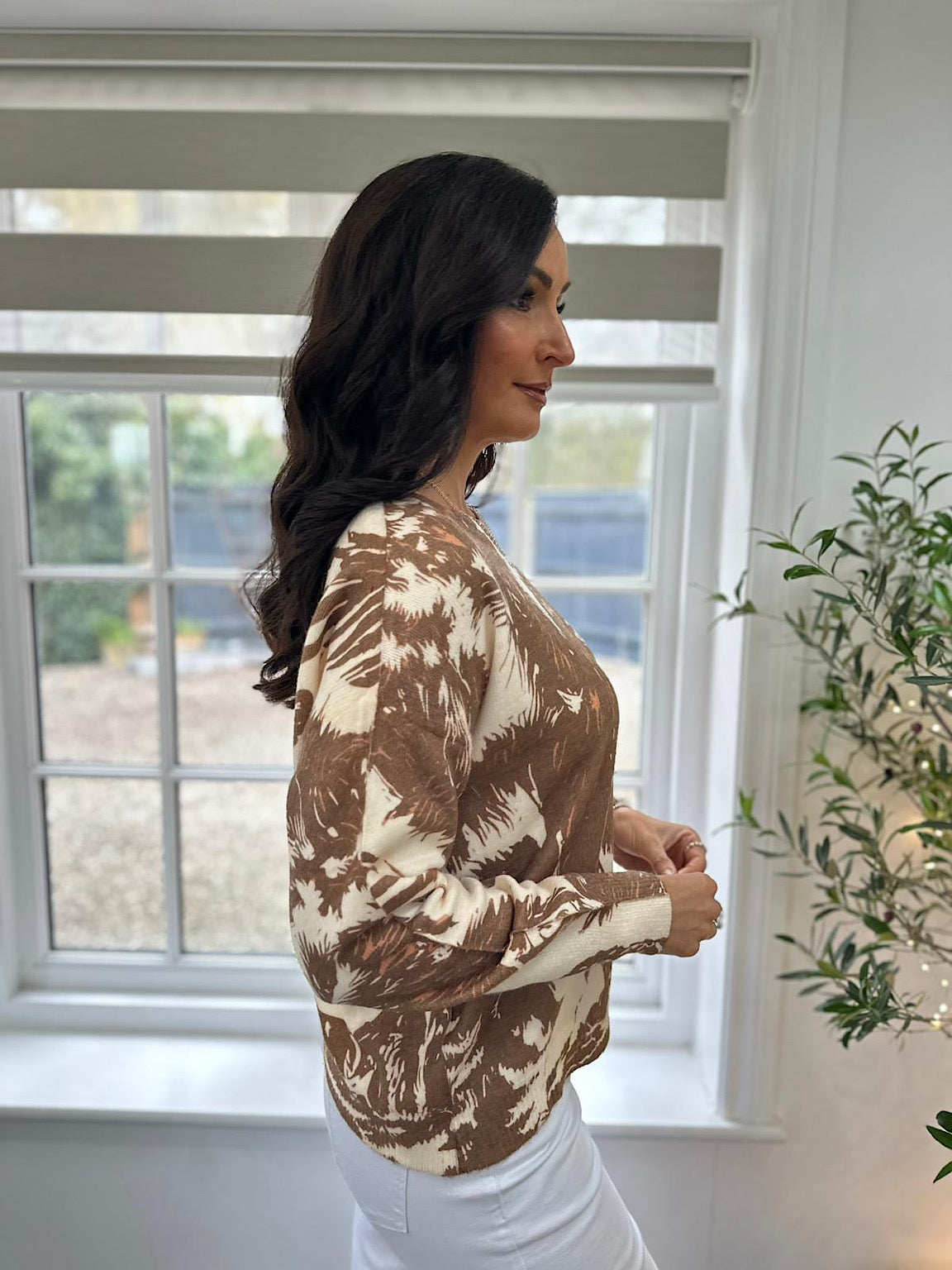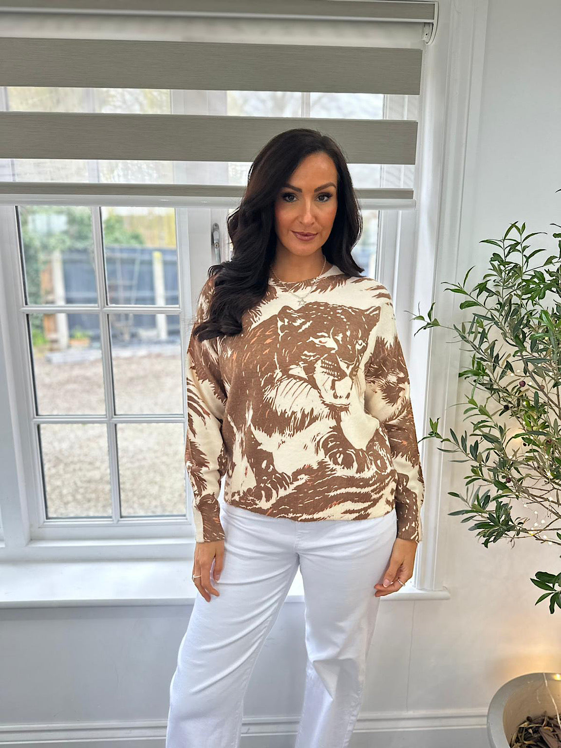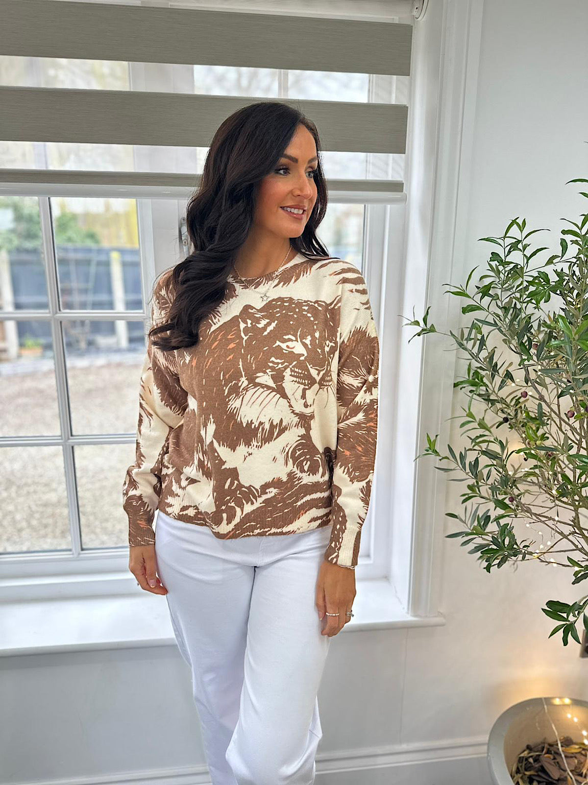Discover the perfect blend of comfort and style with this beautifully crafted knit. Featuring a striking chocolate nature print showcasing a leopard and safari design against a soft cream base, this piece brings warmth and character to your wardrobe. The luxuriously soft fabric feels wonderful against your skin, making it an ideal choice for layering or wearing solo. Whether you're dressing up or keeping it casual, this versatile knit effortlessly elevates any outfit with its sophisticated animal-inspired aesthetic.