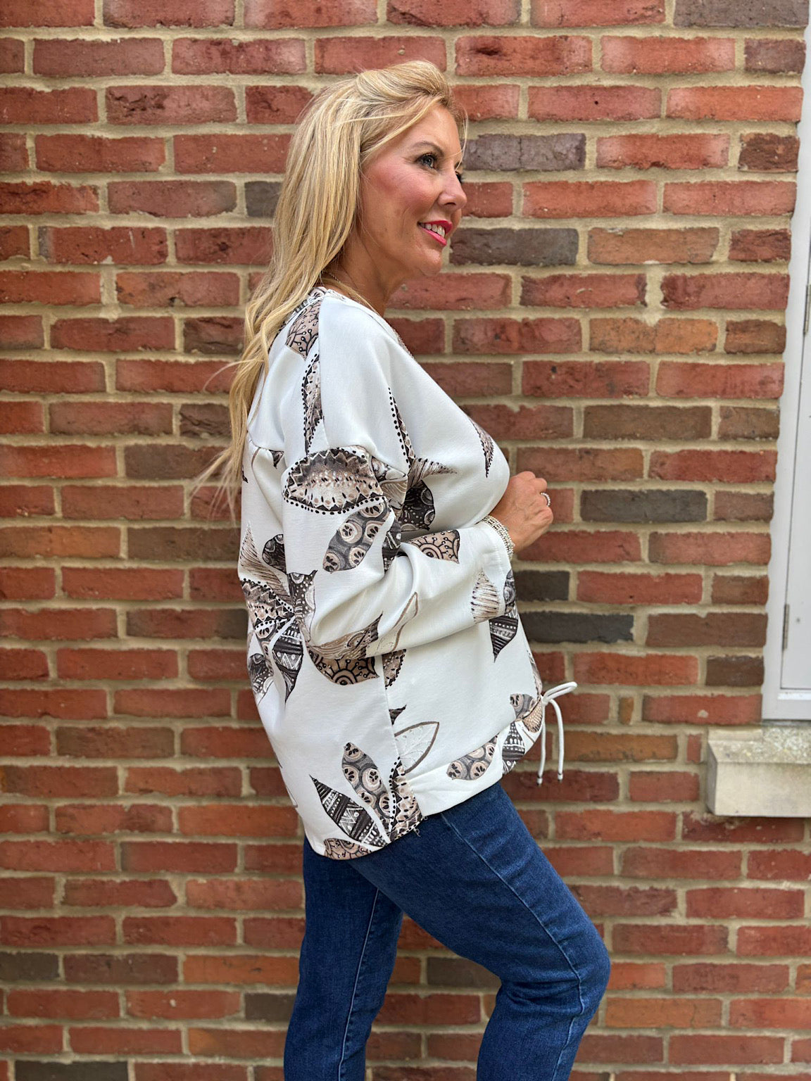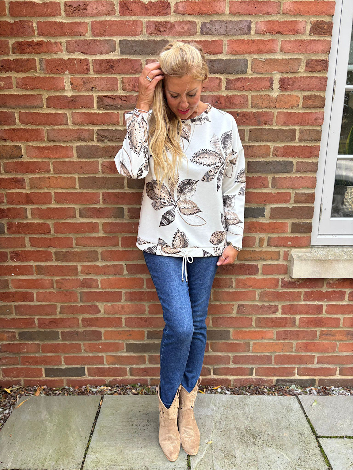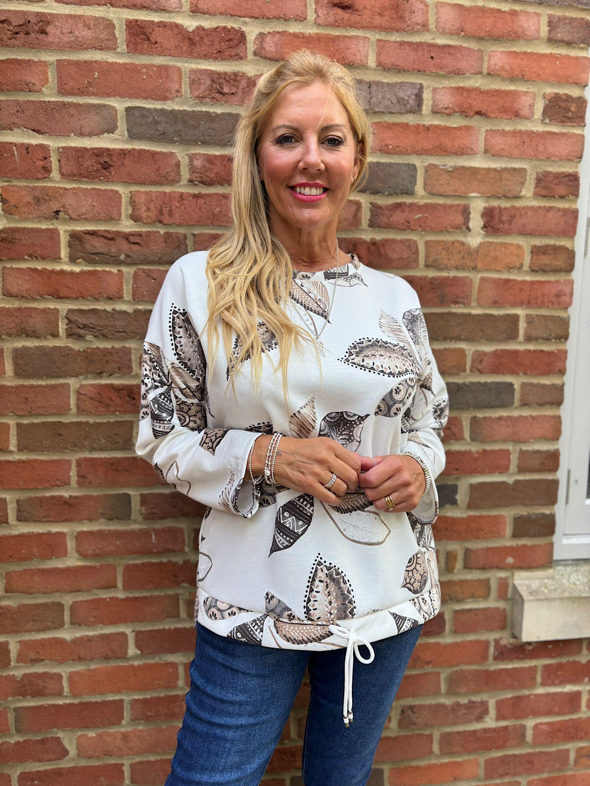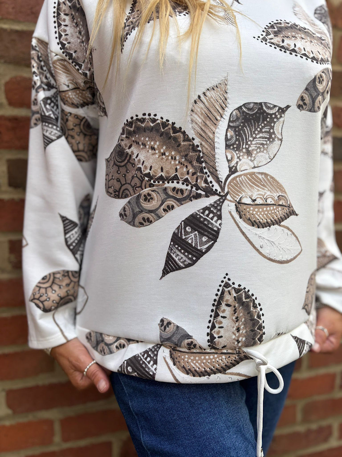Stay cosy and stylish with the Chocolate Patterned Leaf Sweat Top India. Featuring a comfortable fit and a convenient drawstring hem, this top lets you adjust the silhouette to your liking while keeping you warm. The leaf pattern adds a touch of nature-inspired charm, making it perfect for relaxed days or casual outings.