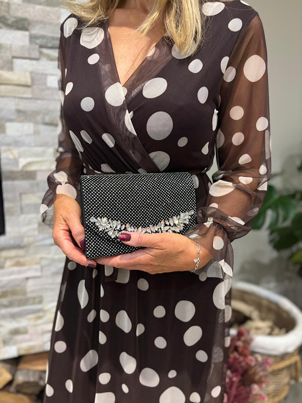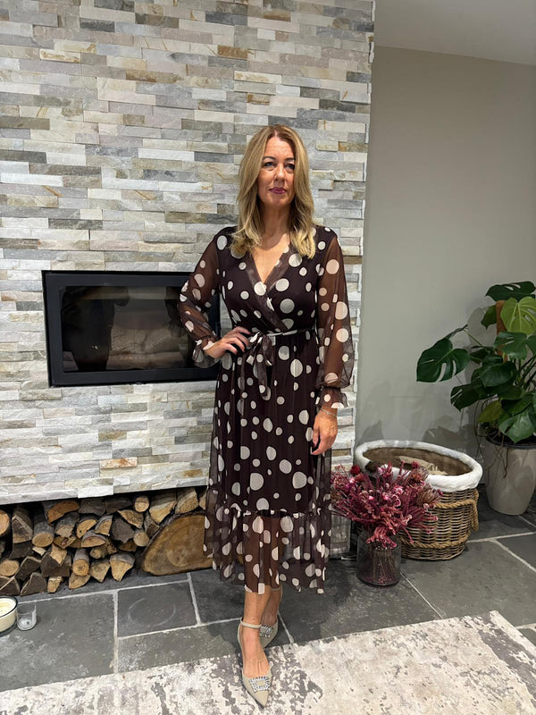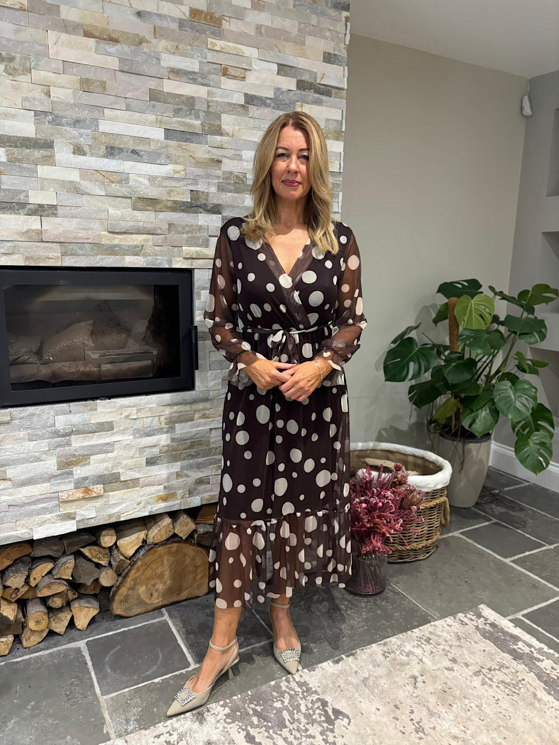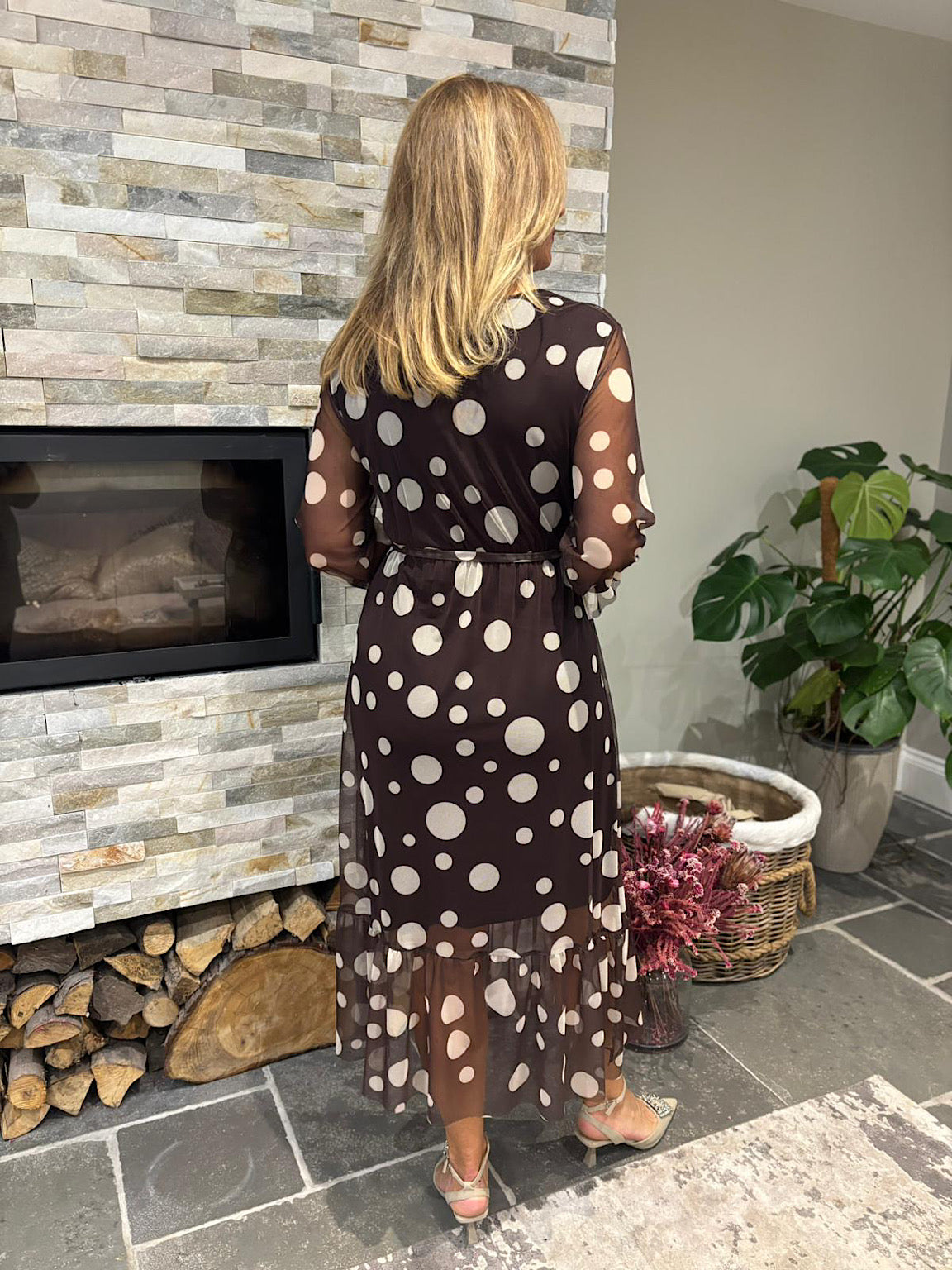 Chocolate Polka Dot Belted Mesh Dress Alana