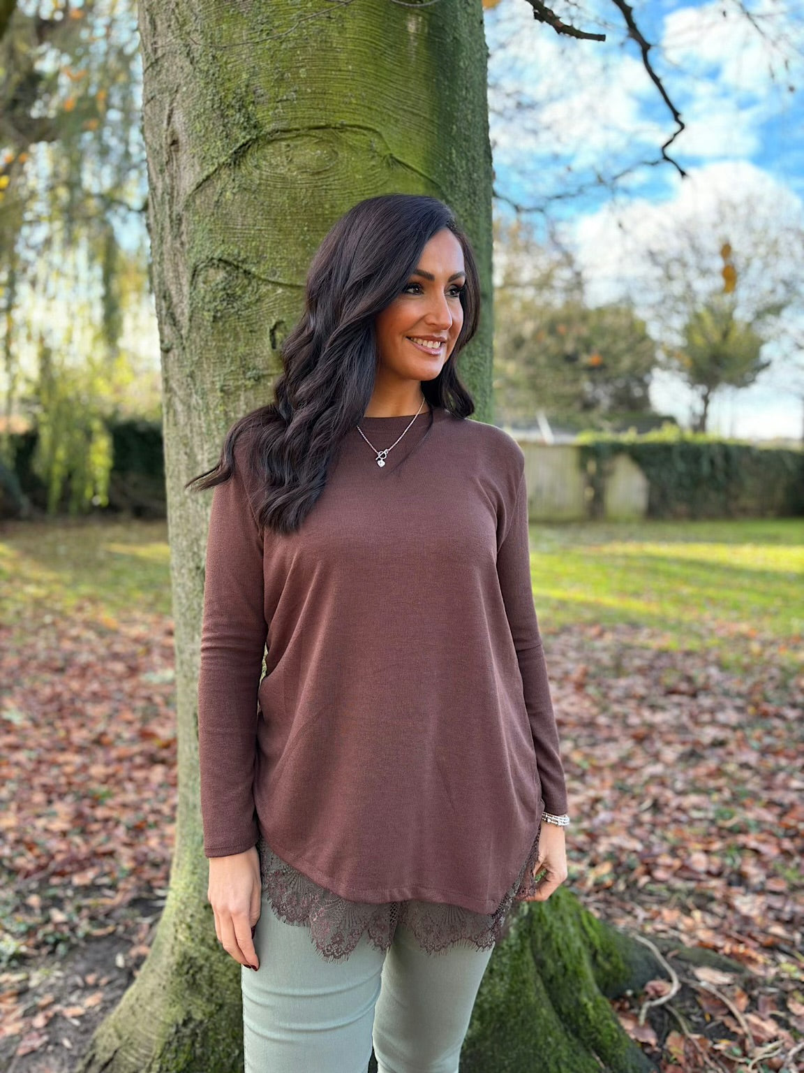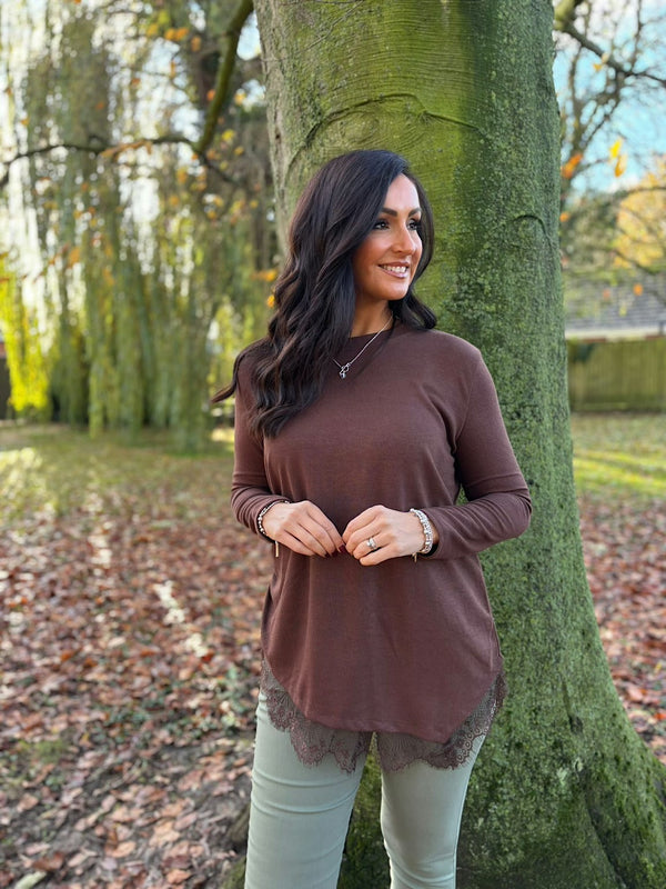 Chocolate Ruched Lace Trim Top Janet