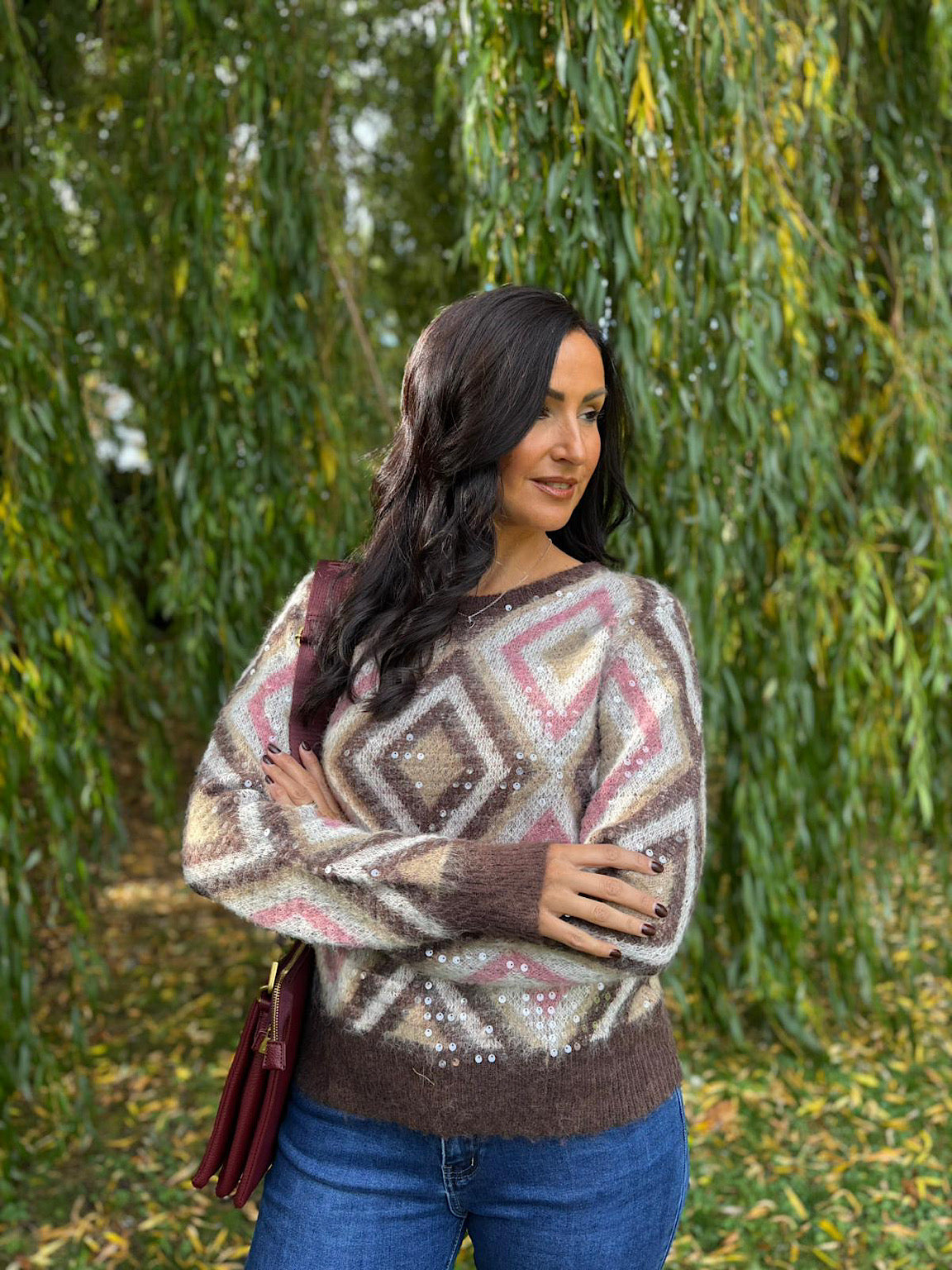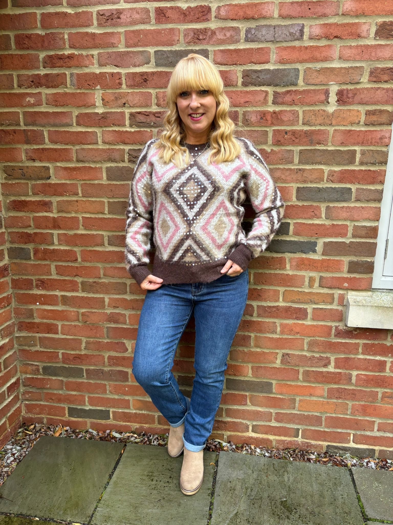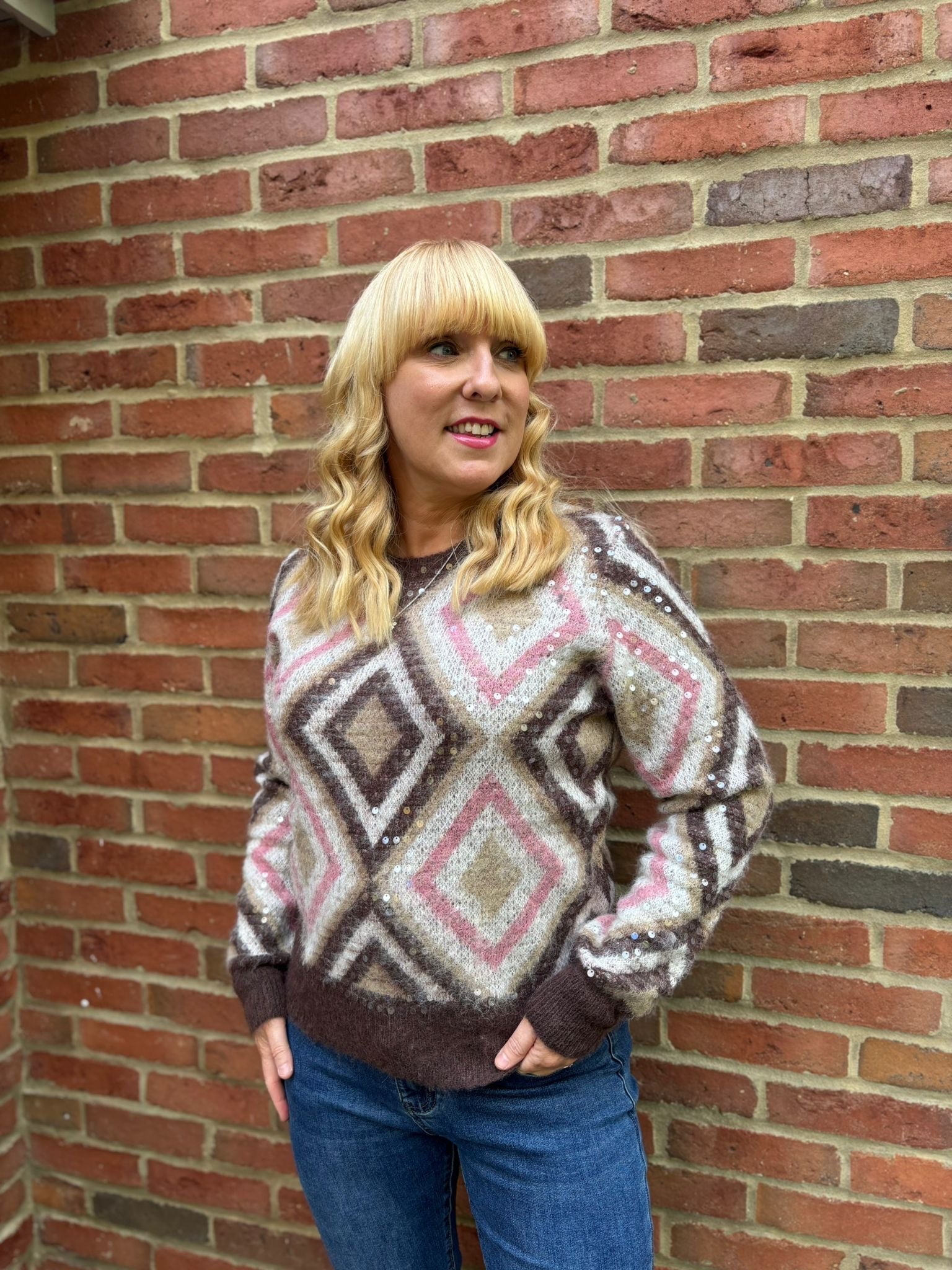 Wrap yourself in warmth and glamour with the Chocolate Sequin Diamond Knit Linda. Its lovely, soft fabric features a chic diamond pattern that adds subtle sparkle and texture. Perfect for cosy days or stylish evenings, this knit combines comfort with a touch of elegance to keep you feeling confident and snug.