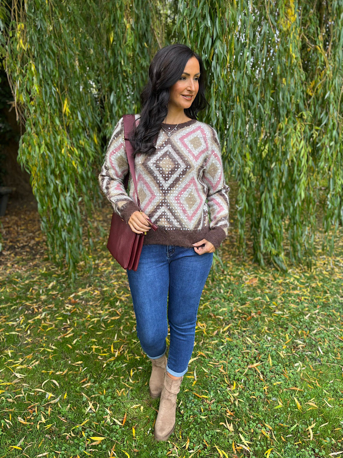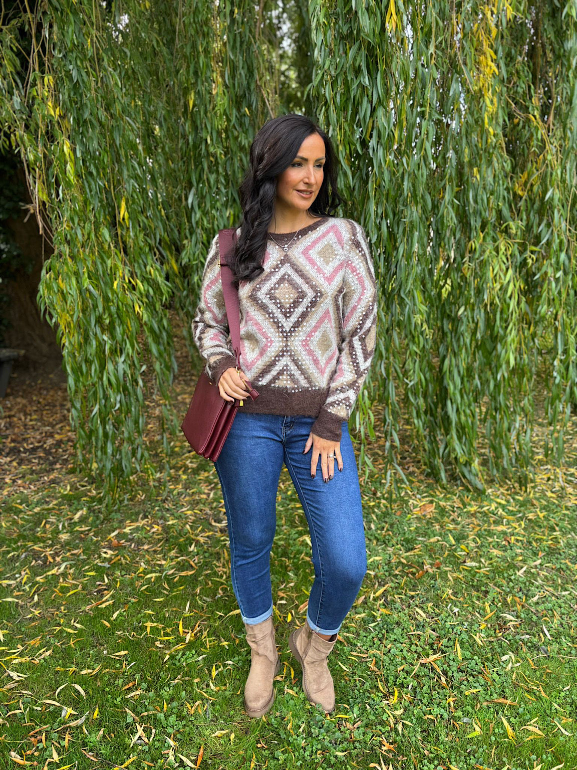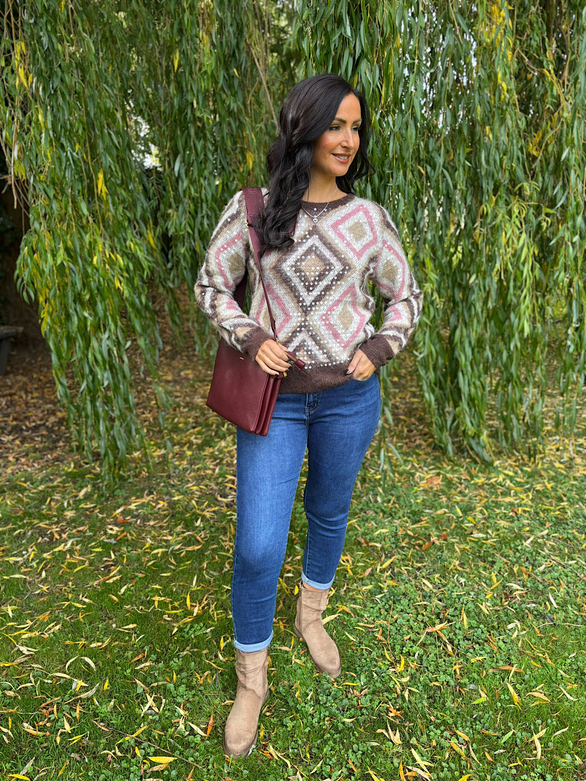 Wrap yourself in warmth and glamour with the Chocolate Sequin Diamond Knit Linda. Its lovely, soft fabric features a chic diamond pattern that adds subtle sparkle and texture. Perfect for cosy days or stylish evenings, this knit combines comfort with a touch of elegance to keep you feeling confident and snug.