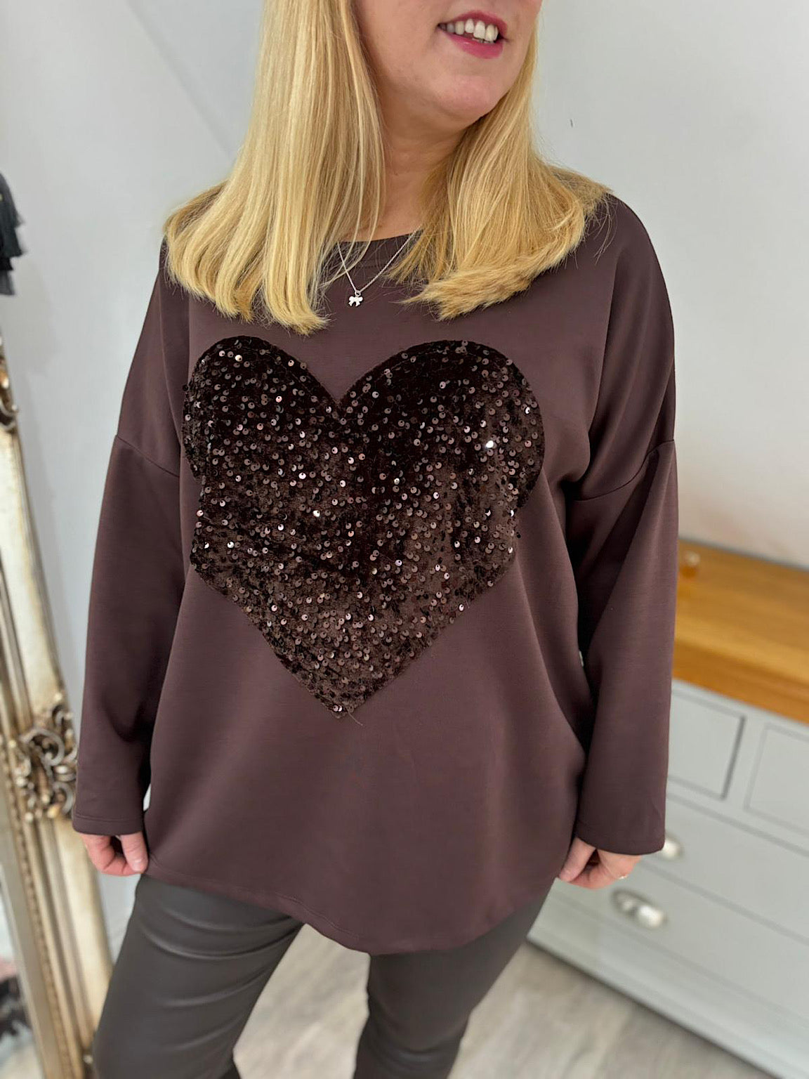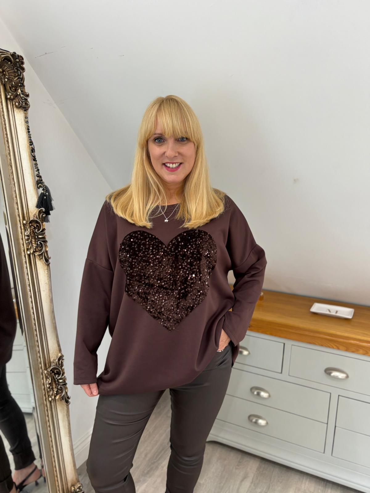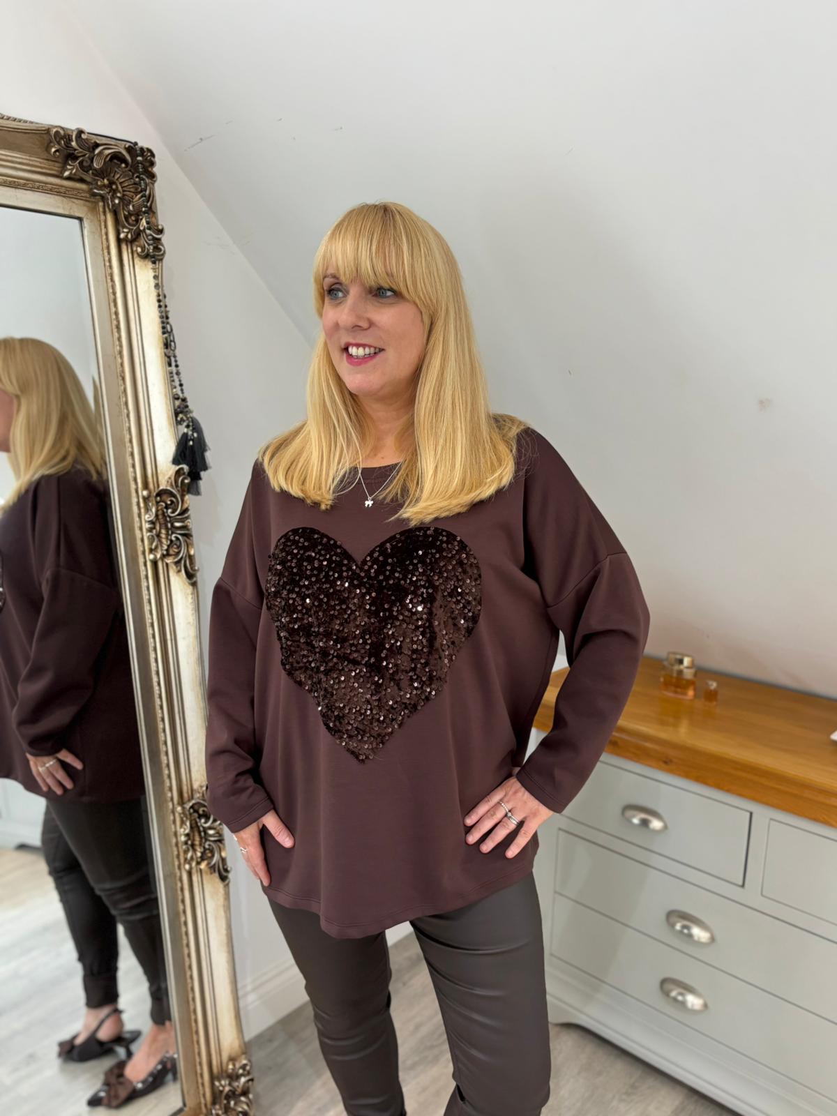 The Sequin Heart Sweat Top Sara offers cosy comfort with a soft velour heart embellished with delicate sequins, adding a touch of sparkle. Inspired by the Esme collection, this sweat top brings warmth and subtle glamour to your everyday look, supporting both style and ease.