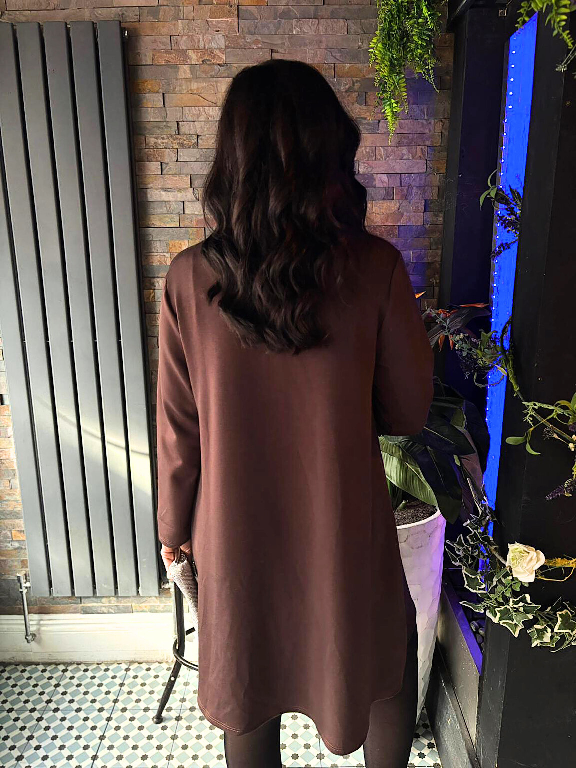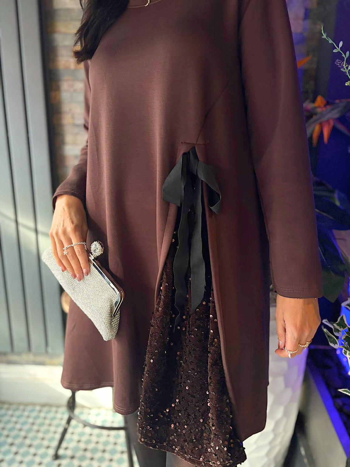 This Sequin Panel Sweatshirt Dress Olive features a smooth, soft fabric reminiscent of our Esme Collection. Its standout detail is a delicate ribbon accent set against a velour sequin panel, offering subtle sparkle and texture. Designed for comfort and style, this dress is perfect for those seeking a cosy yet refined look.