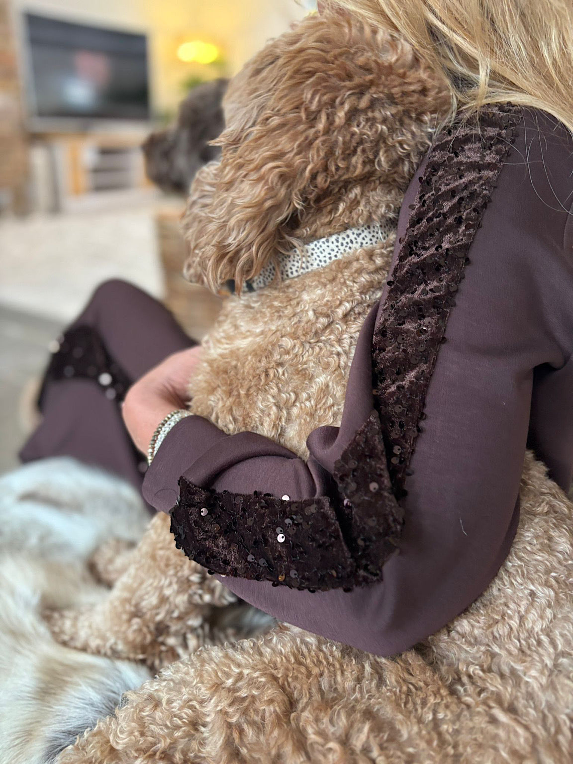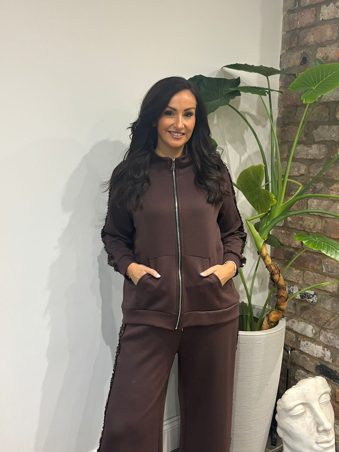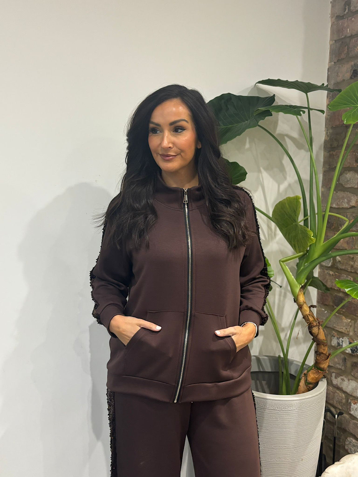 Indulge in the luxurious softness of this Sequin Velour Trim Jacket, inspired by our beloved Esme collection. Featuring a chic high neck and smooth zip fastening, it showcases eye-catching velour sequin panels running down the arms for added glamour. The perfect companion to our Trixie joggers, this jacket effortlessly elevates any casual ensemble with its sophisticated blend of comfort and style.