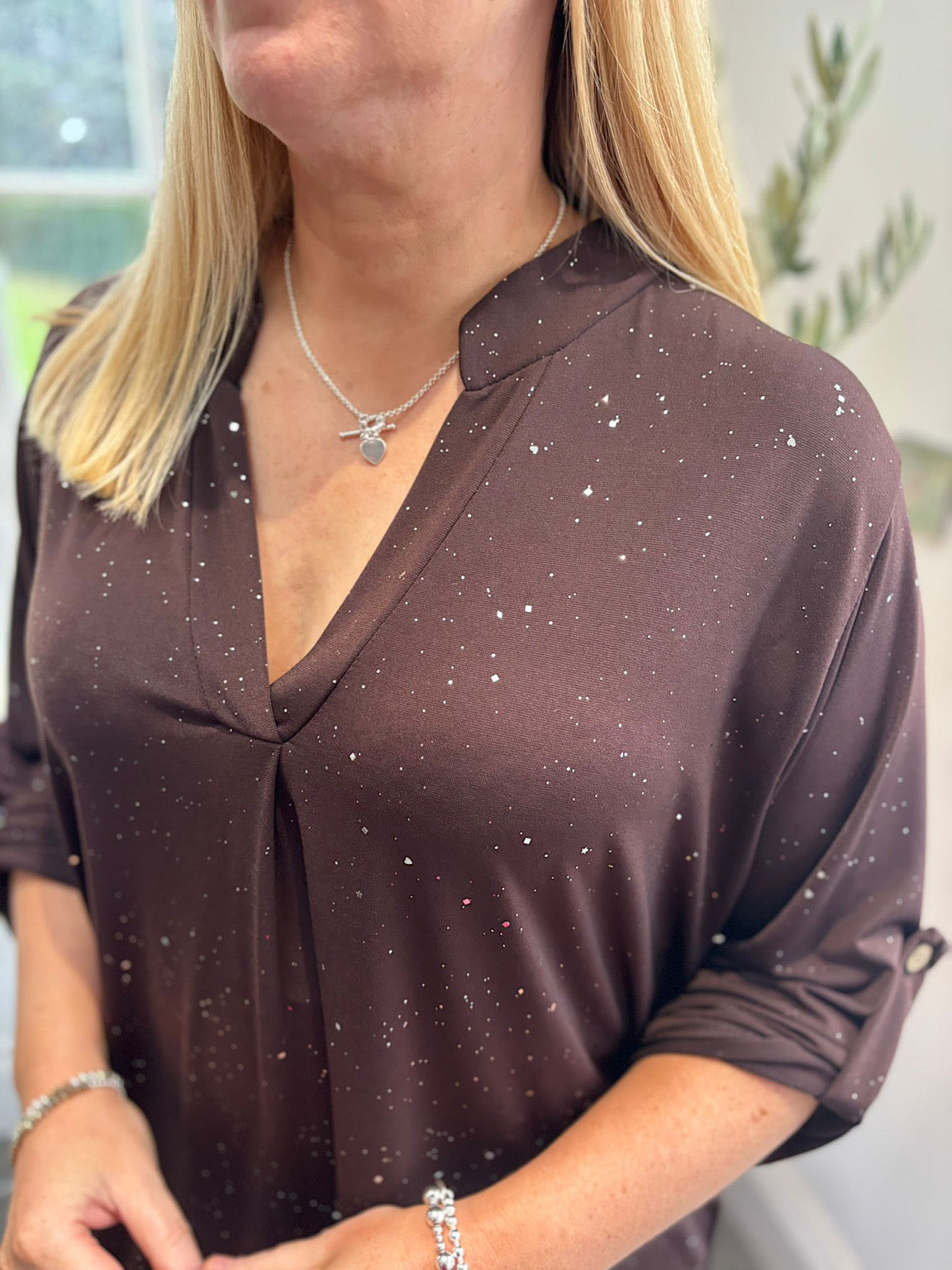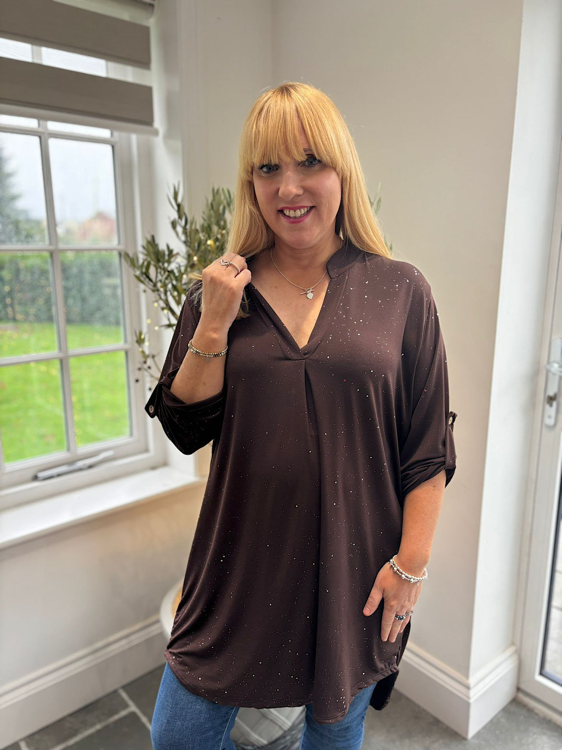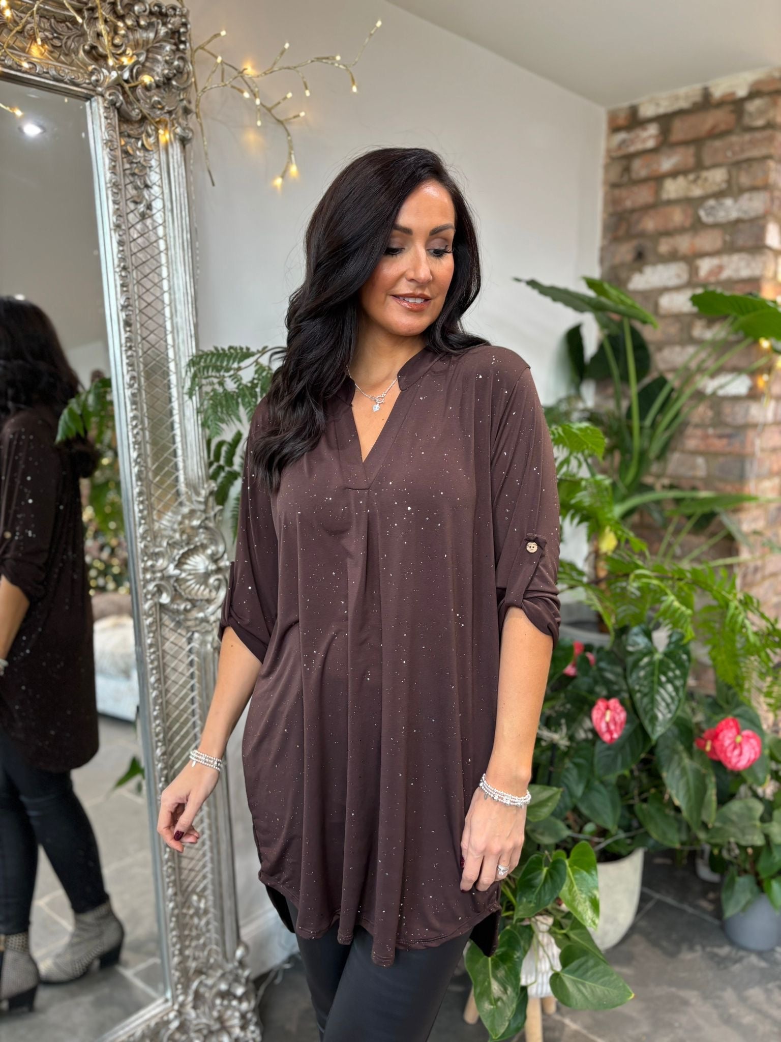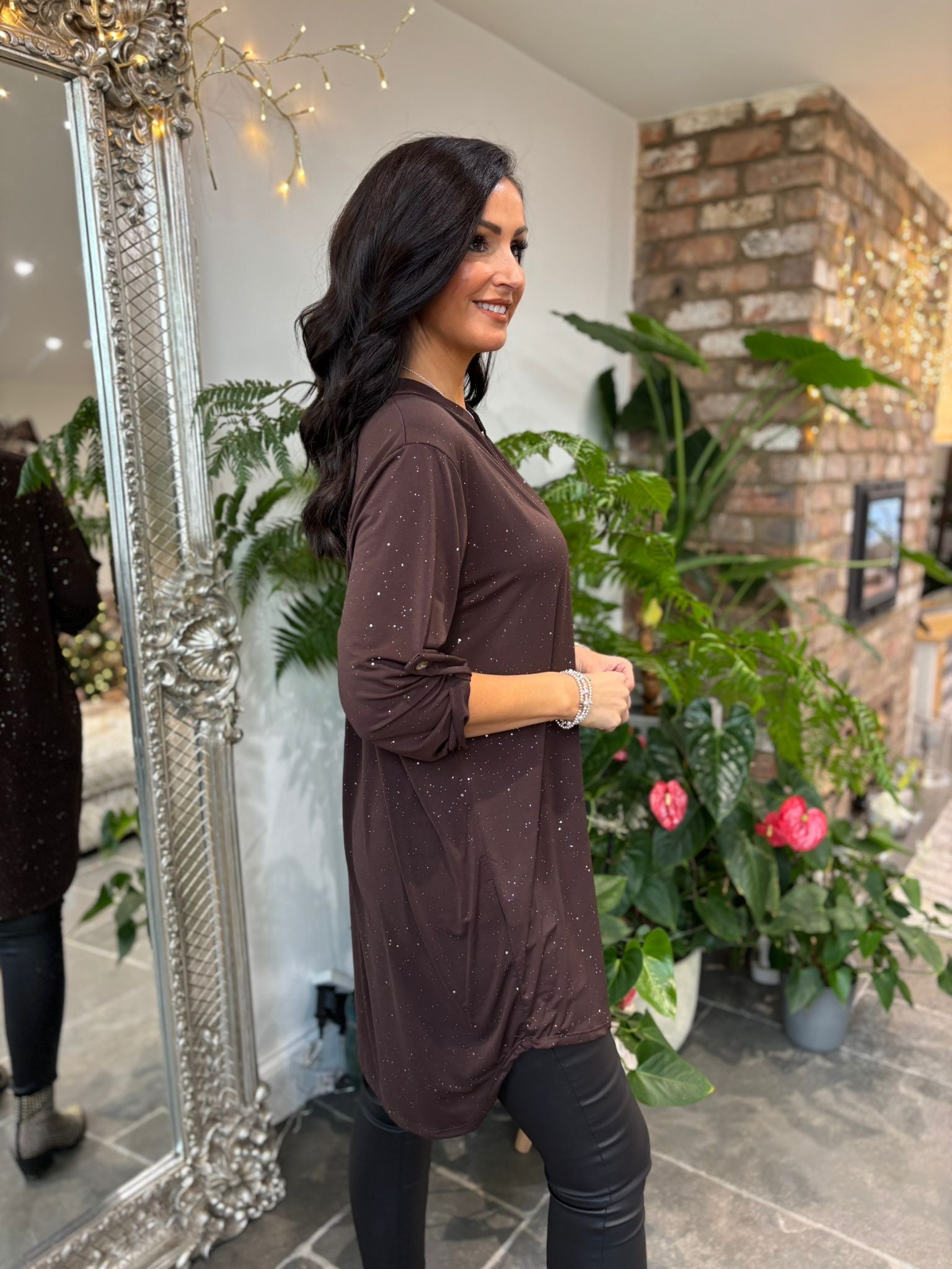 Meet the Sparkle Tunic Gloria—your go-to piece. This beloved tunic style gets a glamorous upgrade with subtle sparkle detailing that catches the light beautifully. Featuring long sleeves with a clever button feature, you can easily adjust the length to suit your mood and the occasion. Versatile, comfortable, and just the right amount of shine.