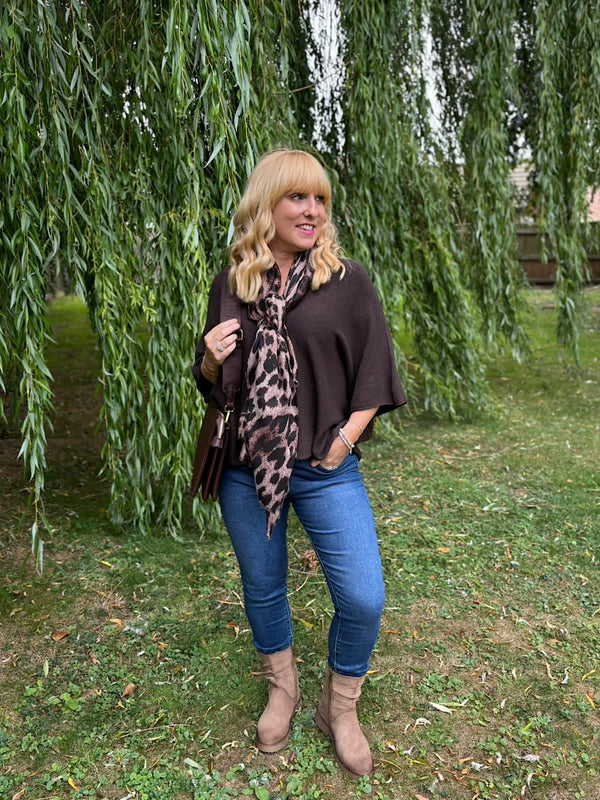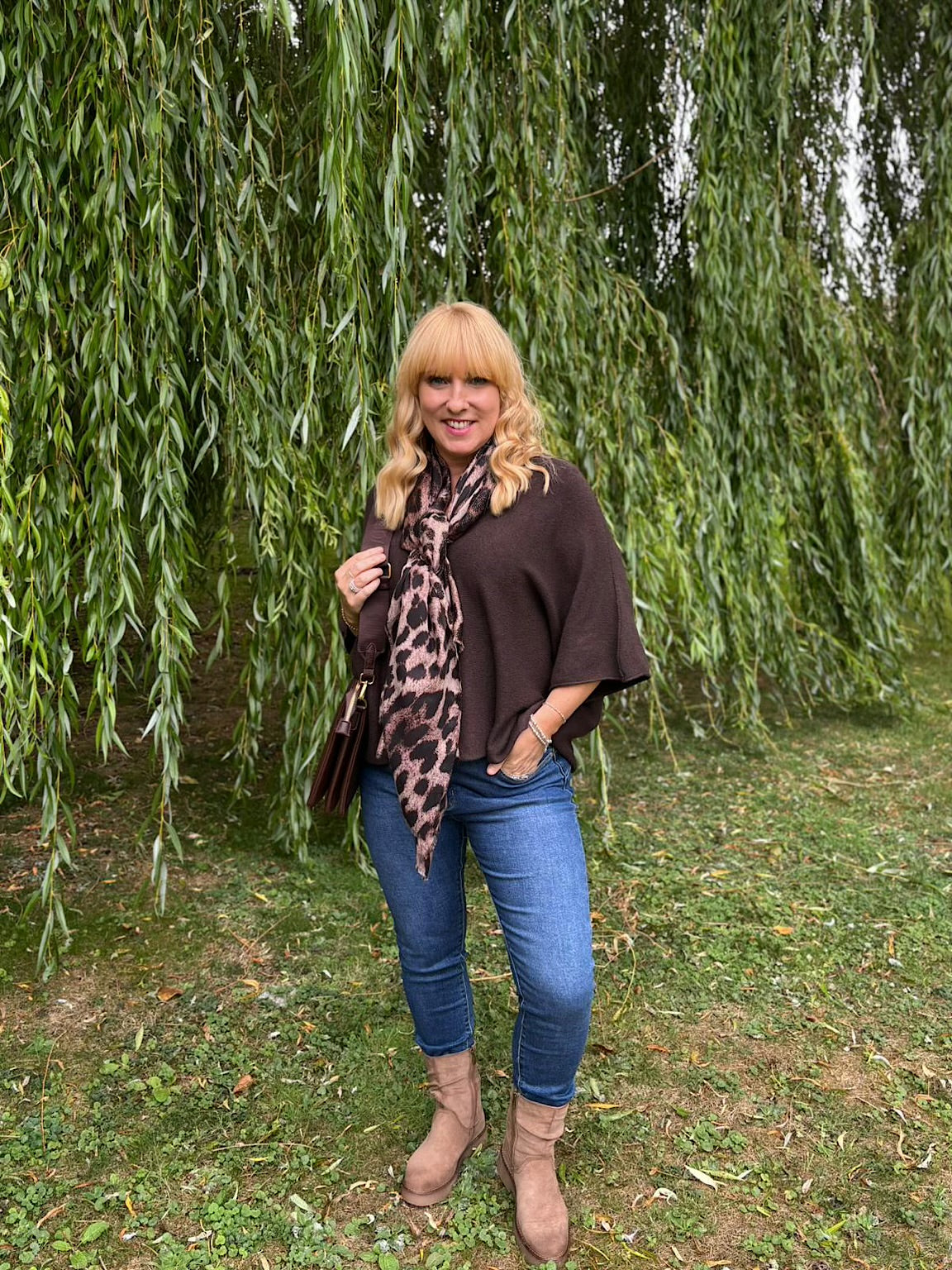 Styled with.......> Chocolate Gold Fleck Leopard Scarf / Mocha Chunky Ruched Boots / Denim Straight Leg Jeans