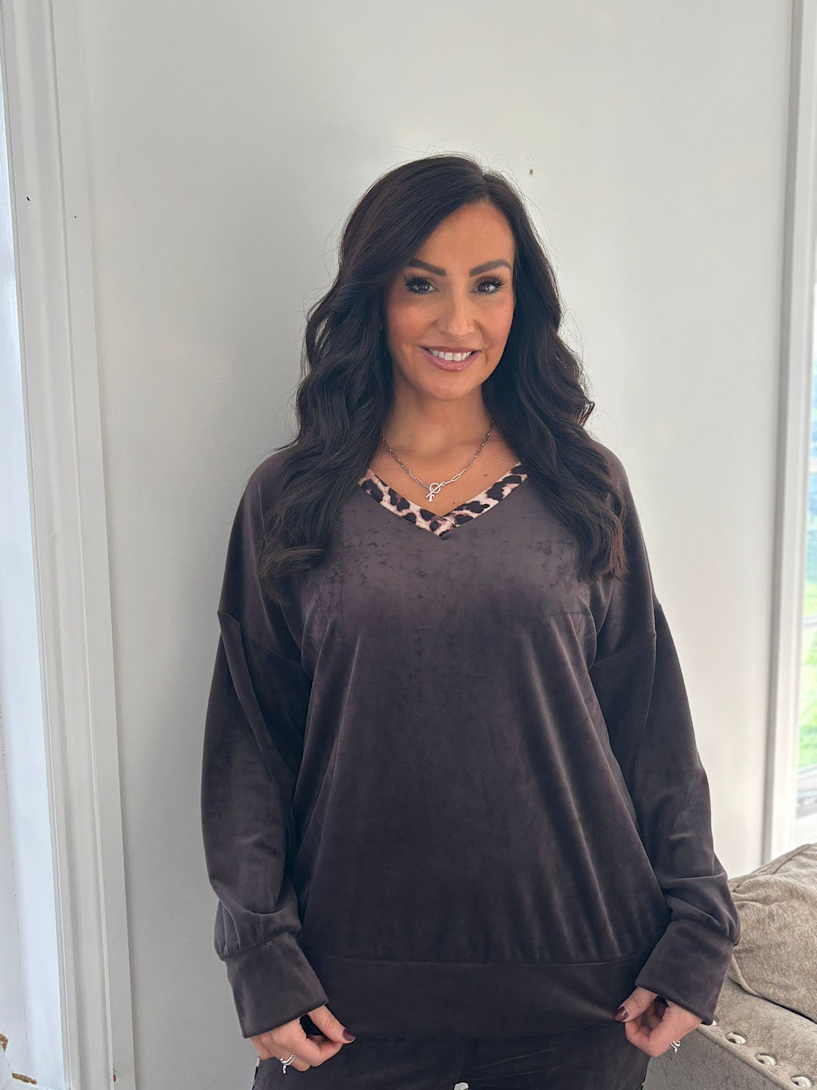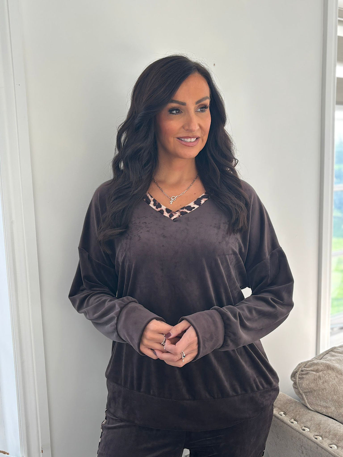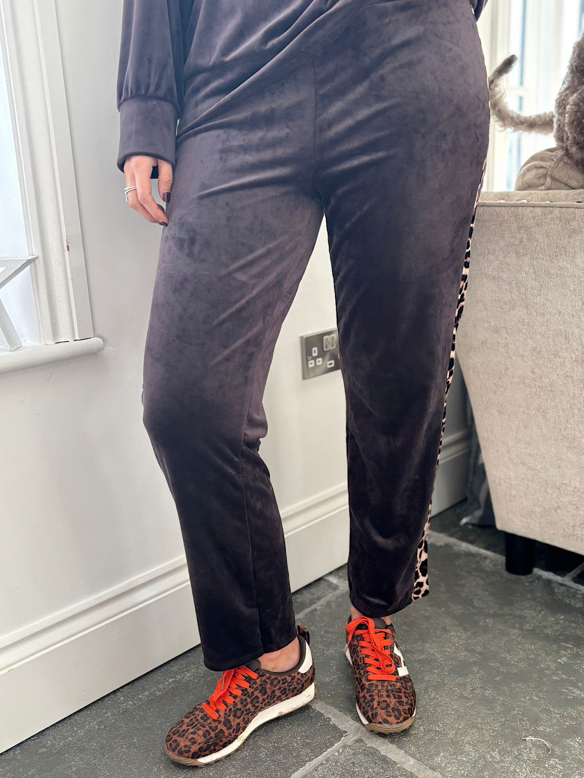 Indulge in ultimate comfort with this Velour Leisure Set, crafted from luxuriously soft fabric that feels wonderful against your skin. The relaxed silhouette offers effortless style, while the distinctive leopard trim detail adds a touch of playful sophistication. Perfect for lounging at home or stepping out in style, this set combines cosy elegance with contemporary flair.