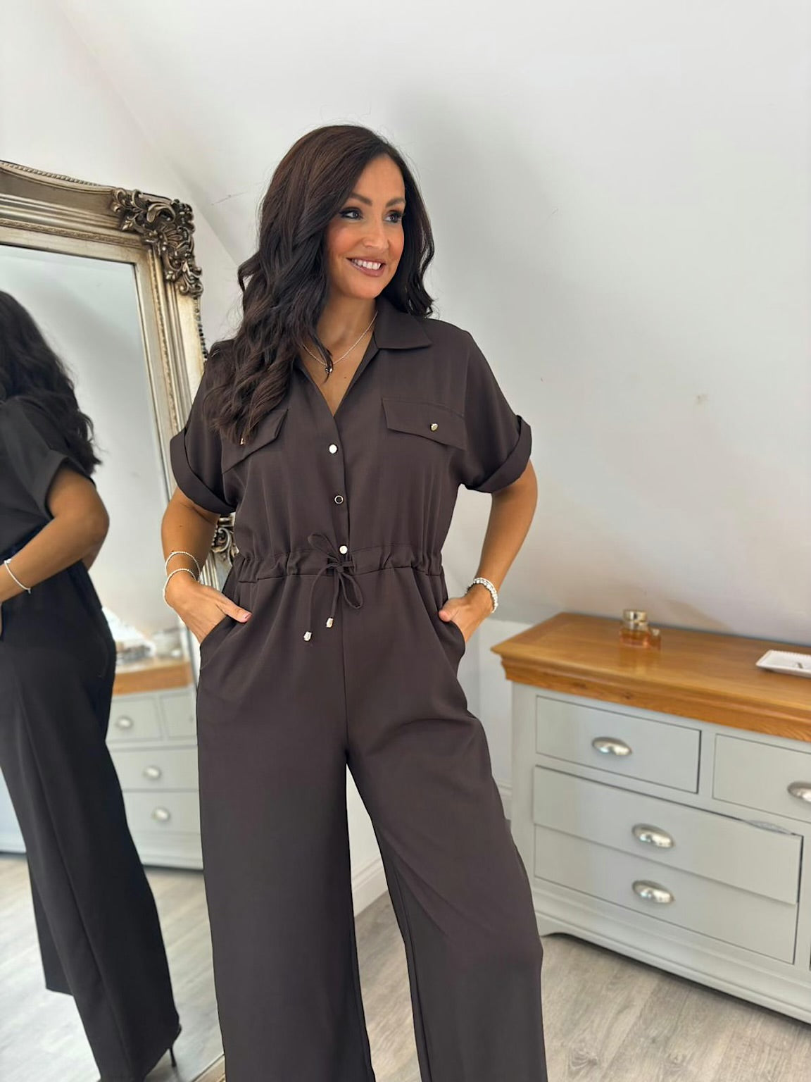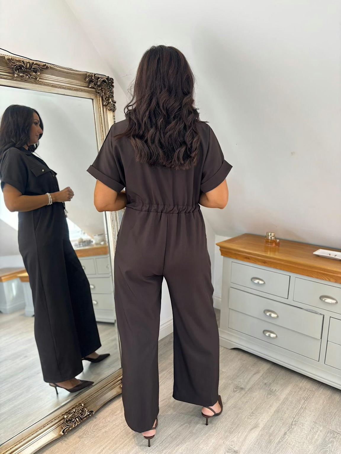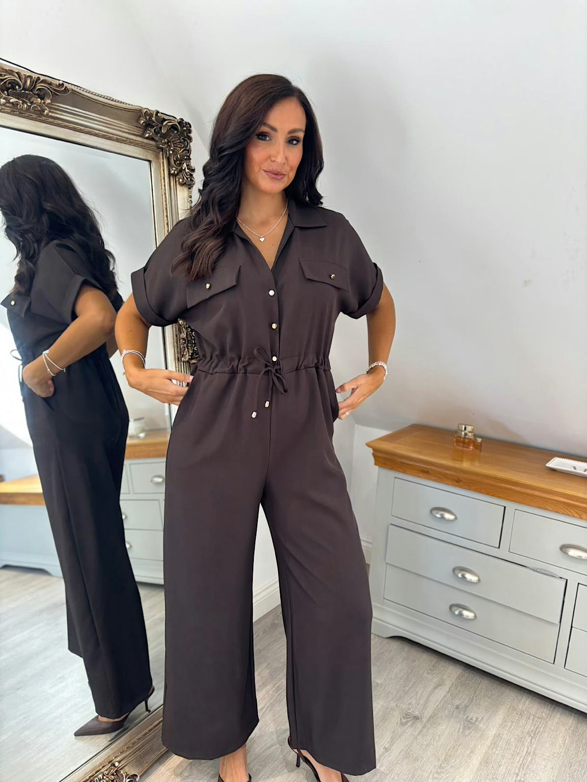 Chocolate Wide Leg Collared Jumpsuit Carrie