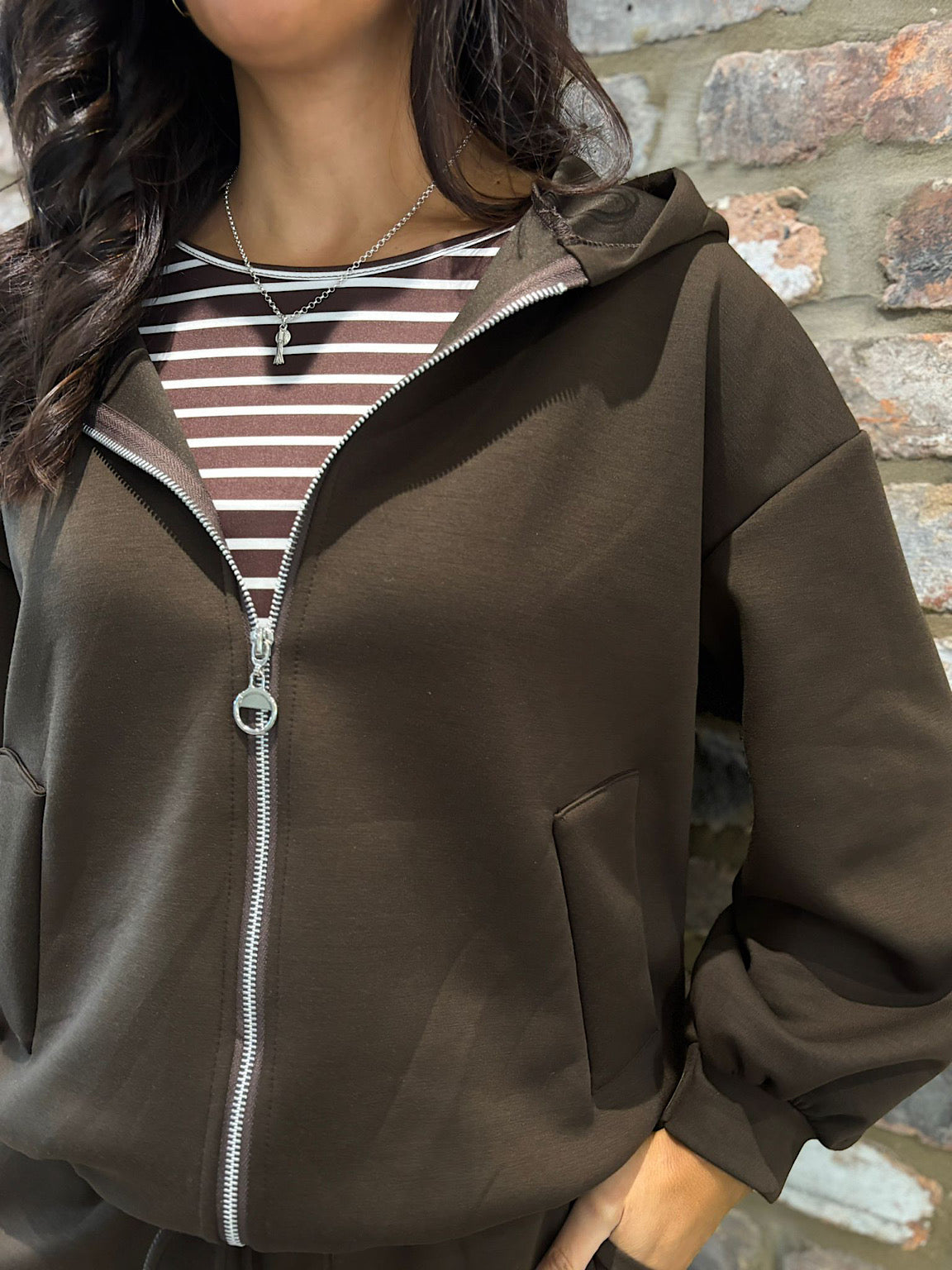 Styled with..........> Chocolate Wide Leg Jogger Alice / Chocolate Striped Super Soft Round Neck