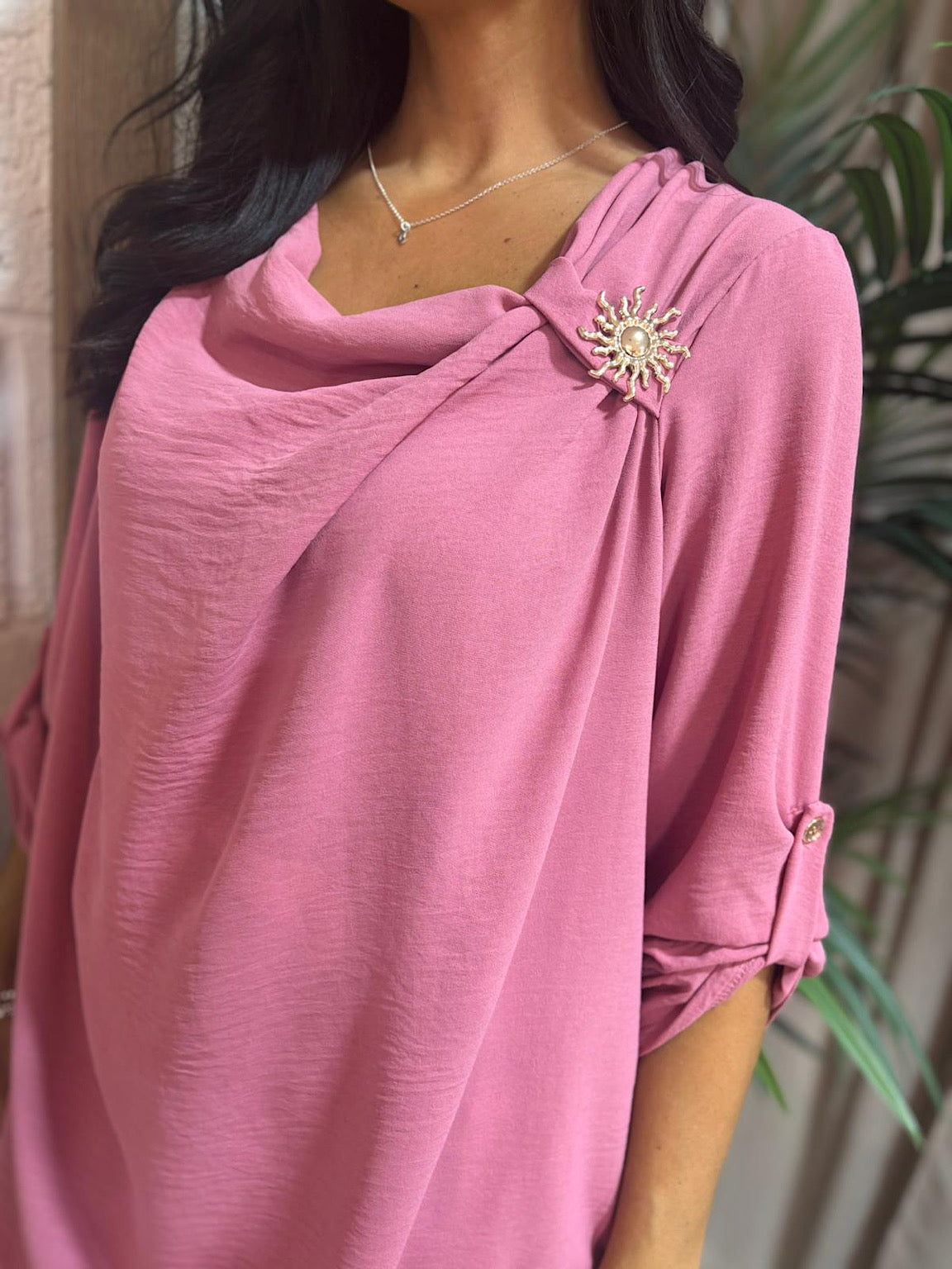Elevate your wardrobe with this sophisticated Gathered Cowl Neck Top Harper. Crafted from luxurious crepe, this lightweight piece drapes beautifully with an elegant cowl neckline gathered at the side. The standout detachable gold brooch adds a touch of glamour and versatility—wear it fastened for a polished look or remove it for understated elegance. Perfect for both professional settings and special occasions, this top combines timeless style with modern practicality.