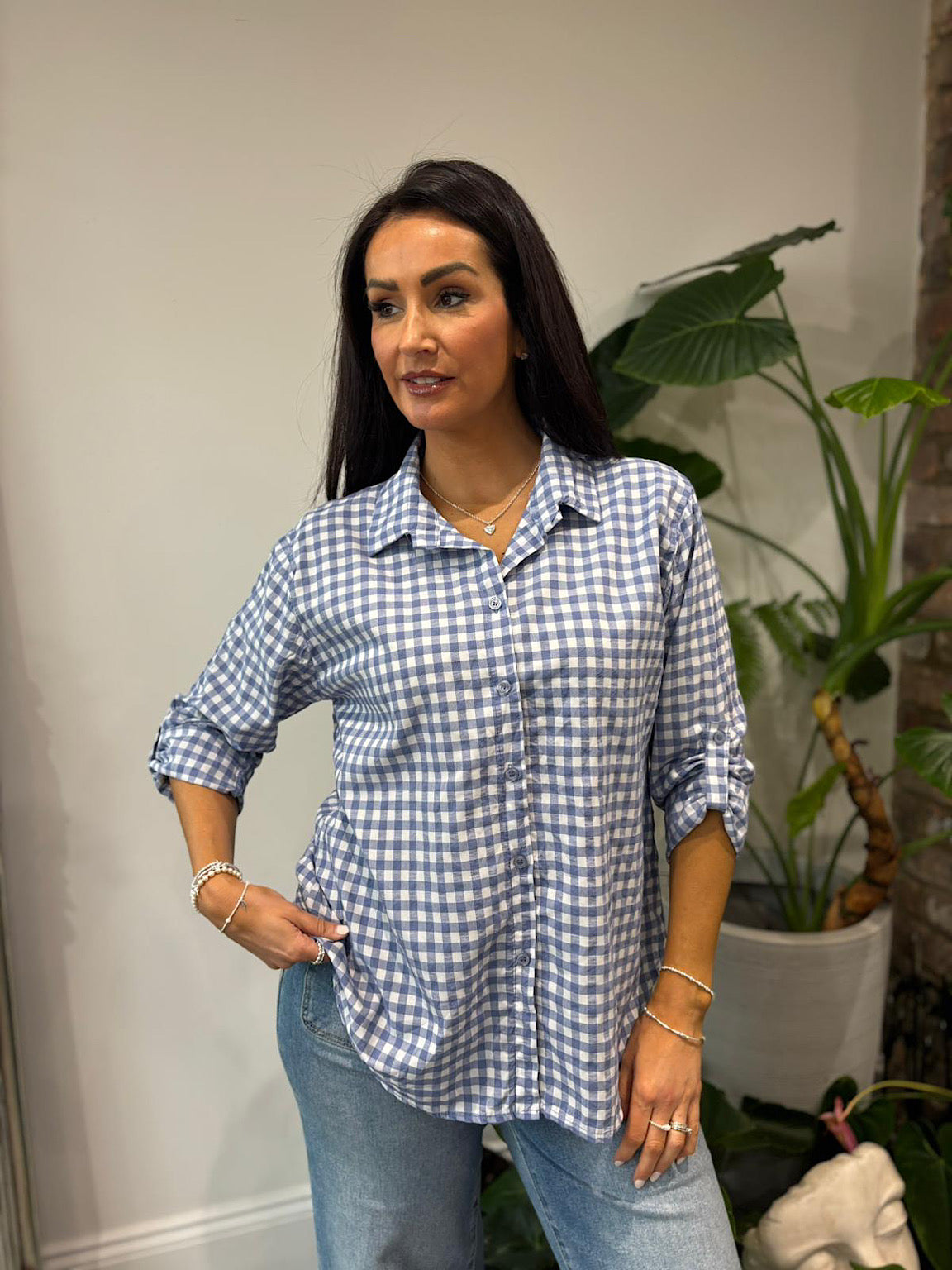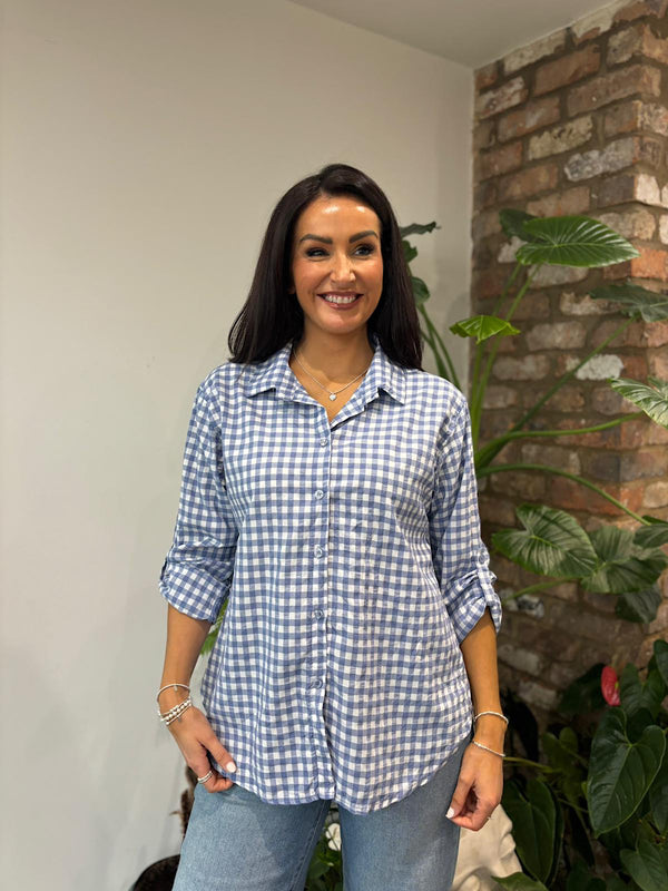 Denim Button Sleeve Gingham Blouse Opal
