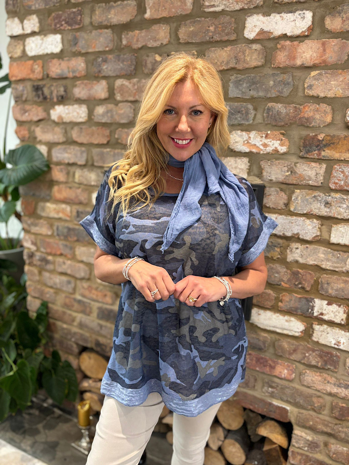 Introducing the Camo Scarf Top Penny – a statement piece that brings edge and versatility to your wardrobe. This standout top features an eye-catching camo print design paired with delicate sequin embellishments along the sleeve and hem for added sparkle. The removeable scarf offers styling flexibility, letting you switch up your look effortlessly. Perfect for those who love bold patterns with a touch of glamour, this top transforms from casual to dressed-up in seconds. Make it your go-to for turning heads wherever you go.