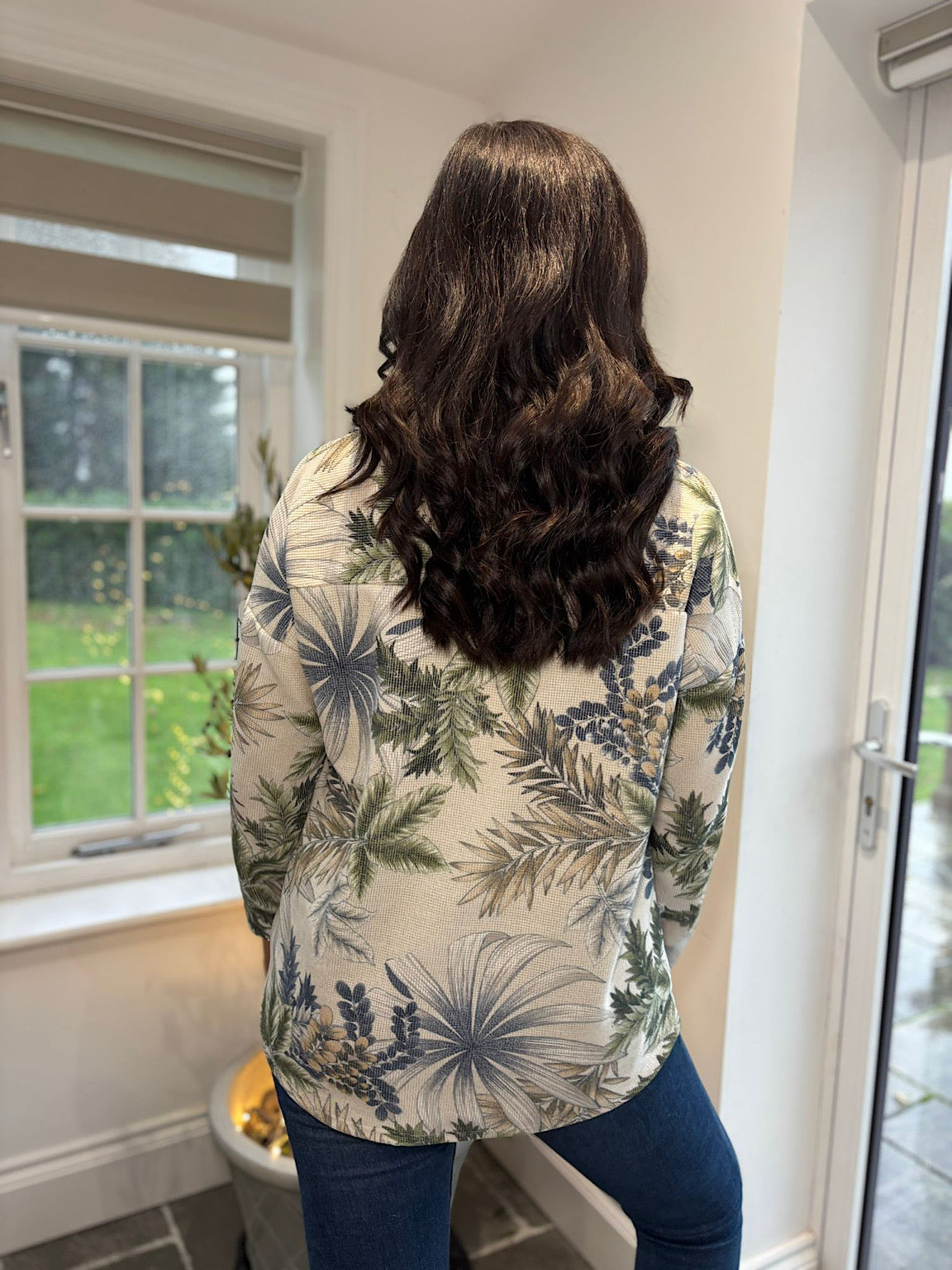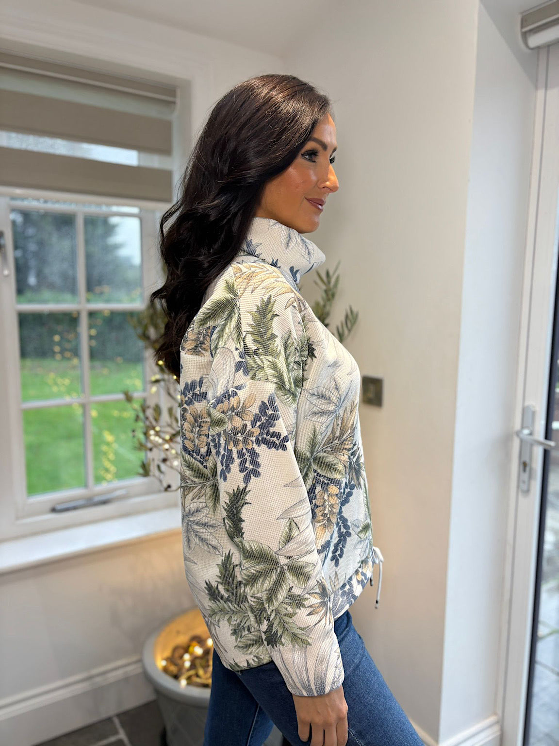 This Stone Leaf Print Roll Neck Sweatshirt Kim is perfect for staying cosy and stylish with its roll neck and drawstring on the bottom. Add a touch of nature to your wardrobe with its beautiful leaf print. Stay fashion-forward and comfortable with this sweatshirt.